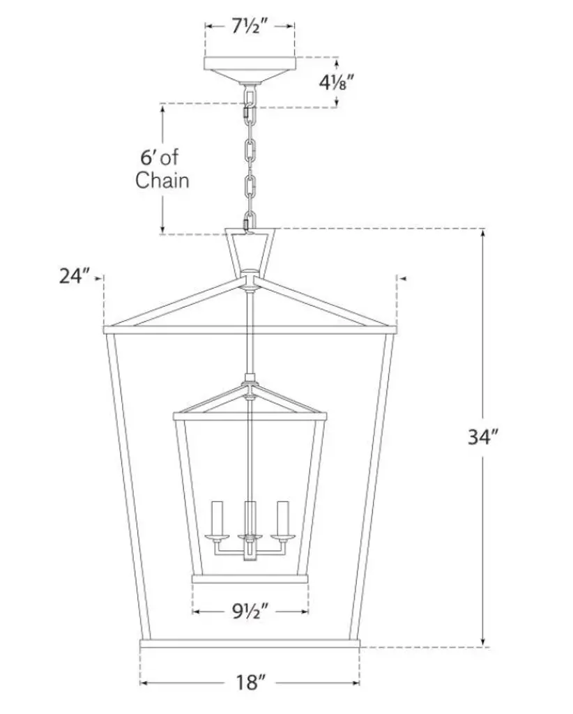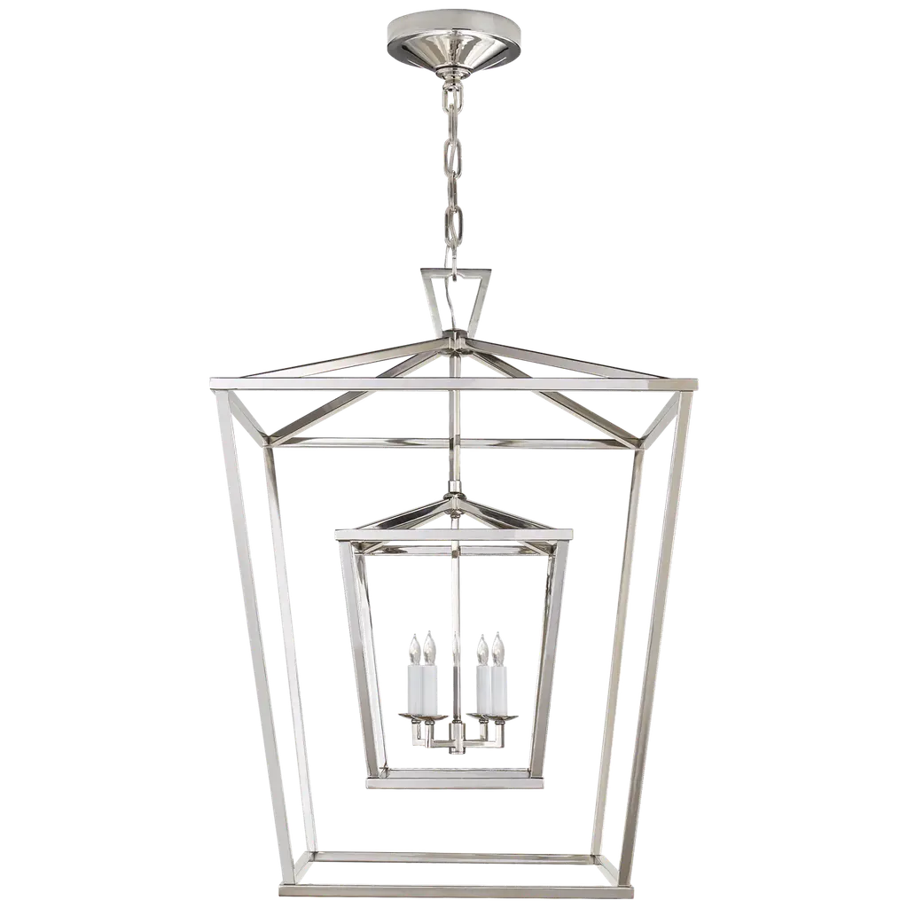 Darlana Large Double Cage Lantern in Polished Nickel Designer: Chapman & Myers Canopy: 7.5" Round Mounting: Chain Shade Detail: No Option Socket: 4 - E12 Candelabra Wattage: 4 - 40 C11 Safety Rating Location: DAMP