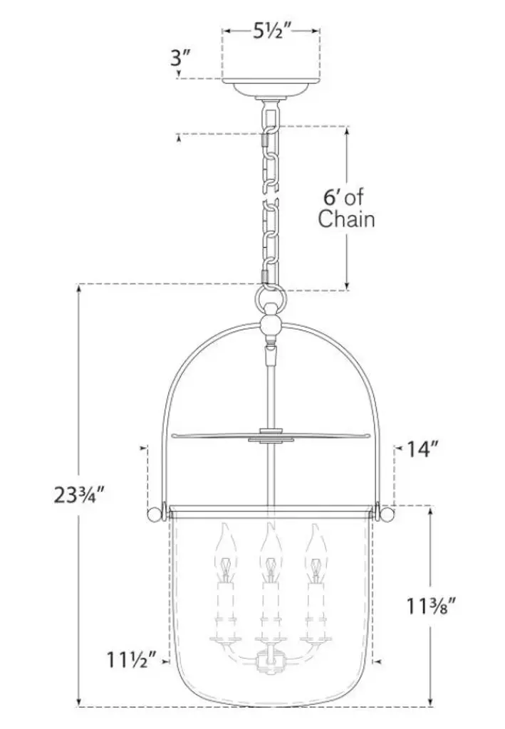 Lorford Small Smoke Bell Lantern in Gilded Iron with Antiqued Mercury Glass Designer: Chapman & Myers Fixture Height: 23.75" Canopy: 5.5" Round Mounting: Chain Shade Detail: Mercury Glass Socket: 4 - E12 Candelabra Wattage: 4 - 60 C11 Safety Rating Location: DAMP