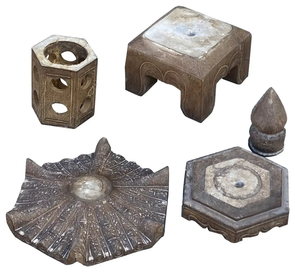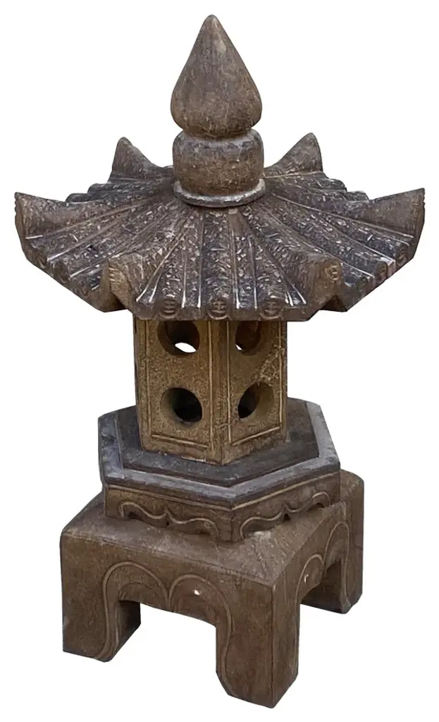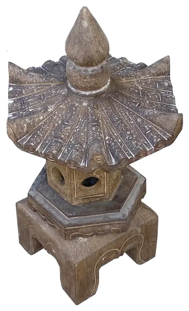 This is a set of gray-brown stone hexagon pagoda shape garden decor lantern lamp with a tower top. (a combination of 5 pieces ) Dimension: Dia 16" x h27"Origin: ChinaMaterial: StoneCondition: Natural stone marks, may have chip marks at the legs, white marks can be cleanedUSA domestic continental buyers of 48 states pay $265 shipping (buyers of Hawaii, Alaska, US Islands, Florida Keywest, and Canada pays the extra shipping cost). Insurance and handling charges are already included in the shipping cost. In store pick up is highly welcomed if you are in San Francisco Bay Area. (No charge)