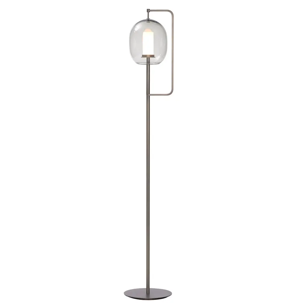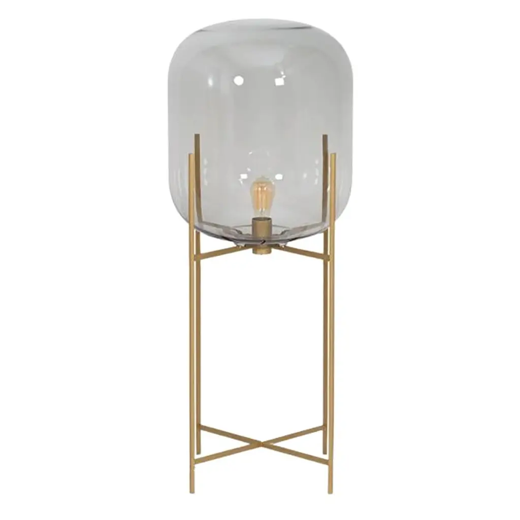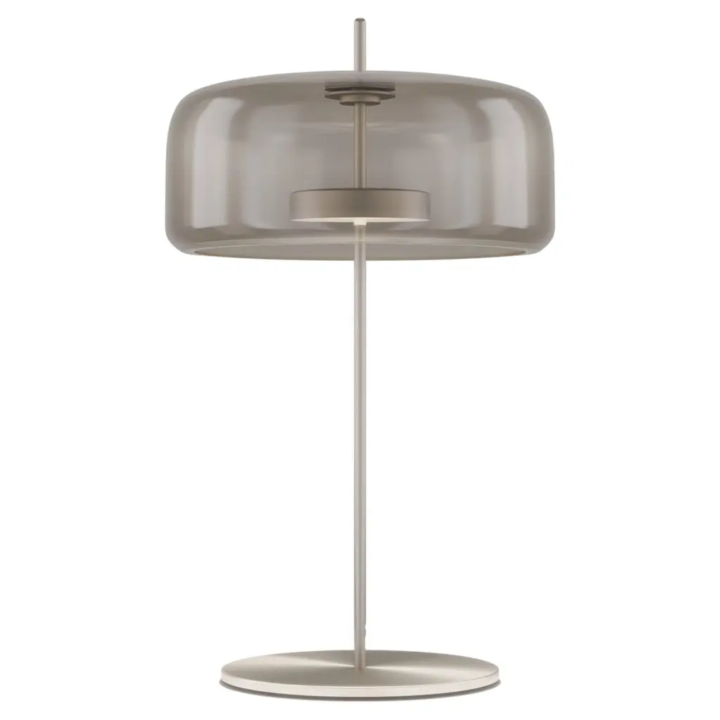 In our everyday existence, light serves us by enhancing everything around it, while it is often neglected itself. Here, the inspiration comes from the quintessential source of light; like its ancient predecessor, the fiery torch, this design simply consists of an upright rod with an illuminated tip. Celebrating the glorious spectacle of light itself, the tinted glass shade is a modest attachment that branches off the main support to gently shield its centrepiece.Table lamp. Frame in brass burnished, with clear varnish. Lamp shade made of hand-blown grey crystal glass. Diffusor opal glass white satin finished. Dimmable. Customized LED light included. Plug-in power supply with interchangeable plugs for Europe, UK, Australia and USA. Felt gliders in black.Dimensions: W 21 cm, H 54 cm.