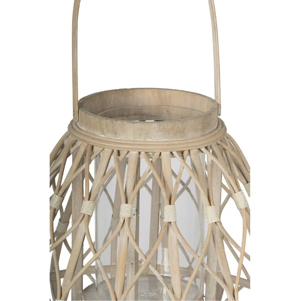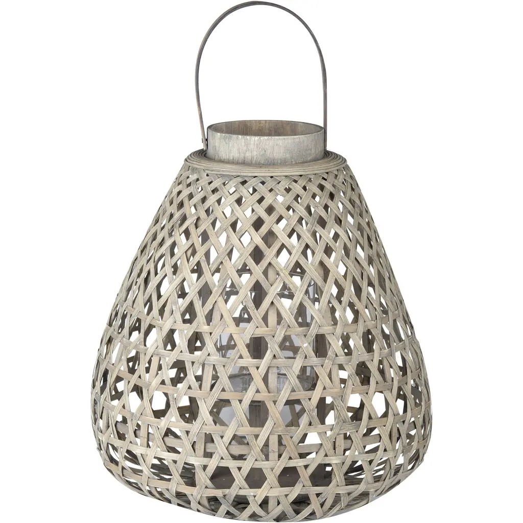 Built from strips of wood woven into a lattice design, the Coconio lantern offers a contemporary take on traditional craftwork. Display sitting on a table, shelf, or as part of a centerpiece arrangement, or use the top handle to hang from a rafter or awning. This piece measures at 17x18 and includes an interior glass Candle Holder.