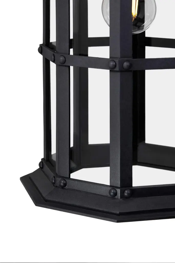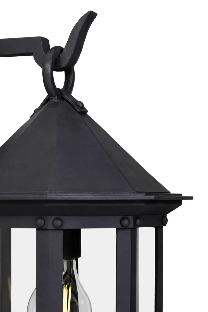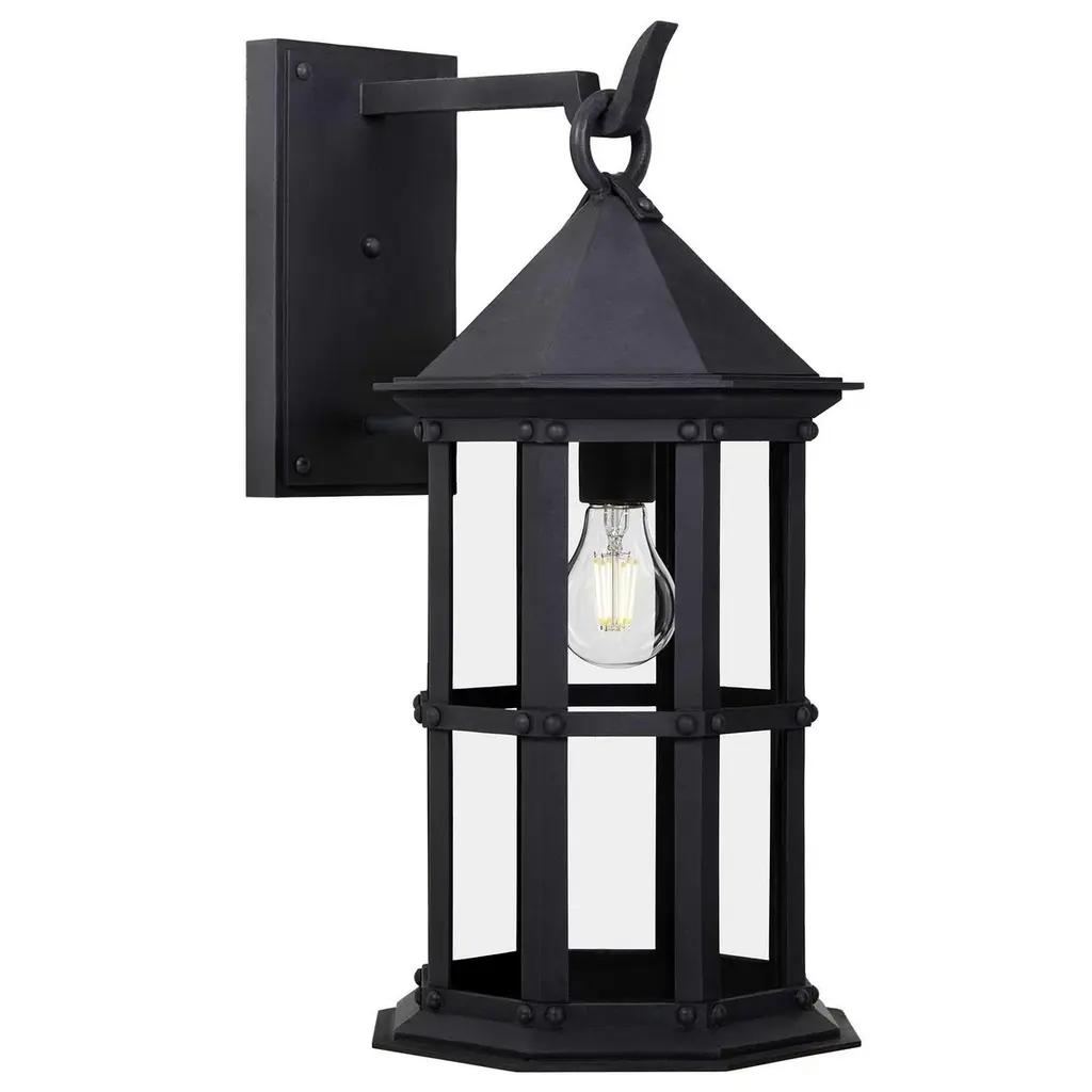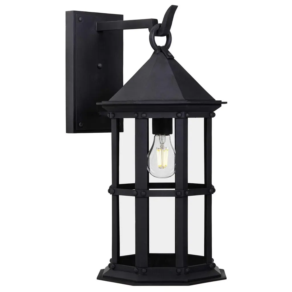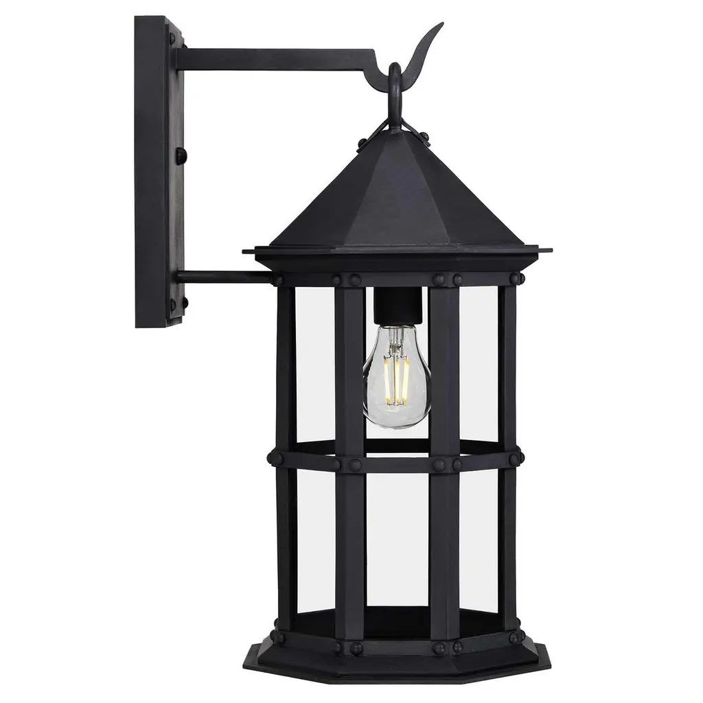 Referencing the historic Arlington Theater in downtown Santa Barbara, California this lantern echoes the Mission Revival style in which the theater was designed. With an eight sided profile, low-pitched lid and solid cage, this lantern conveys subtle strength and security.Backplate Dimensions (inches): 5W x 9HLantern shown in SBLC Grey Finish with SBLC Clear Glass. Hand-forged in heavy gauge wrought iron. All lanterns go through a metalizing process, a protective zinc layer added to ensure protection and durability against corrosion and harsh weather conditions.All lights are handmade and made to order. Dimensions may vary slightly.All lights ship with 5w LED Edison dimmable filament bulb.This lantern will ship within 8-10 weeks. Larger orders may have longer lead times. As with any handcrafted product, slight discrepancies are inherent in the art of forged iron, and even considered desirable as they indicate our old-world craftsmanship. Natural variations in tone, texture, and color may occur as our finishes are hand painted.