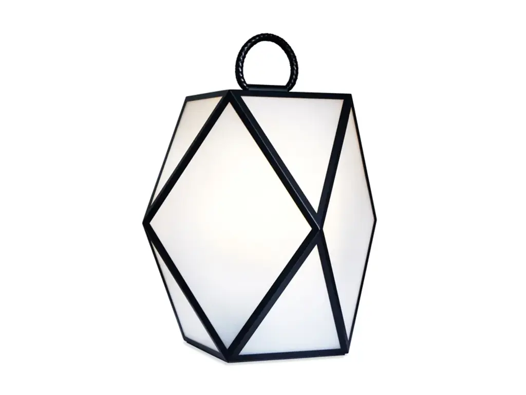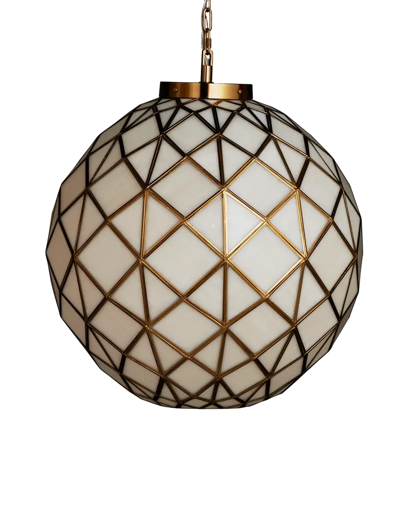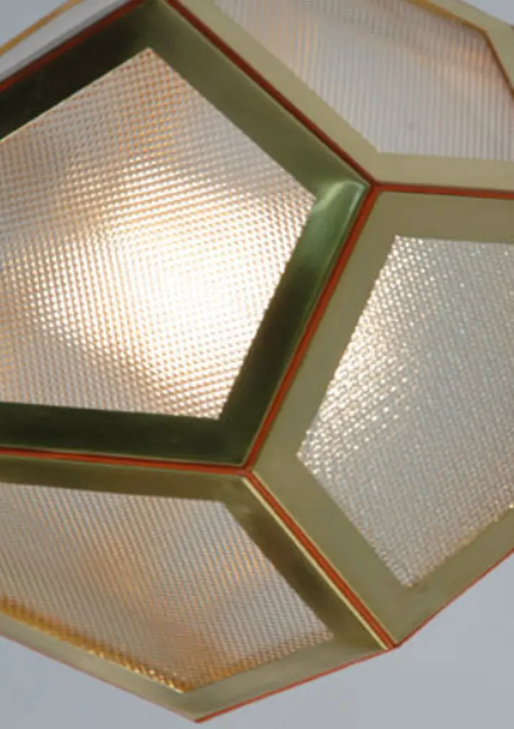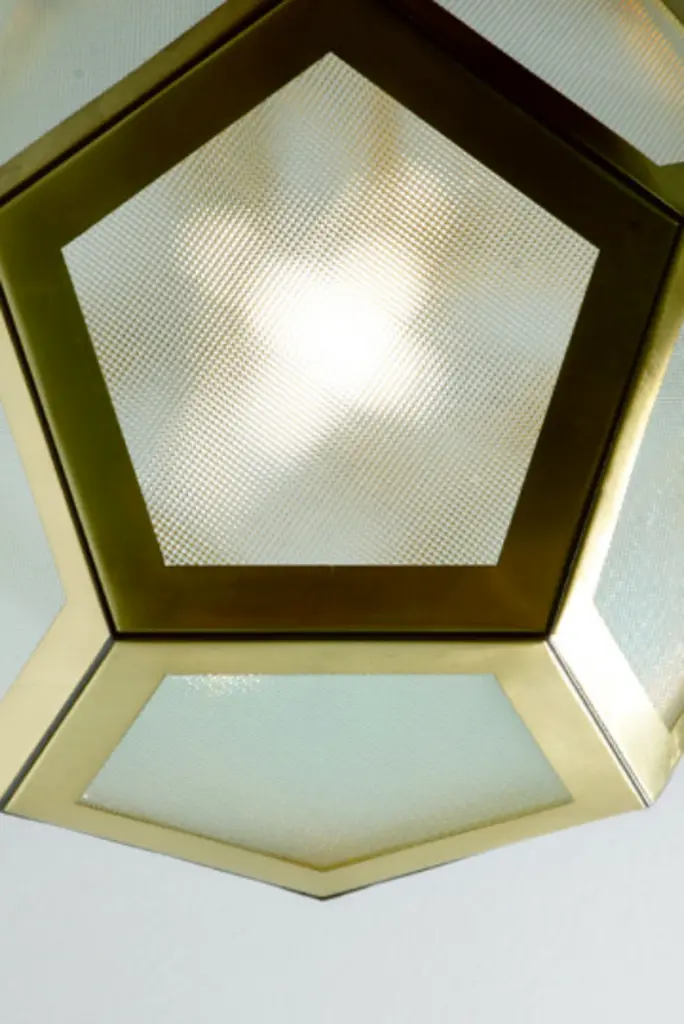 The large ‘Pentagon’ brass and industrial glass lantern. Choice of black or saddle leather for the joints between the brass panes. Hexagonal brass rod and matching brass canopy included. Wired with UL listed parts.