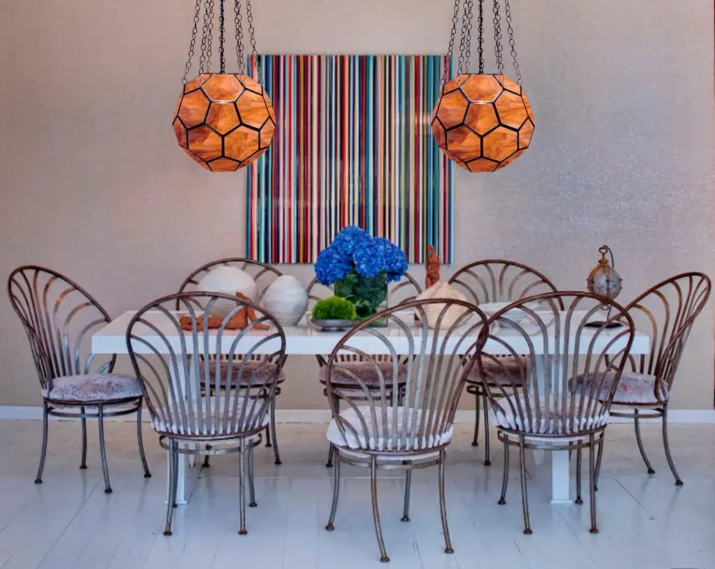 Hand made Pewter frame with artisanal hand made glass; Hand painted finish. DIMENSIONS ; 18"dia x 18"h VOLTAGE/LAMP ; 120V / 1 porcelain socket 60-watt globe bulb max CHAINS ; 36" standard length chain with pentagonal canopy +++ CUSTOM SIZES AVAILABLE +++