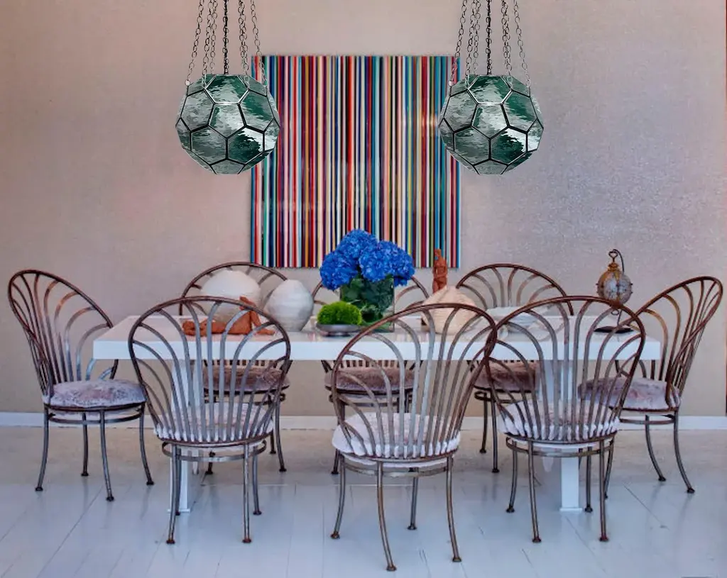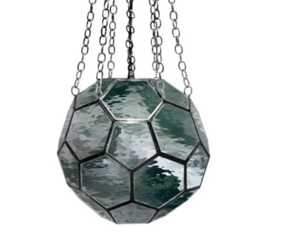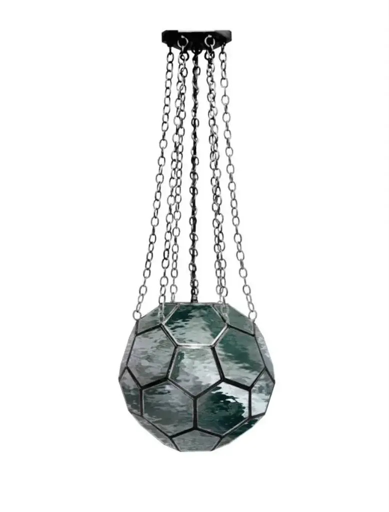 Hand made Pewter frame with artisanal hand made glass; Hand painted finish. DIMENSIONS ; 18"dia x 18"h VOLTAGE/LAMP ; 120V / 1 porcelain socket 60-watt globe bulb max CHAINS ; 36" standard length chain with pentagonal canopy +++ CUSTOM SIZES AVAILABLE +++