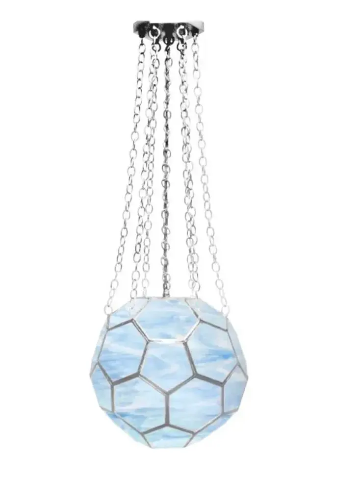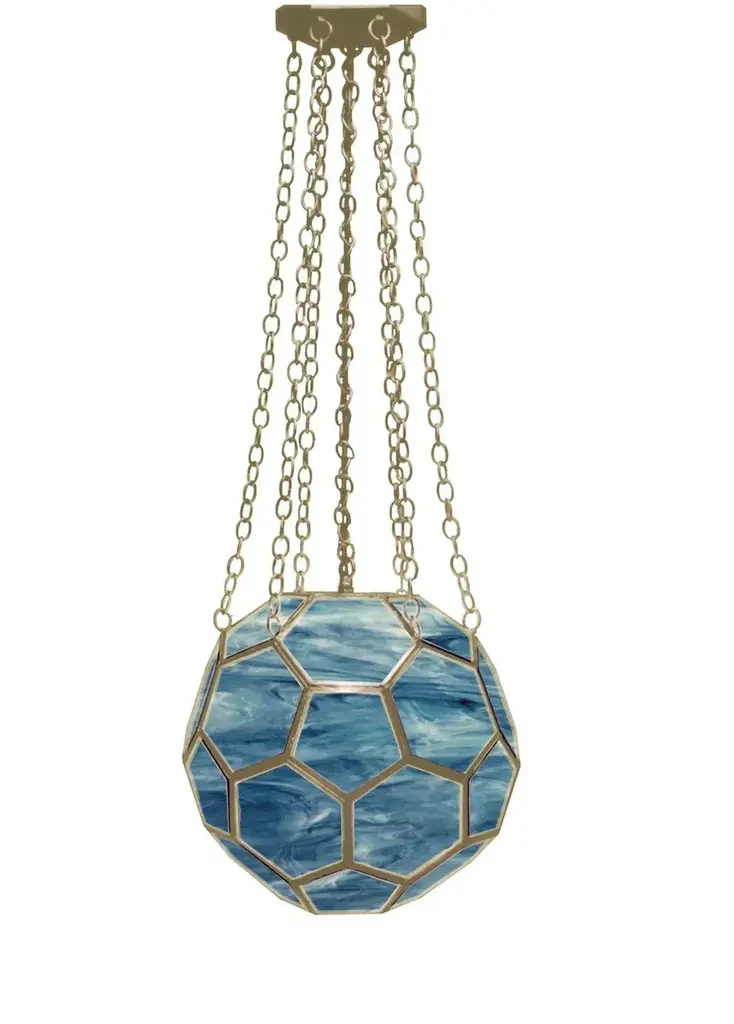Hand made Pewter frame with artisanal hand made glass; Hand painted finish. DIMENSIONS ; 18"dia x 18"h VOLTAGE/LAMP ; 120V / 1 porcelain socket 60-watt globe bulb max CHAINS ; 36" standard length chain with pentagonal canopy +++ CUSTOM SIZES AVAILABLE +++