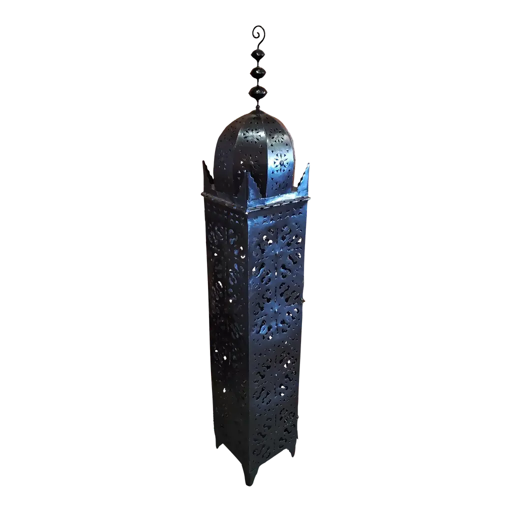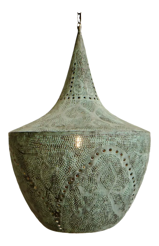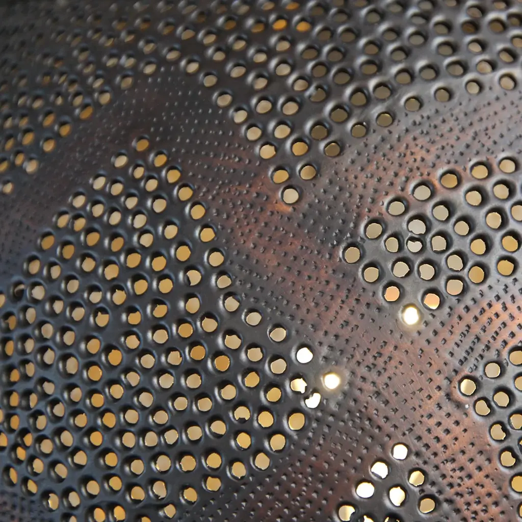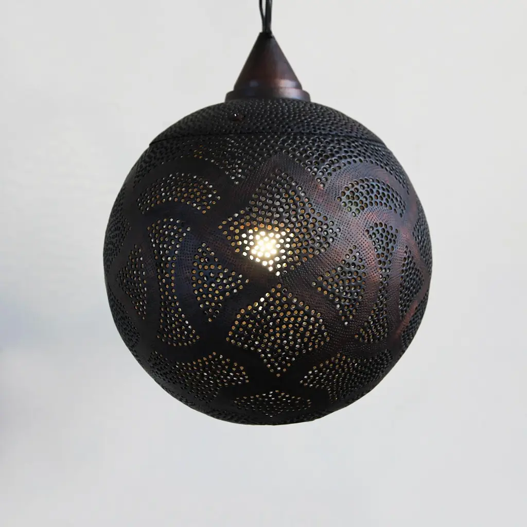Antiqued copper globe lantern with perforated moorish design patterns that shine beautiful patterns onto walls and ceiling. Each is slightly unique. Includes 3’ hanging chain and black ceiling plate. 100 watt max fixture. Bulb not included.
