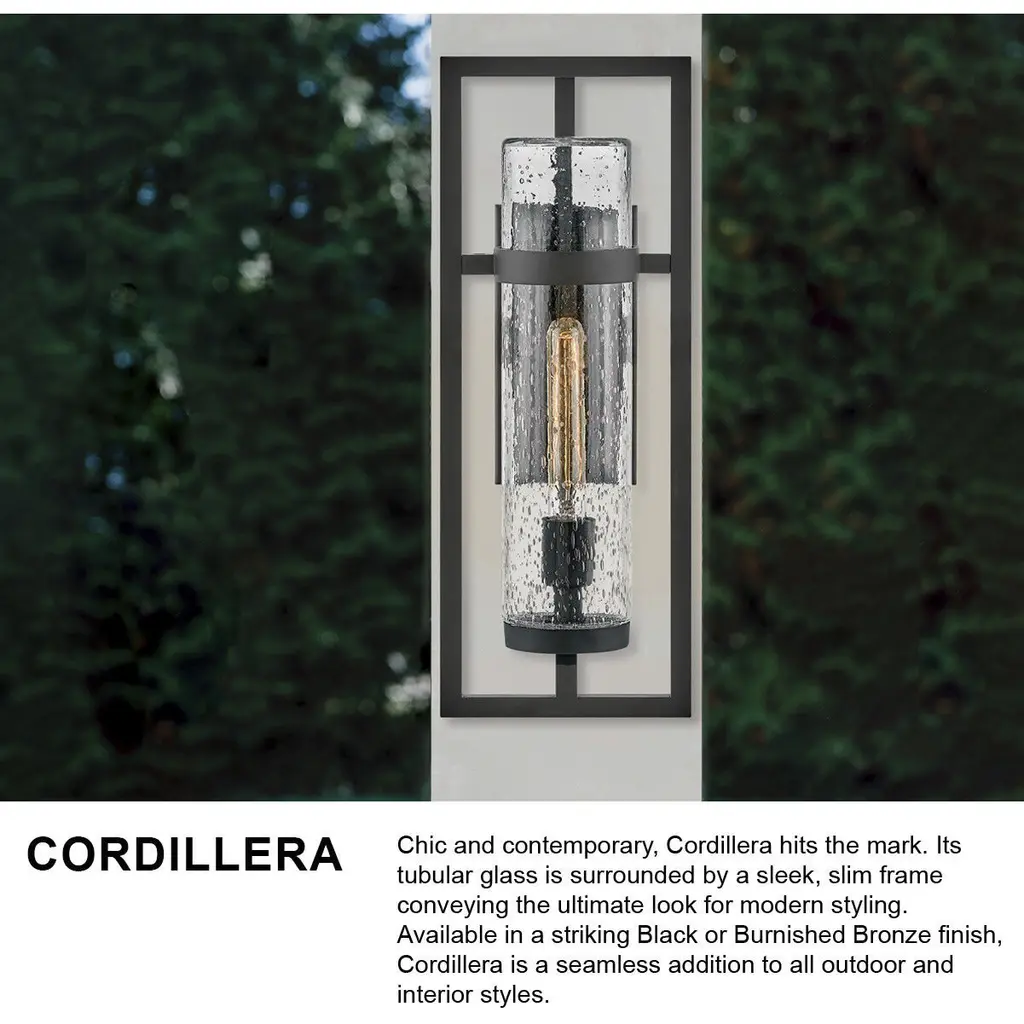 Chic and contemporary, Cordillera hits the mark. Its tubular glass is surrounded by a sleek, slim frame conveying the ultimate look for modern styling. Available in a striking Black or Burnished Bronze finish, Cordillera is a seamless addition to all outdoor and interior styles. Vintage style filaments recommended to complete the statement look.