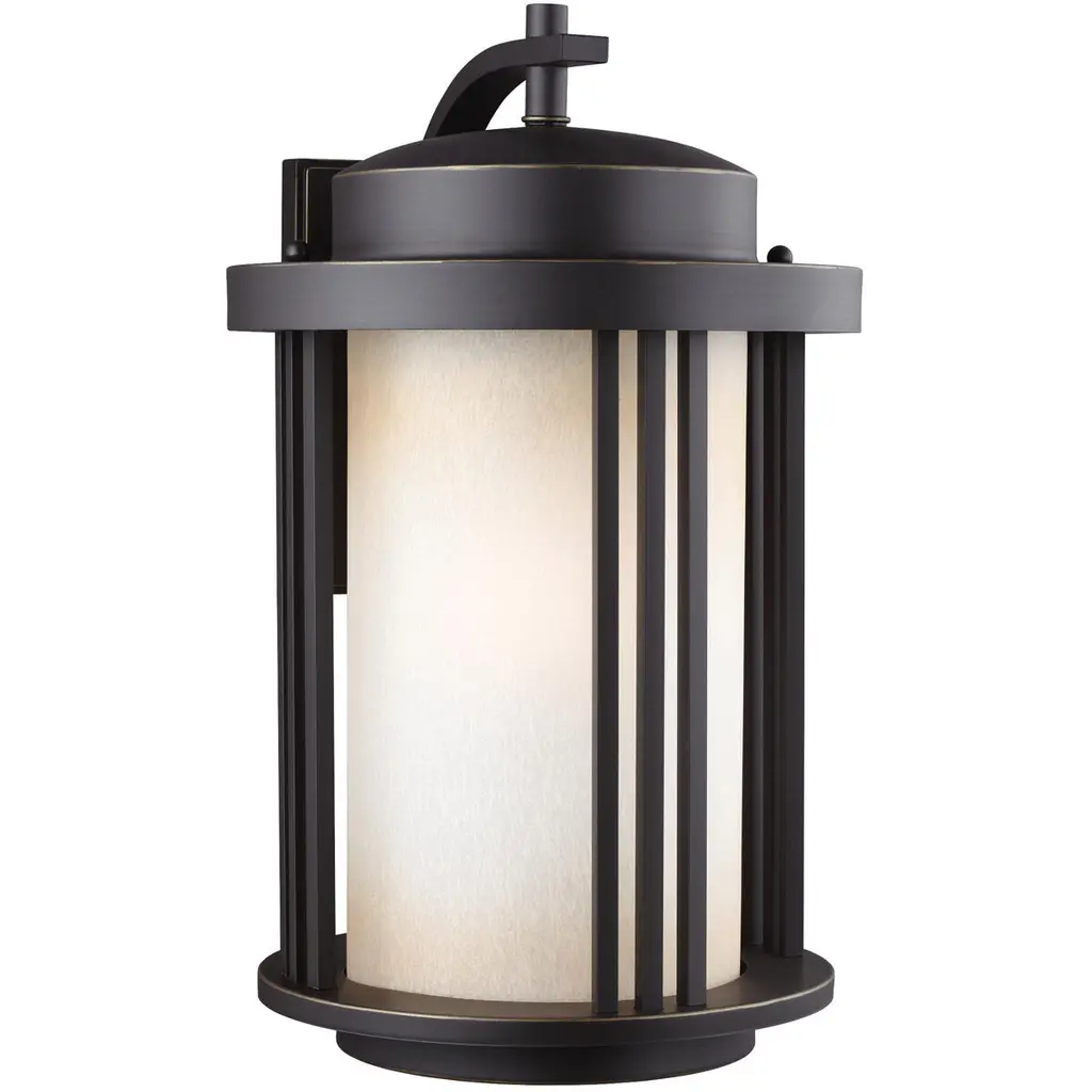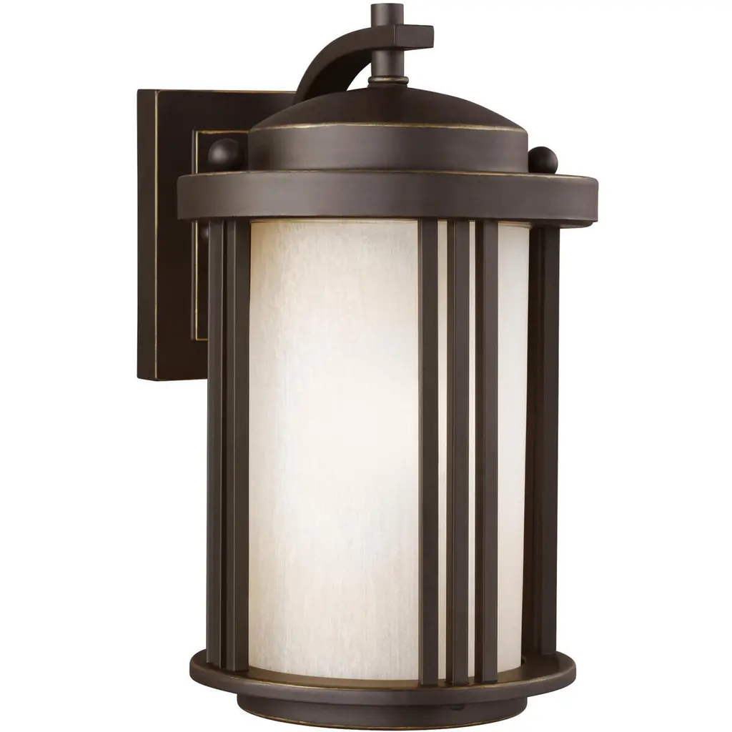 The Crowell one light outdoor wall fixture in antique bronze is an ENERGY STAR½ qualified lighting fixture that uses LED bulbs to save you both time and money. The transitional Crowell outdoor lighting collection by conveys Art Deco influences with its linear, vertical details and clean, overall design. Their large scale gives these light fixtures real presence without competing with the residential architecture they adorn. The lighting collection, offered in Antique Bronze finish with Creme Parchment glass or Black finish with Satin Etched glass, offers a one-light outdoor pendant, a two-light outdoor ceiling flush mount, a one-light outdoor post lantern, and small, medium and large one-light outdoor wall lanterns also available in Dark Sky versions. Incandescent, integrated LED and ENERGY STAR-qualified LED lamping are available. The advanced, integrated LED option has warm-on-dim technology that warms in color when dimmed, going from 2700K to 2200K and is California Title 24 compliant.