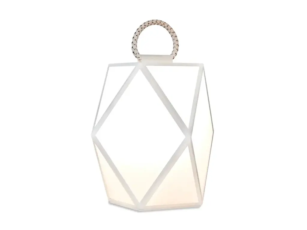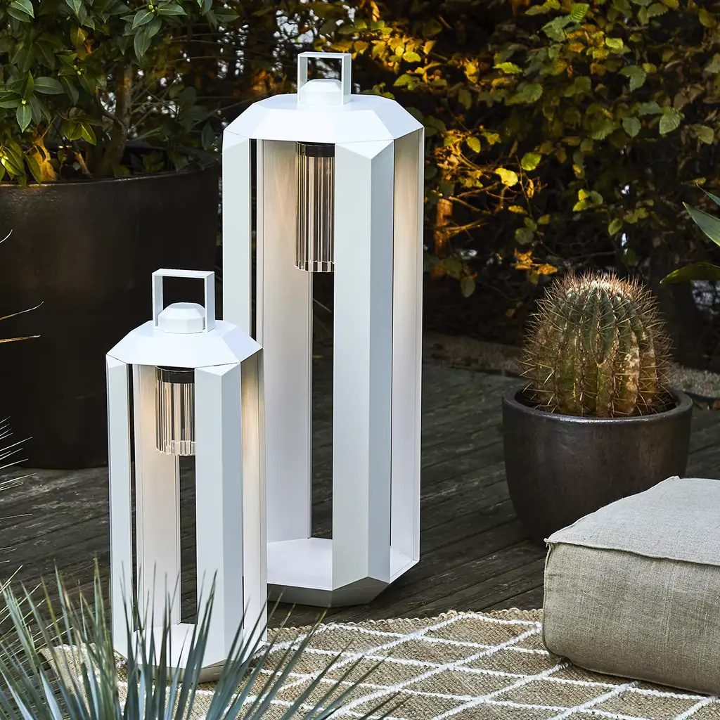 A singular and creative way of adorning an outdoor living area, this exquisite lantern-shaped fixture exudes a distinctive contemporary flair. Boasting a total-white look, it features a geometrical frame enclosing a ribbed clear Plexiglas shade. Please inquire with the Concierge for further information on materials and finishes.