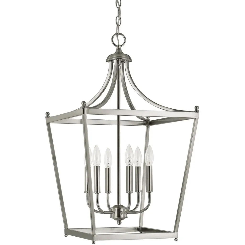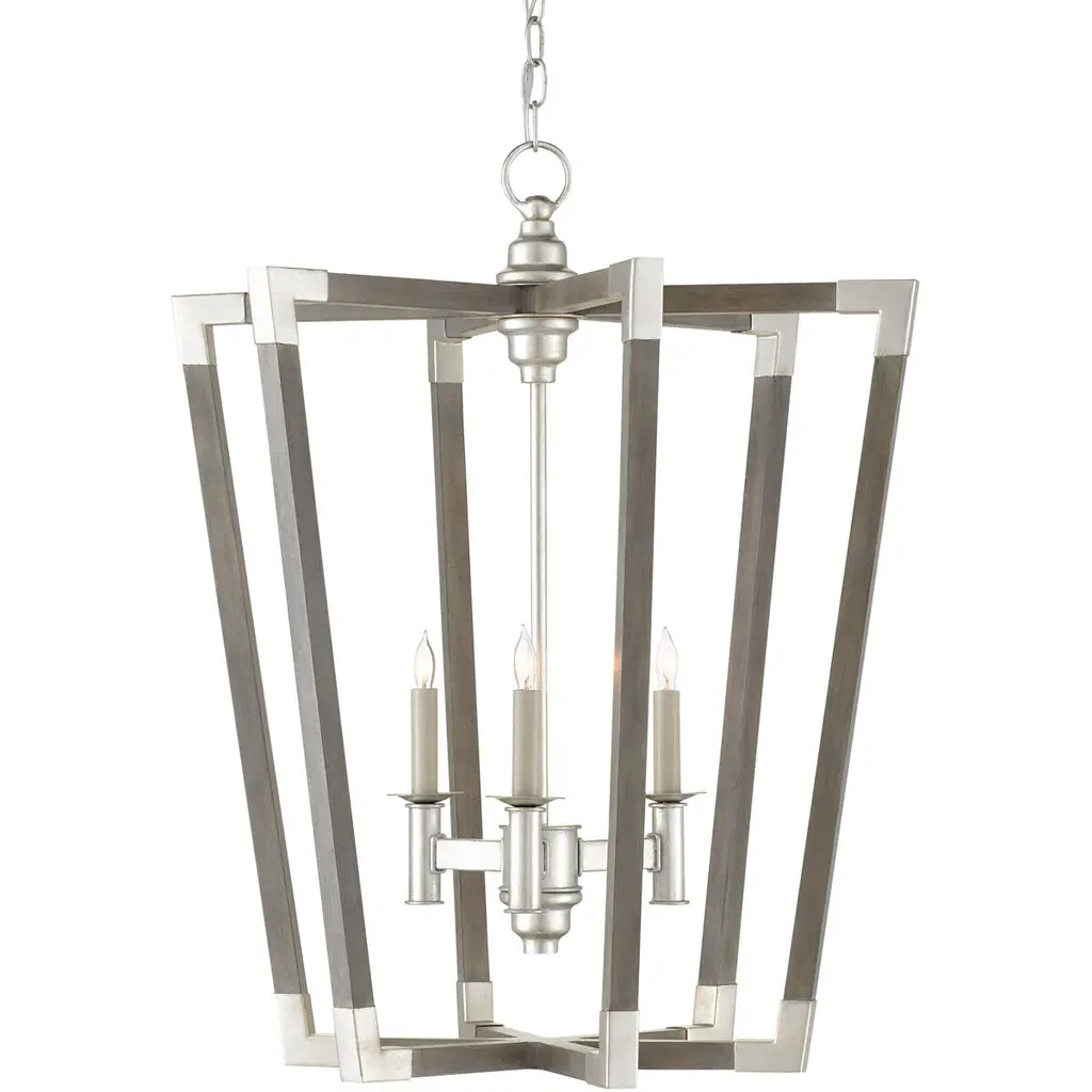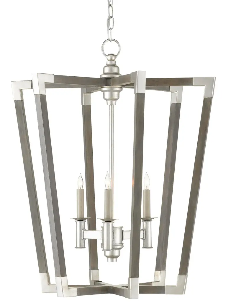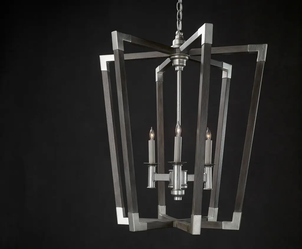 The Arts & Crafts movement inspired the design of the Bastian Small Gray Chandelier, which is made of wrought iron and wood in chateau gray and contemporary silver leaf finishes. The crisp feel of the silver metal clasping the spokes of wood brings extra sophistication to this lantern-shaped chandelier. There are a number of designs in this family of fixtures. Wipe with a lint-free clean cloth.