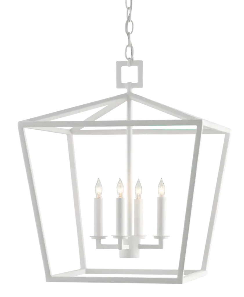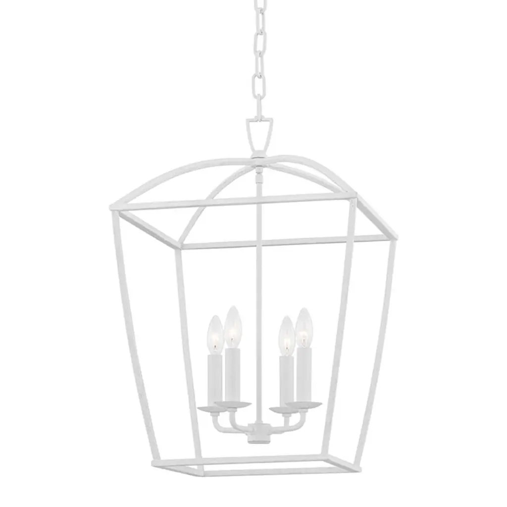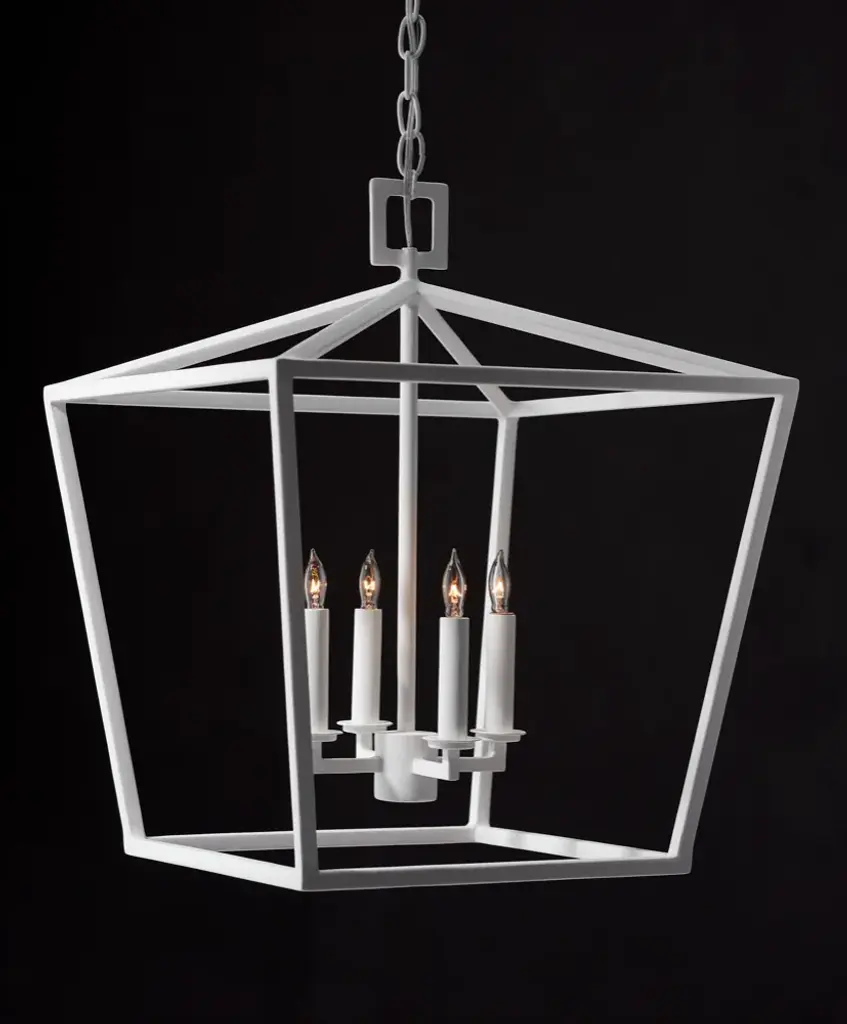 The Denison Medium White Lantern is a hammered wrought-iron fixture in a gesso white finish. This classic lantern shape has stood the test of time to make it one of our most popular offerings. A design element of note is the square that fastens the lantern to the chain. This white lantern is one of a number of sizes and finishes in the Denison family. Adjustable: Yes Adjustable Height Minimum: 28.5 Adjustable Height Maximum: 96.5 Canopy Diameter: 6 Convertible to Semi-Flush Mount: No Chain Length - feet: 6 Chain Finish: Painted Gesso White Lights: 4 Maximum Watts per Socket: 60 Socket Type: E12 Care Instructions: Wipe with clean cloth