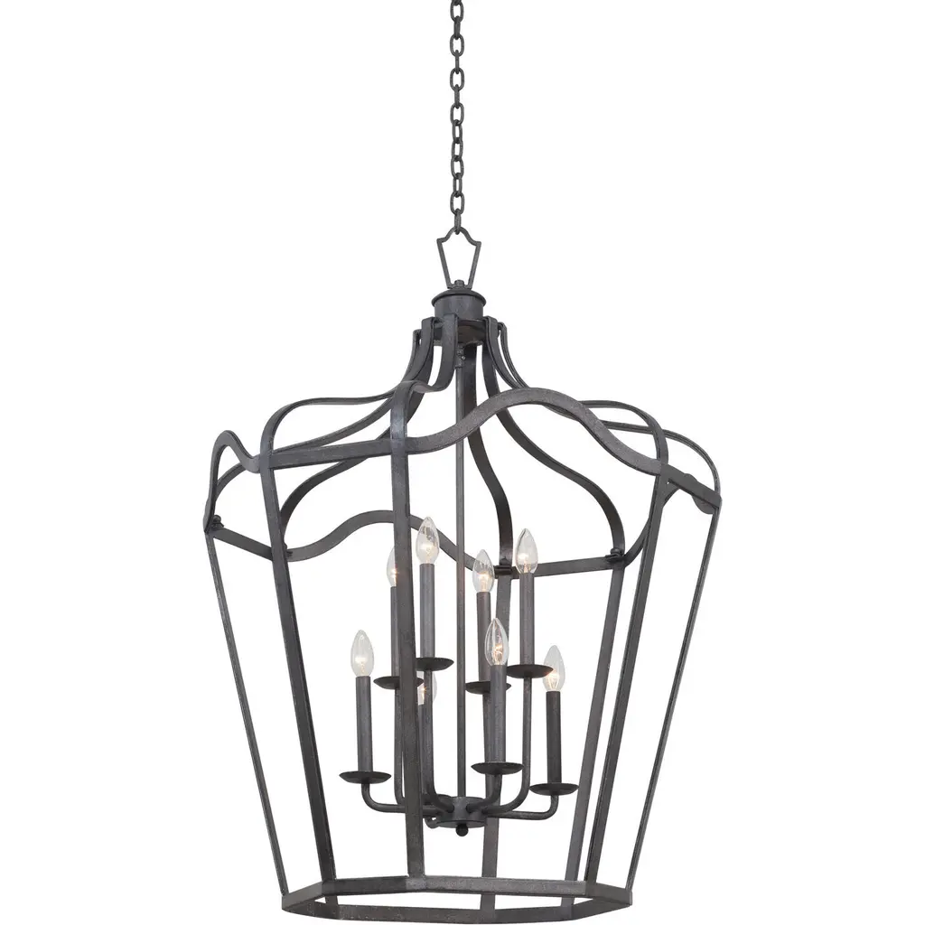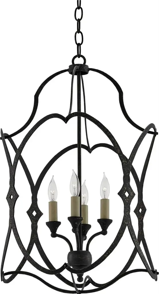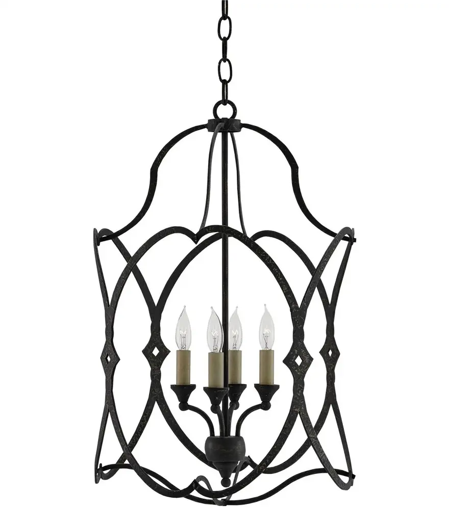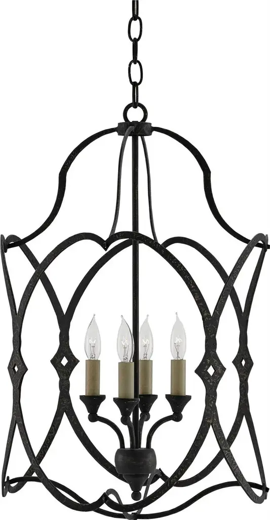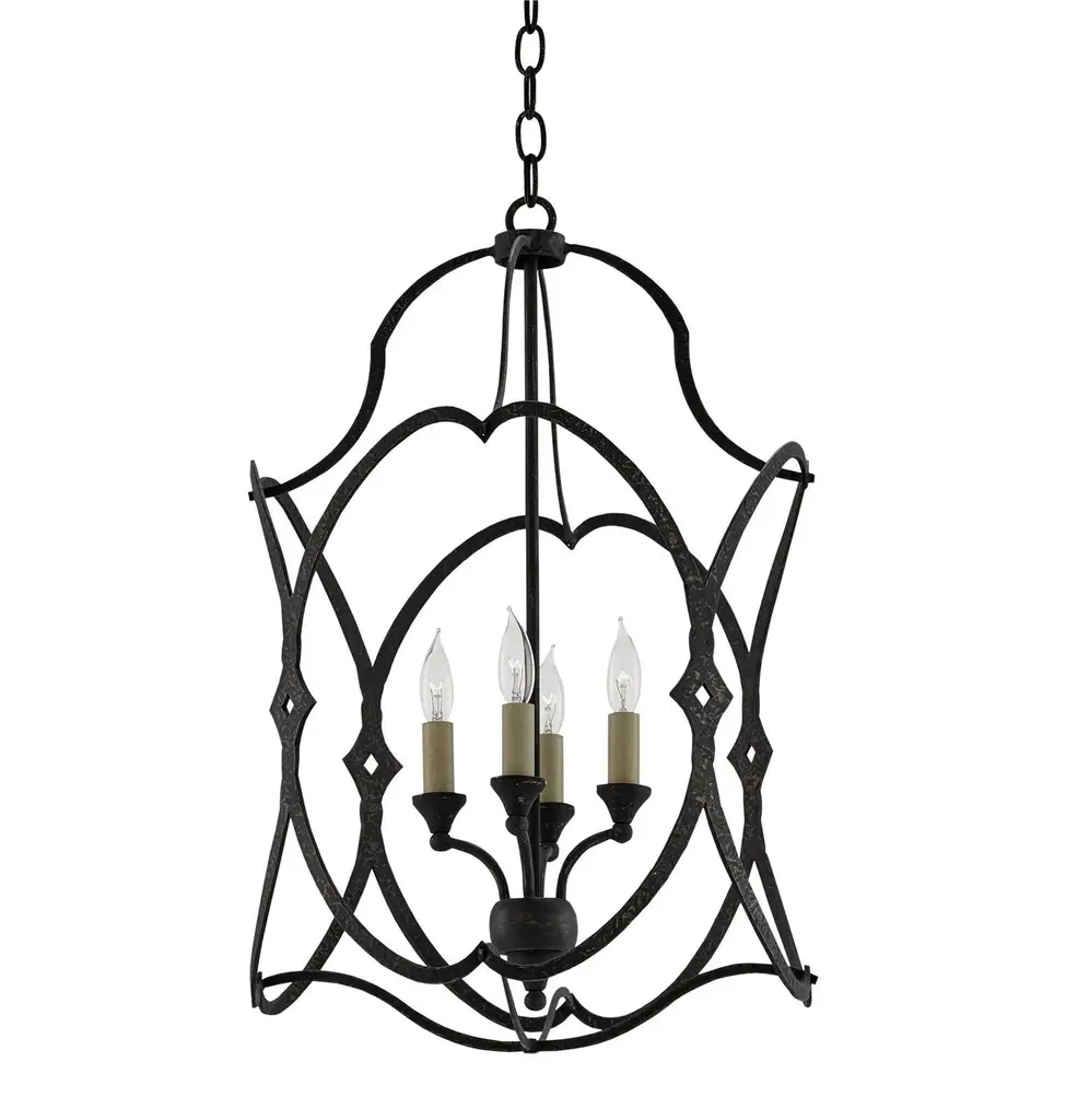 Currey & Company Modern Colonial Charisma Lantern Overall measurements (inches) 25H x 16W x 16D. Overall Condition is New. Material(s): Wrought Iron. Dates to circa New.