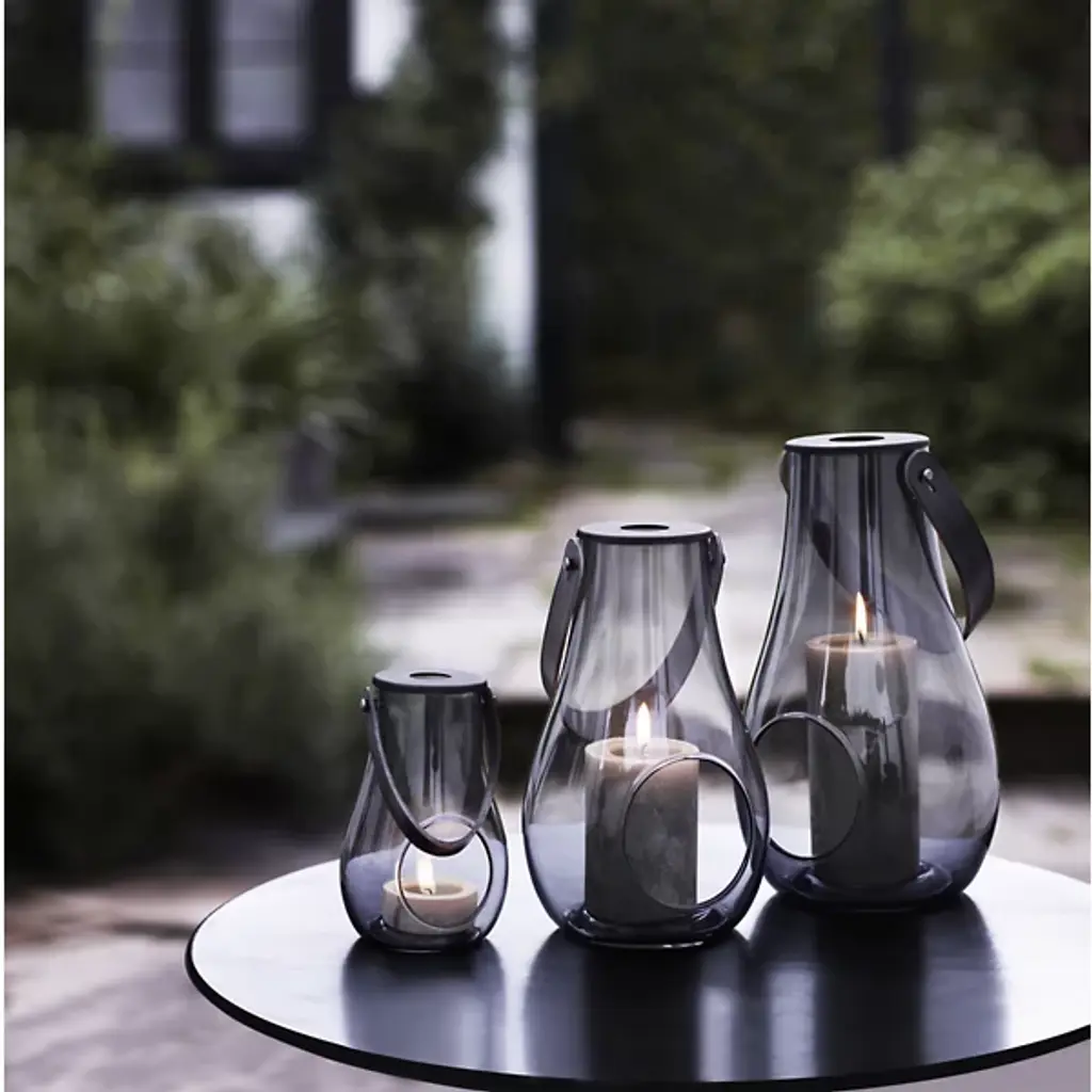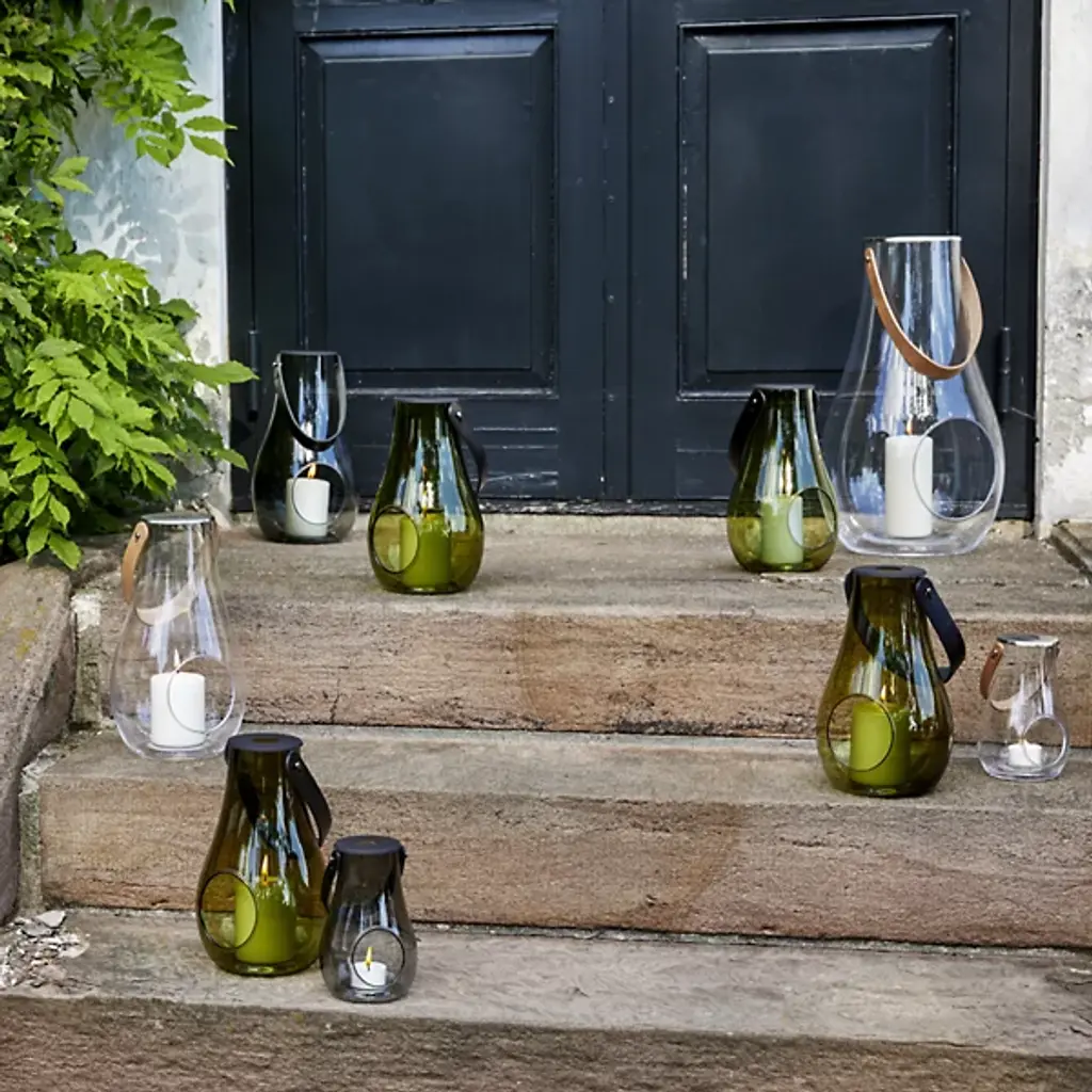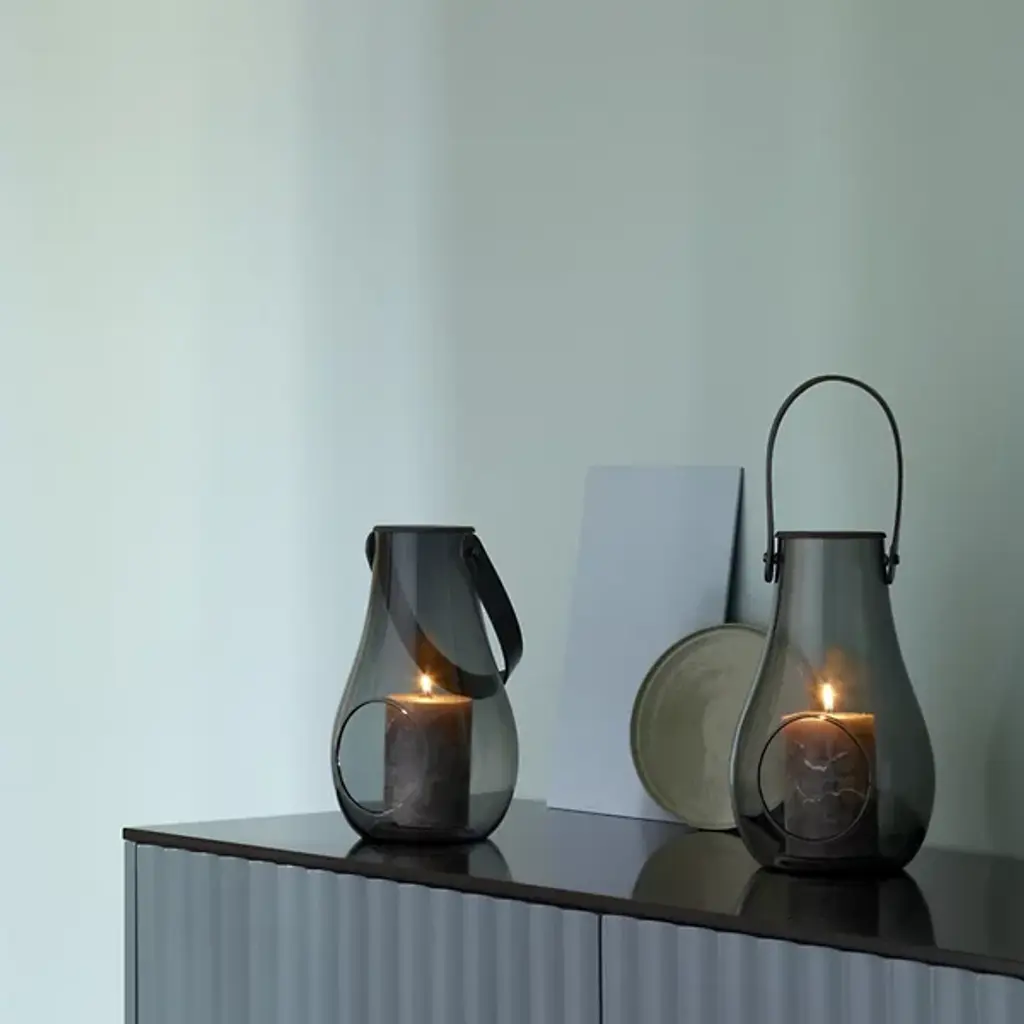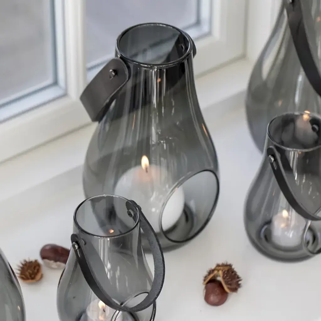 The Design with Light Lantern from Holmegaard showcases the organic irregularities inherent in mouth-blown glass construction. Maria Berntsen's approach celebrates these natural variations, including small air bubbles that make each piece unique. The curved glass body pairs with a full-grain leather carrying strap for indoor and outdoor mobility. The clear walls allow candlelight to cast warm patterns while the sturdy construction withstands regular movement. This lantern works equally well as functional lighting or a decorative accent, adapting to different settings throughout the seasons.