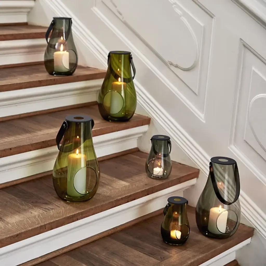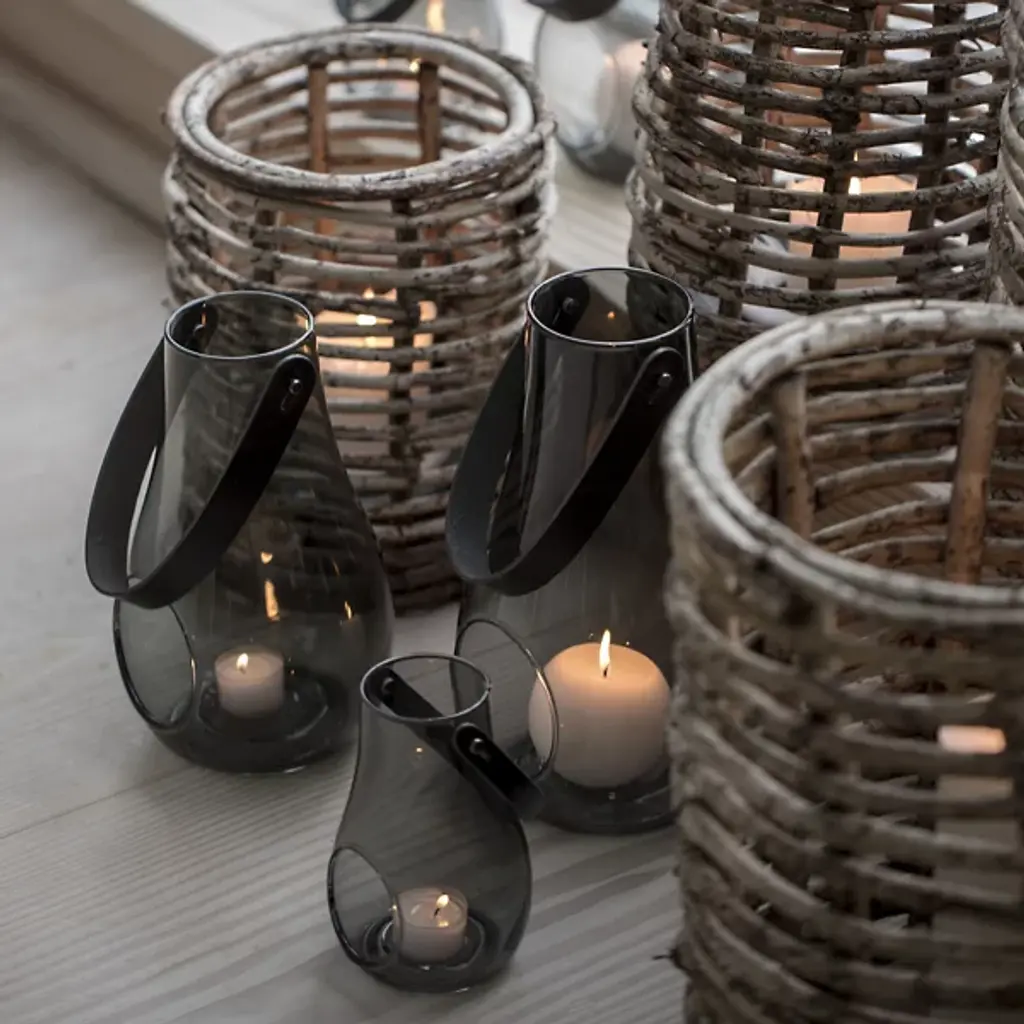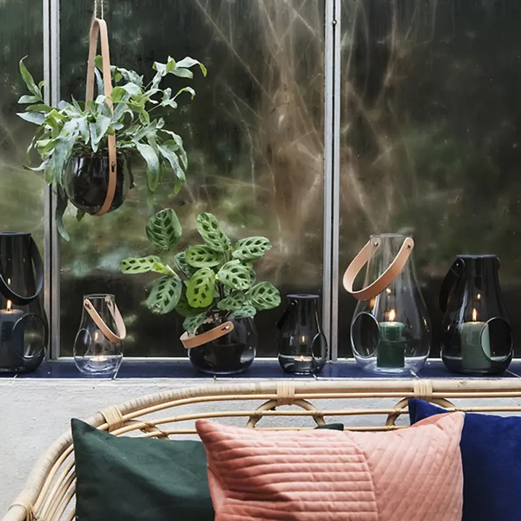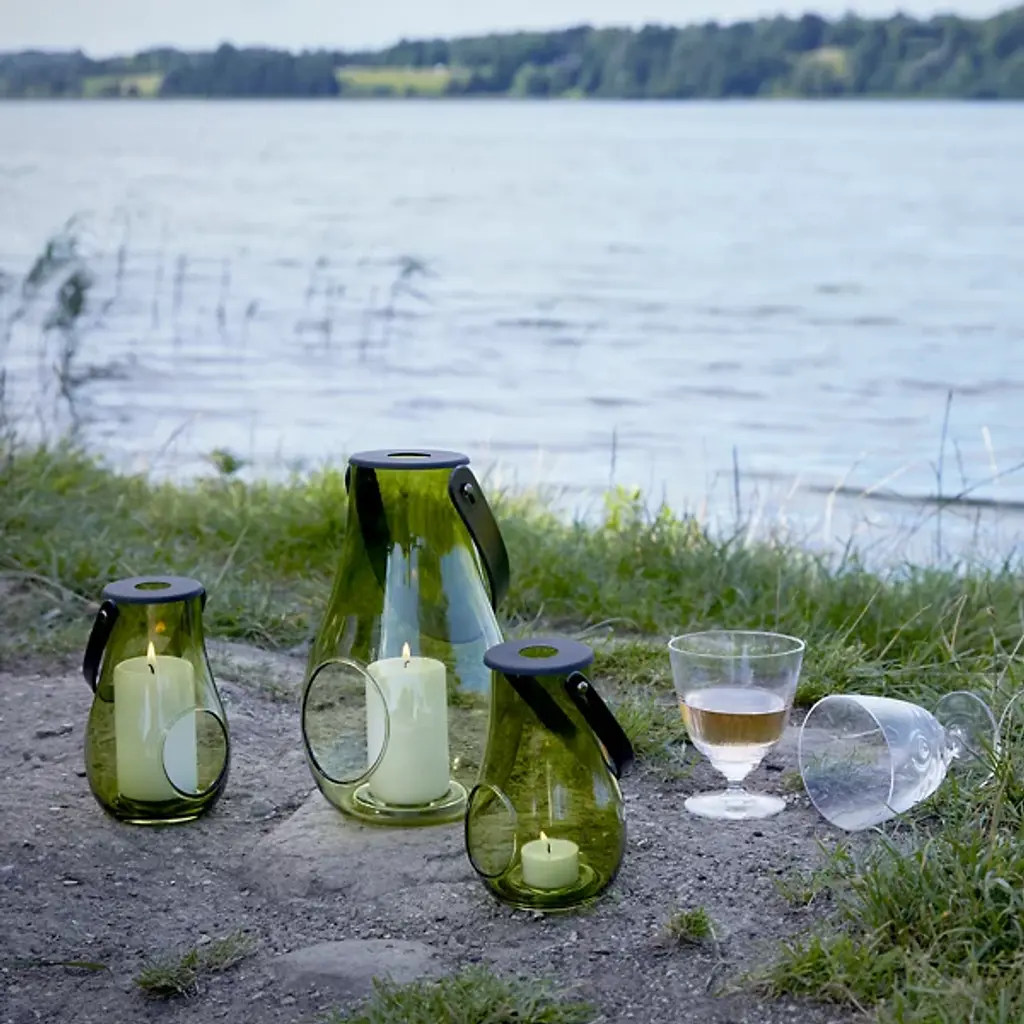 The Design with Light Lantern from Holmegaard showcases the organic irregularities inherent in mouth-blown glass construction. Maria Berntsen's approach celebrates these natural variations, including small air bubbles that make each piece unique. The curved glass body pairs with a full-grain leather carrying strap for indoor and outdoor mobility. The clear walls allow candlelight to cast warm patterns while the sturdy construction withstands regular movement. This lantern works equally well as functional lighting or a decorative accent, adapting to different settings throughout the seasons.