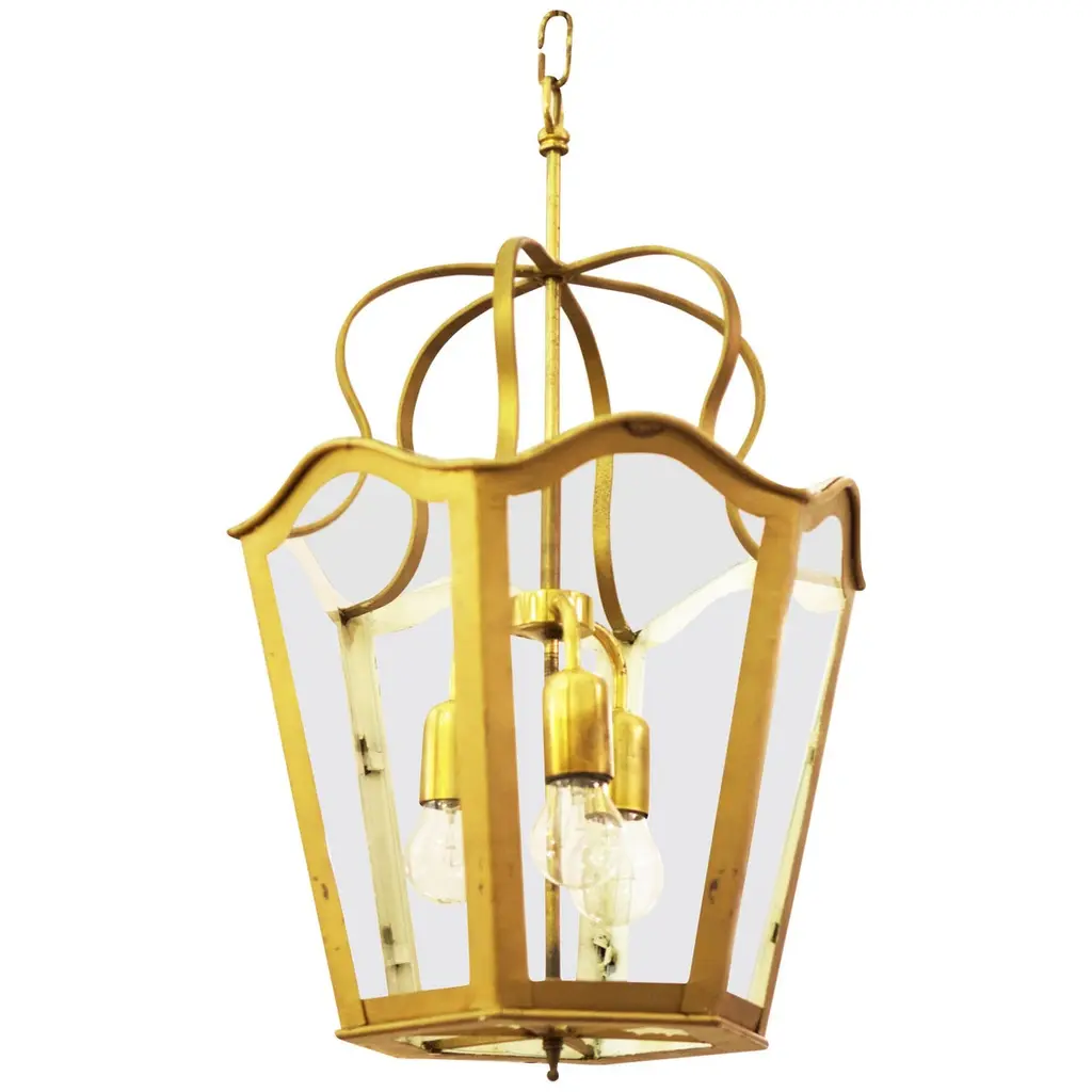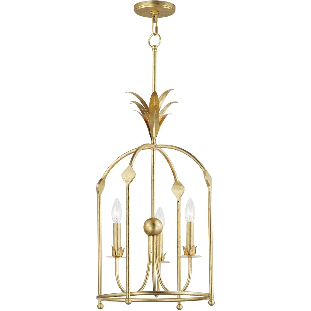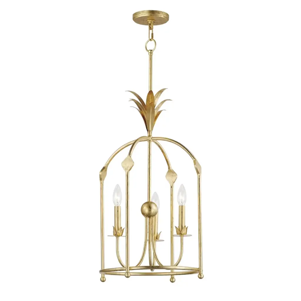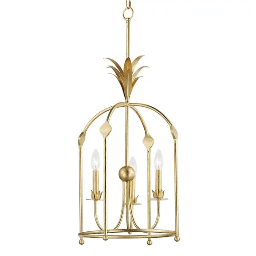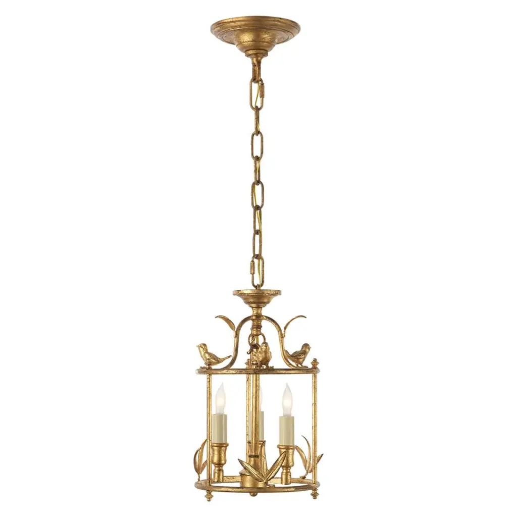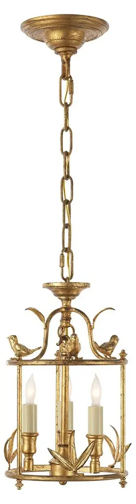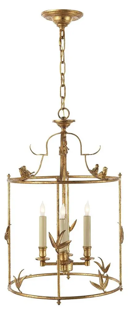 This hanging lantern is crafted of iron with an open caged structure that's softened by leaf-and-bird embellishments. A luxurious gilded finish completes the look. Hardwired.