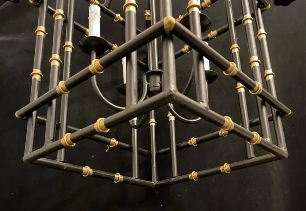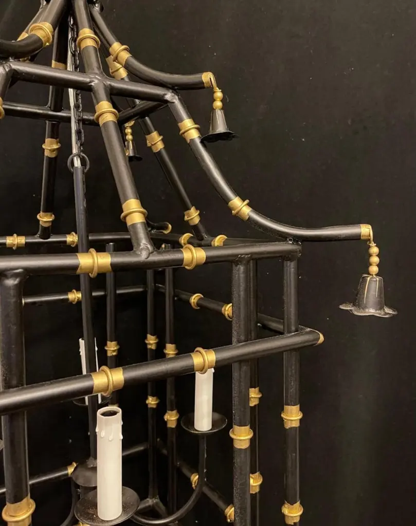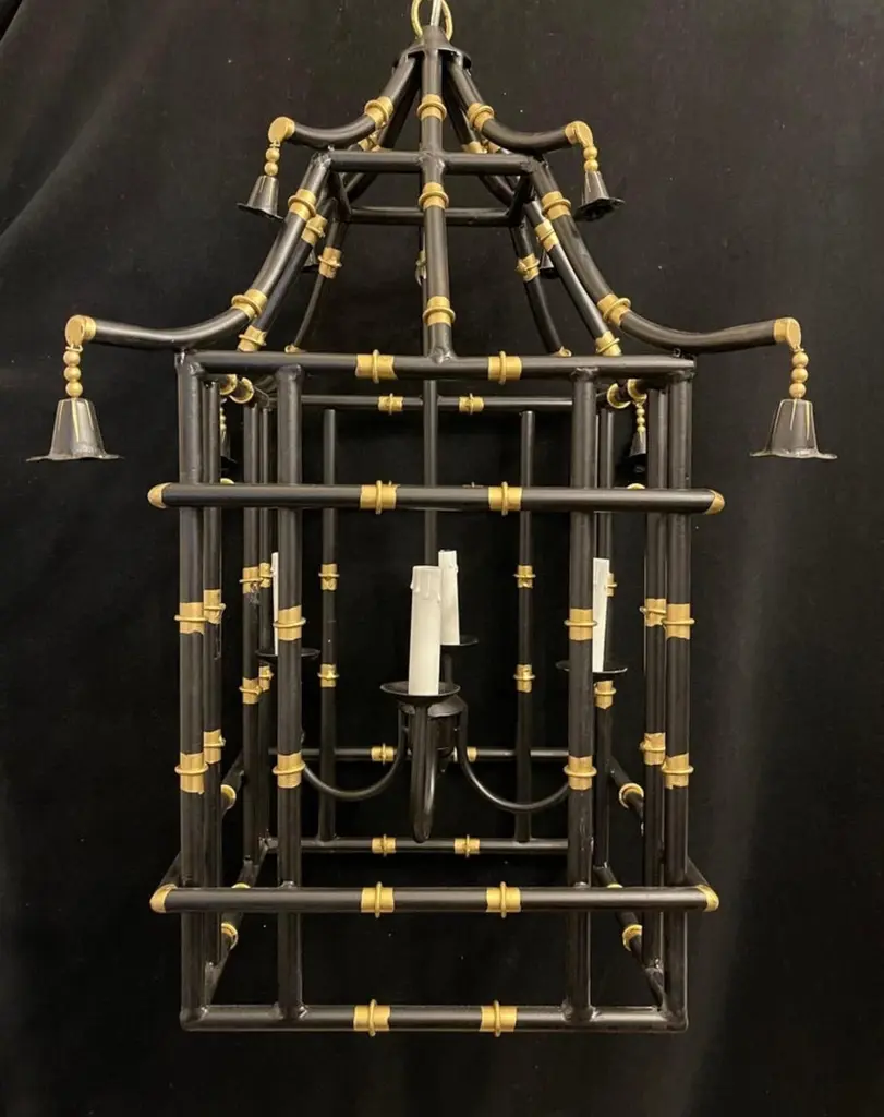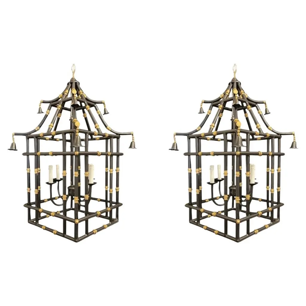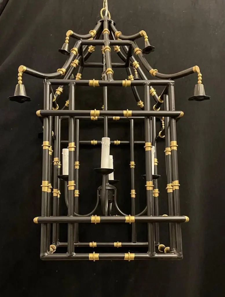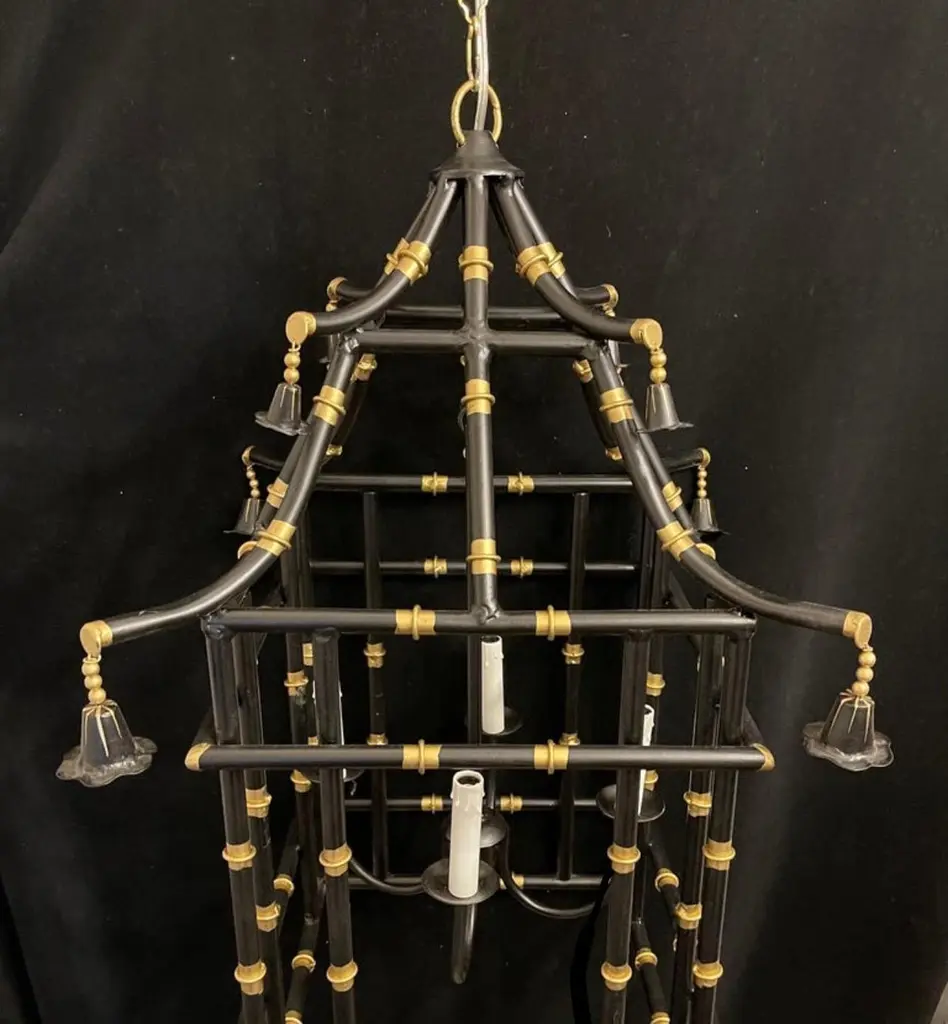 A divine large pair of black & gold gilt pagoda bamboo form chinoiserie lanterns, each of the fixtures have been rewired and come with chain canopy and mounting hardware for installation.Each chandelier sold separately