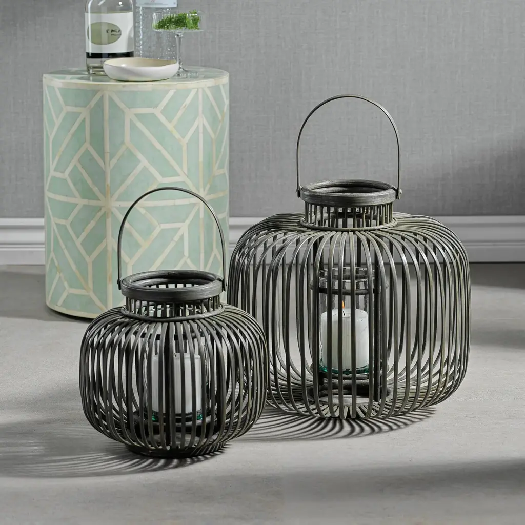 Light up your living space with this unique decorative lantern. This fascinating candle lantern features an interior hurricane glass to keep the flame of your favorite candle burning bright. The exterior features a bamboo wire frame with handle on top. Gray exterior accentuates the delicate silhouette Hurricane glass to keep the flame of your favorite candle burning bright With handle for easy portability Measures 15"dia x 14.125"ht (+ 5.75" when handle is extended) Fits up to a 3" in diameter pillar candle Care Instructions: Regular dusting with soft cloth or soft brush