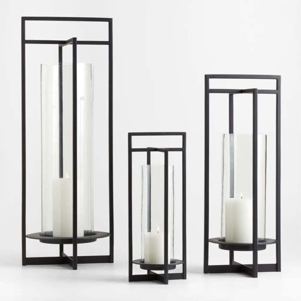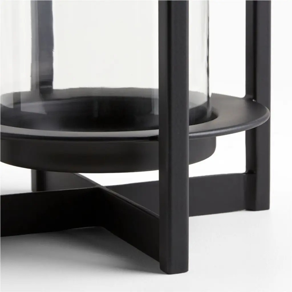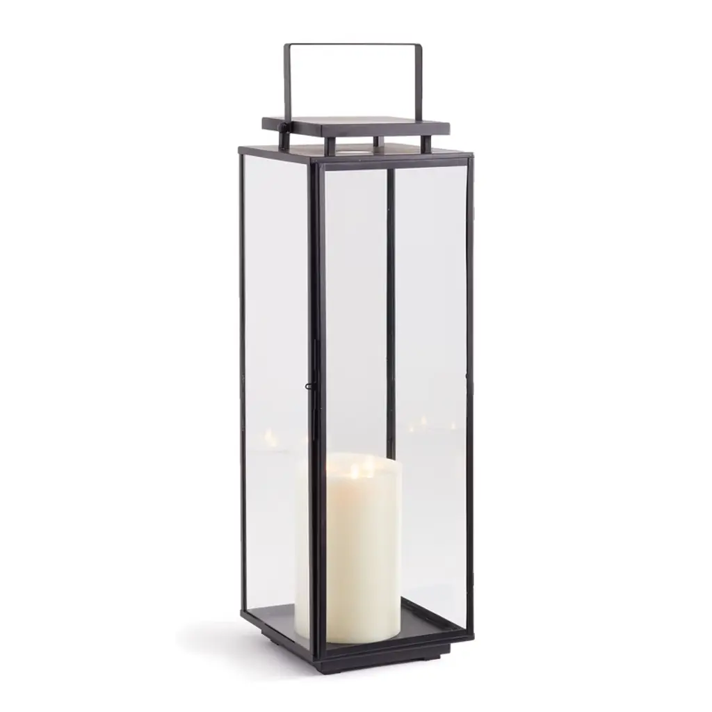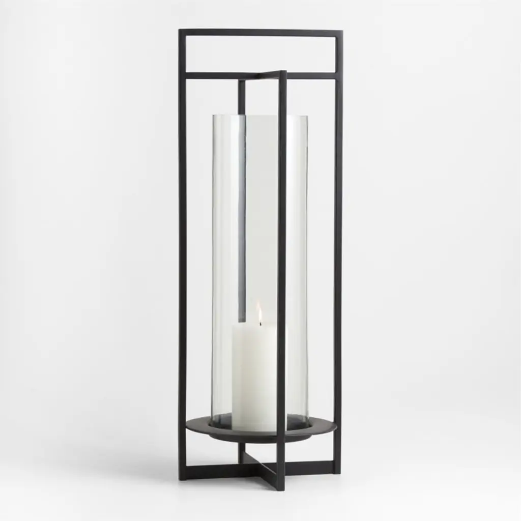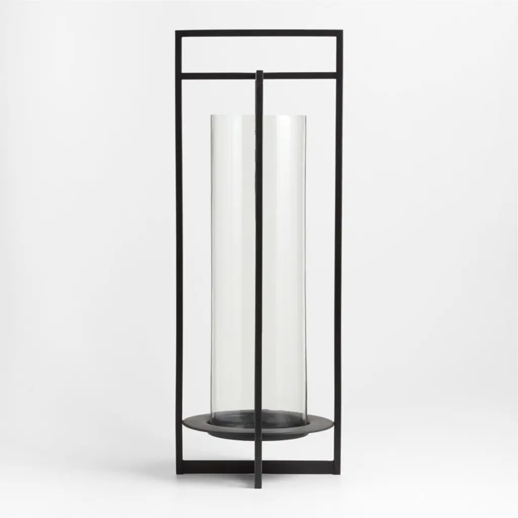 Illuminate the outdoors with this lantern inspired by our Dune furniture collection. Crafted of slender, squared-off rods, the X-shaped lantern frames a glass hurricane in crisp black lines. The top crossbar serves as a convenient carrying handle for repositioning the lantern on your porch or patio or for toting indoors. Pair the large Dune lantern with its smaller counterparts for a lovely and linear candlelight display.