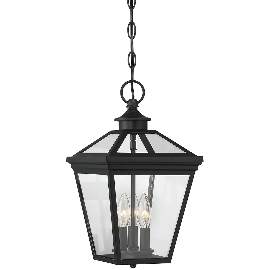 Brighten the exterior of your home and welcome your guests in style with the Savoy House Ellijay 3-light outdoor hanging lantern. The design mimics a vintage gas lantern with a classic tapered box shape and decorative top finial. The black finish looks terrific and blends well with other hardware and architectural materials. Panes of clear glass fill all four side panels and the roof panels, too. Three 40W candelabra size bulbs provide inviting and secure illumination. This lantern measures 9" wide and 15.75" high. Youll enjoy its timeless style and enhance the beauty of your property, whether on your porch, patio, sunroom, pergola or hung from other outdoor ceilings in your garden and yard.