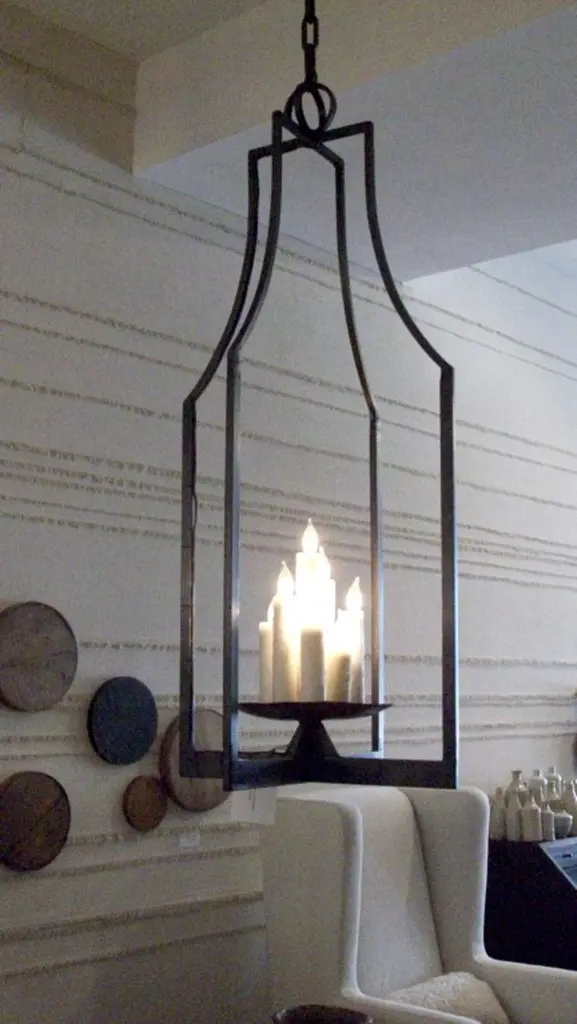 Custom elongated iron lantern by Michael Del Piero.This Classic lantern is made to order. The elongated shape updates a Classic Includes nine beeswax candle sleeves and is available in custom sizing.