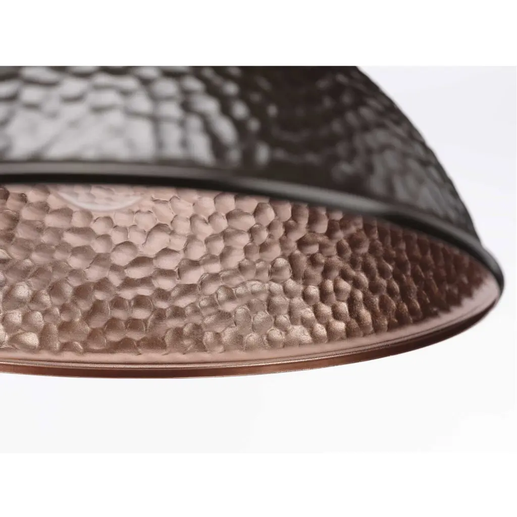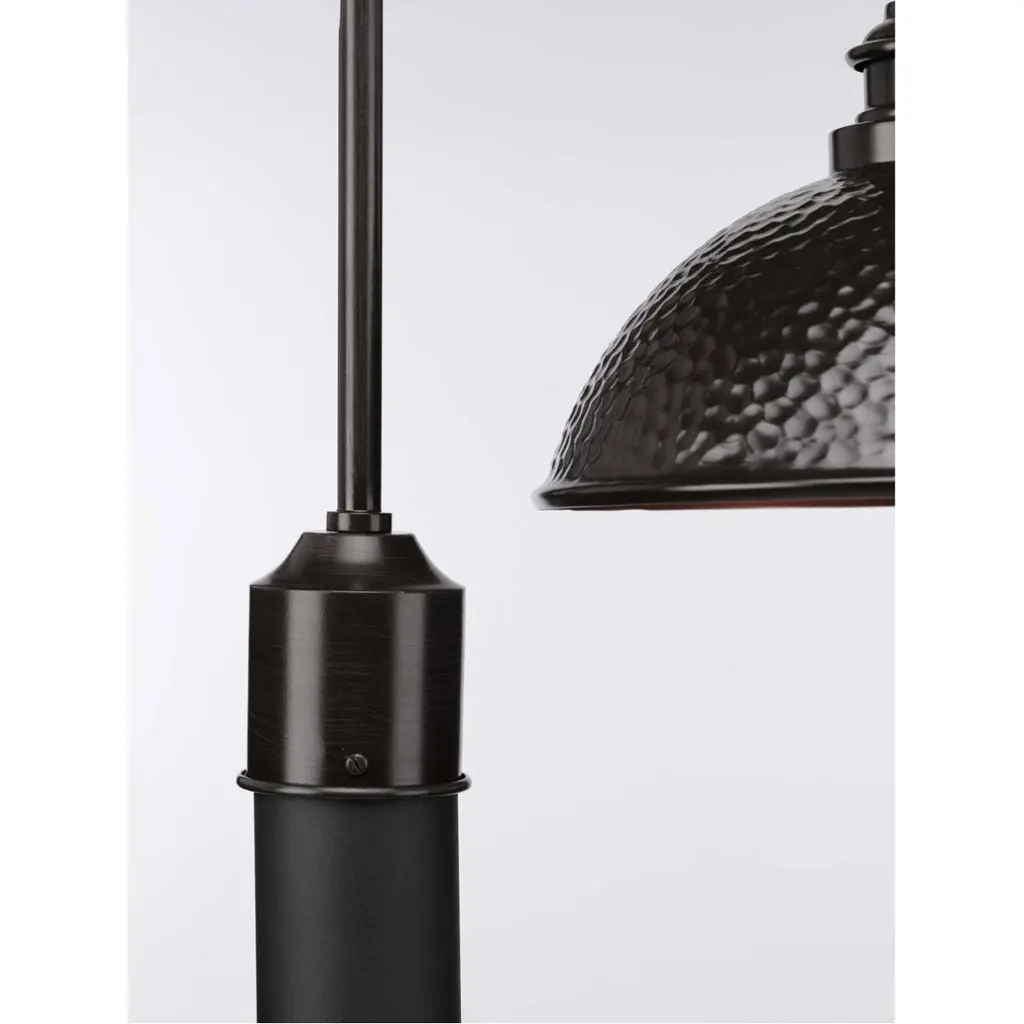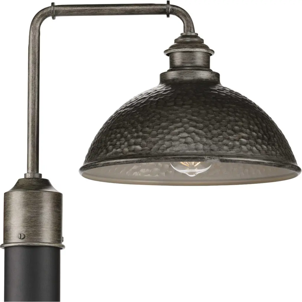 Celebrate the rustic craftsmanship as the Englewood one-light post lantern washes light over your favorite outdoor setting beneath its stunning, Antique Bronze hammered finished shade with a handsome copper interior.