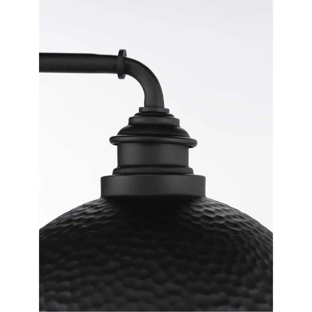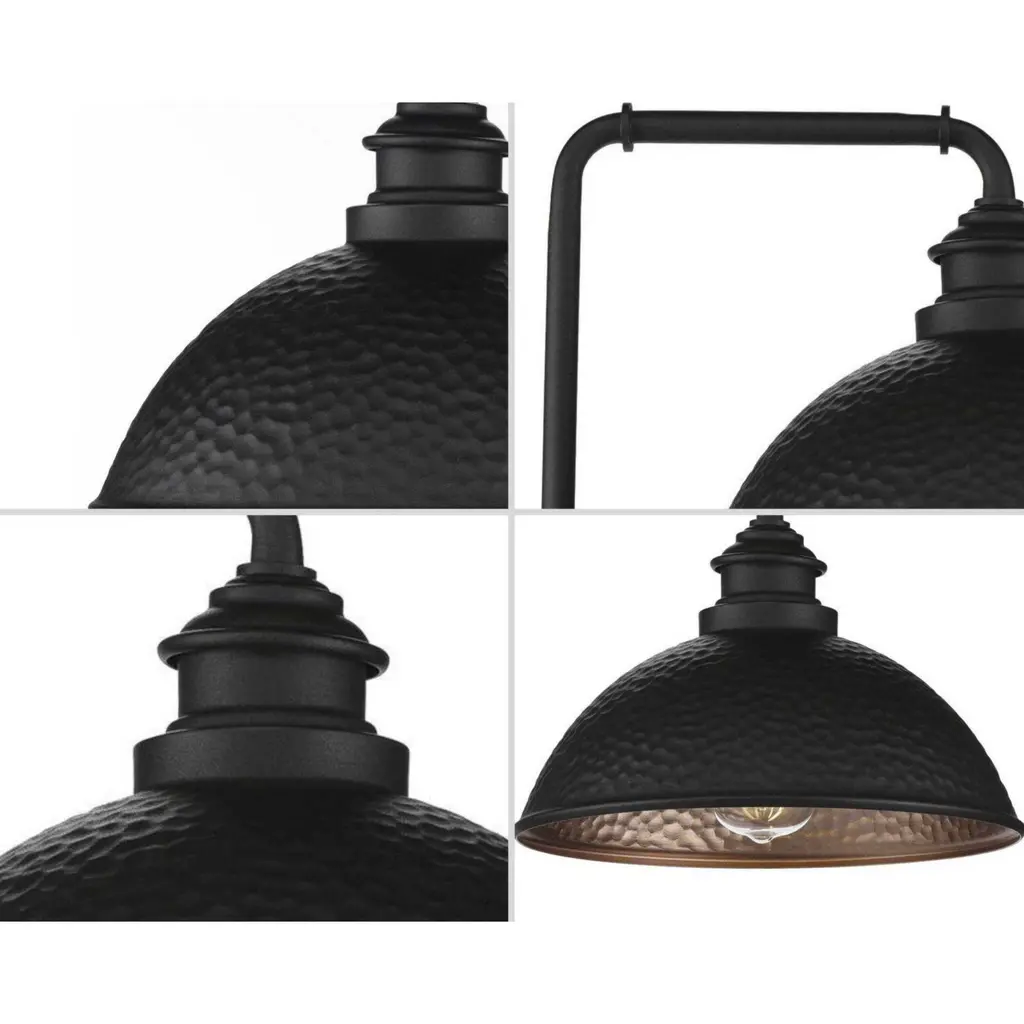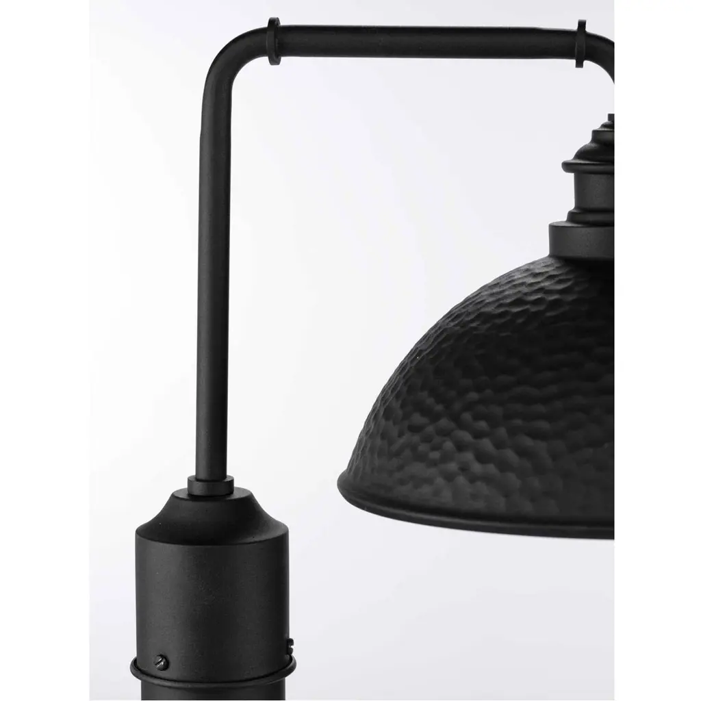 Extend an evening in a favorite outdoor space assisted by the glow from the becoming Black-finished Englewood one-light post lantern. A pipe-like arm holds the hammered-textured shade accented by the shade’s copper interior.