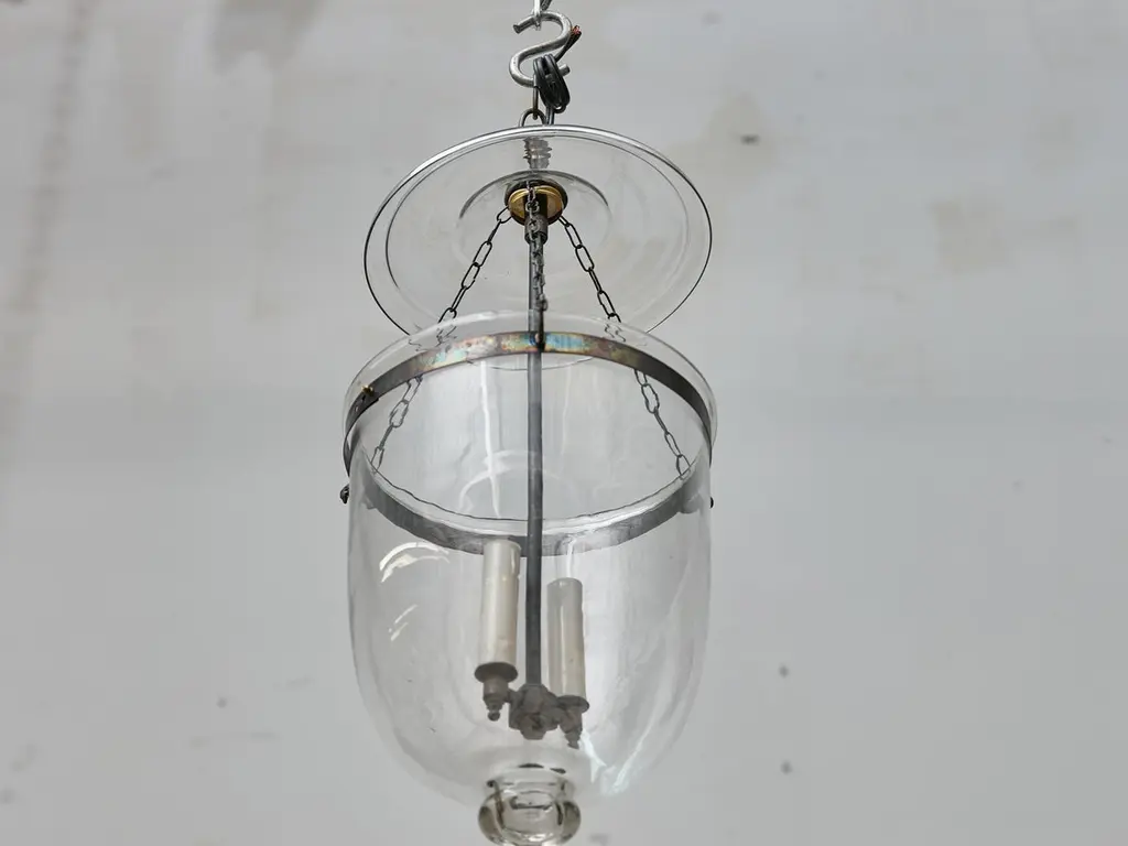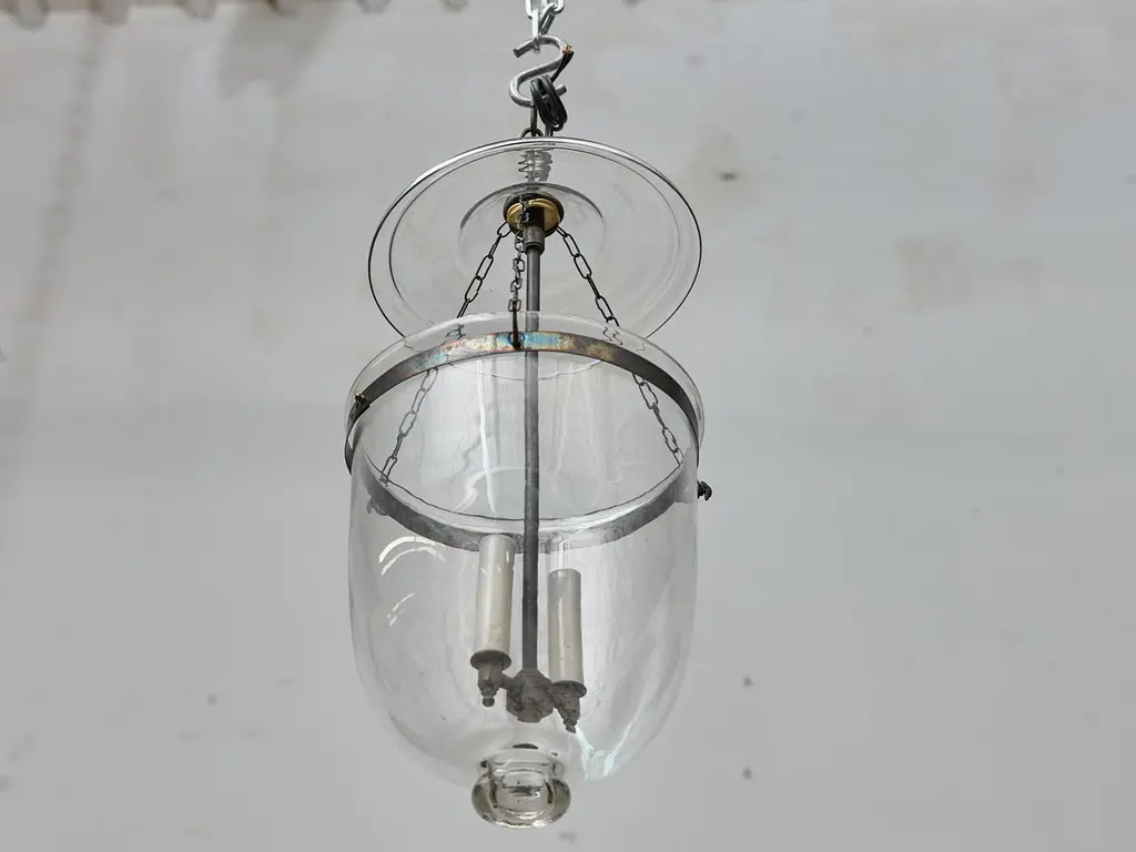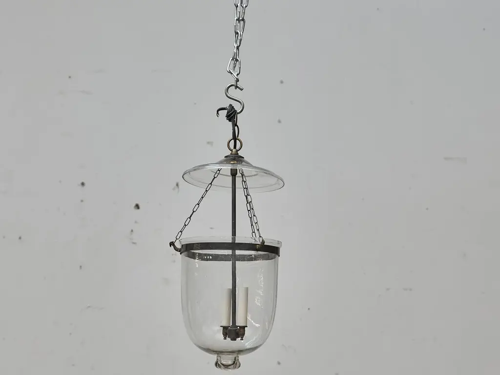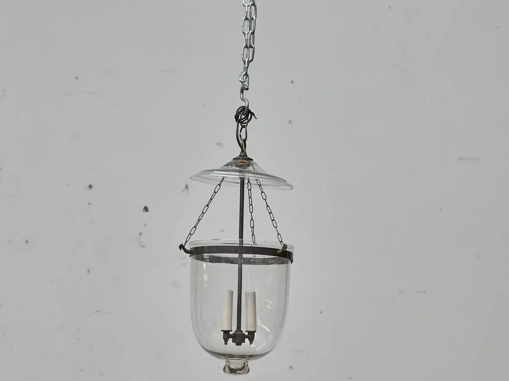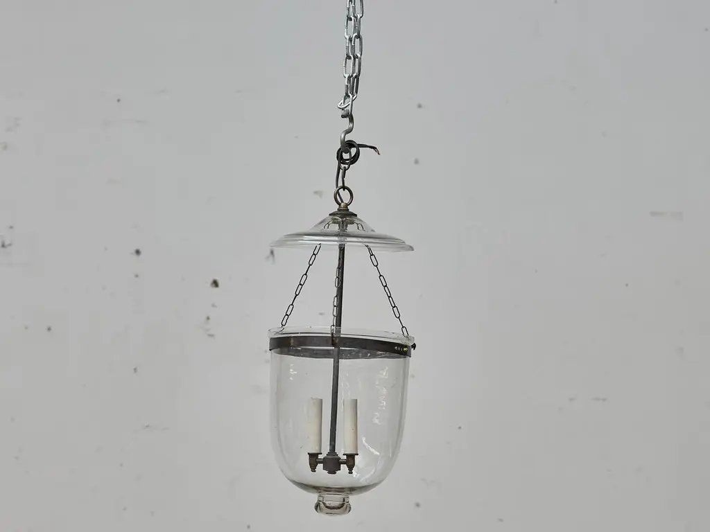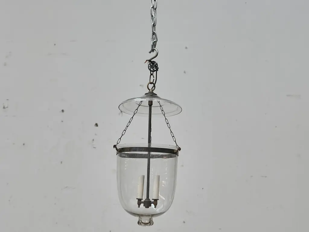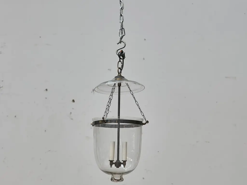 A refined English bell jar lantern in clear handblown glass and polished metal, dating to the mid-20th century. This compact light fixture features a domed glass canopy suspended by three delicate chains and a classic bell-shaped body beneath. The lantern houses a two-light candelabra cluster supported by a turned metal stem, offering warm ambient light while preserving sightlines with its transparent form.The fixture’s restrained detailing and small scale (21 inches high by 9 inches in diameter) make it especially well-suited for hallways, powder rooms, or secondary entrances. Subtle irregularities in the glass, including light waviness and small air bubbles, confirm the handmade nature of the vessel and add character to the piece.This lantern has been newly wired for US use and includes a length of chain for hanging. Its clean lines and traditional form make it a versatile choice for interiors blending classical and modern elements. Two are available, making this a flexible solution for cohesive lighting schemes across multiple rooms.