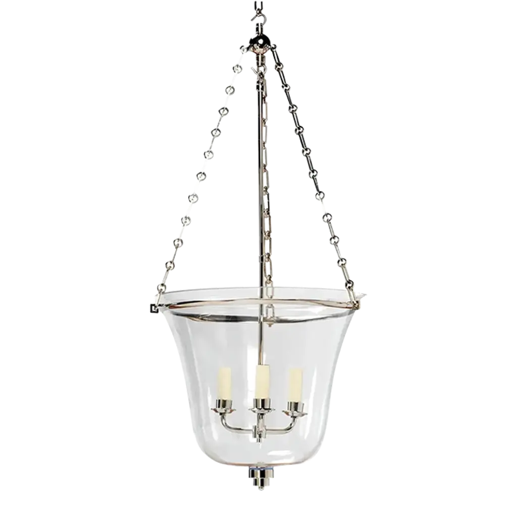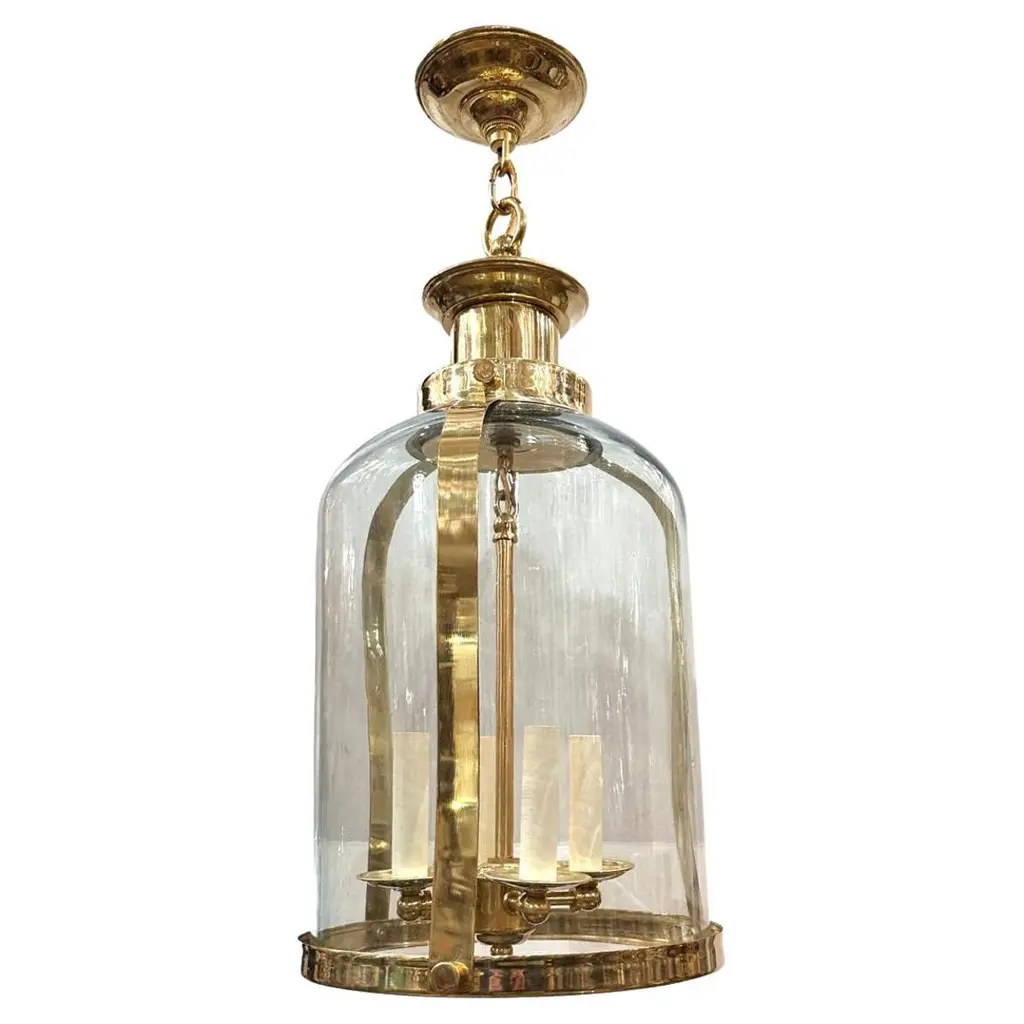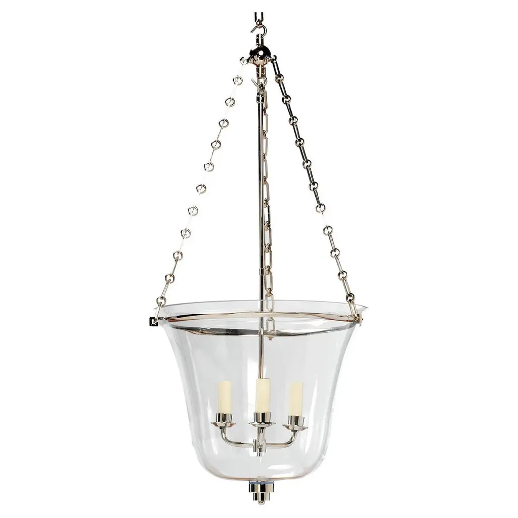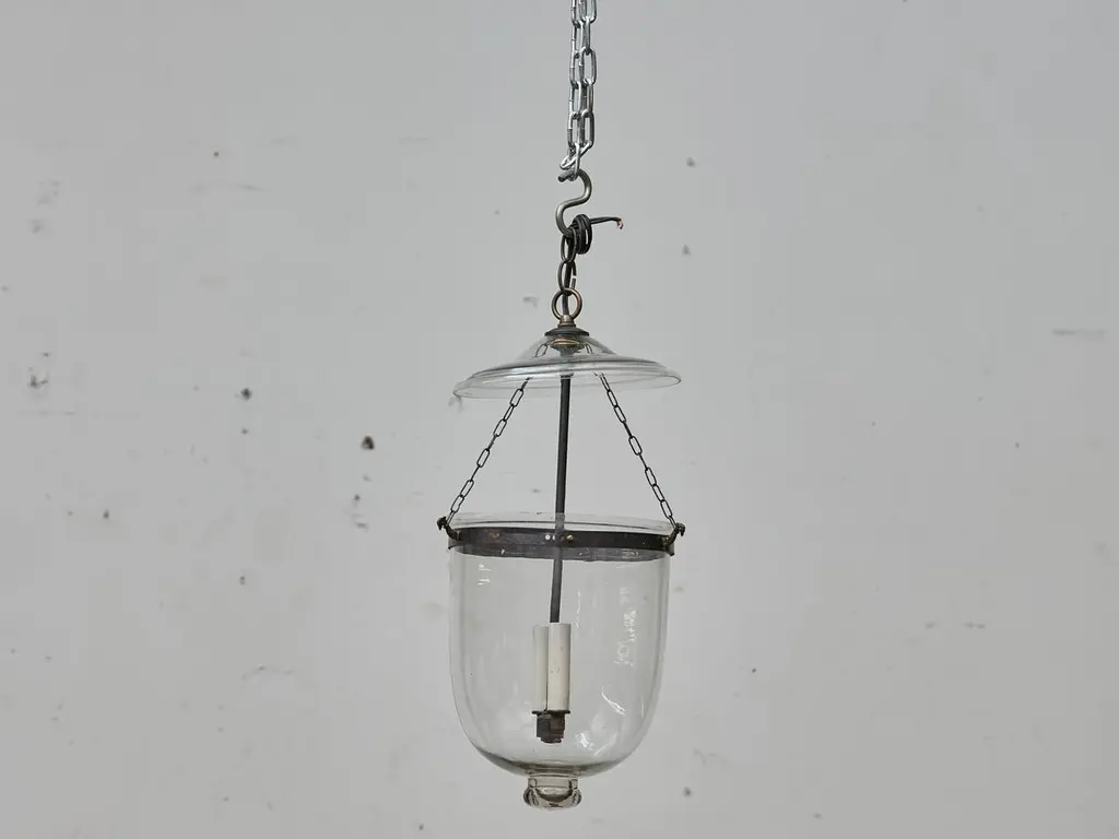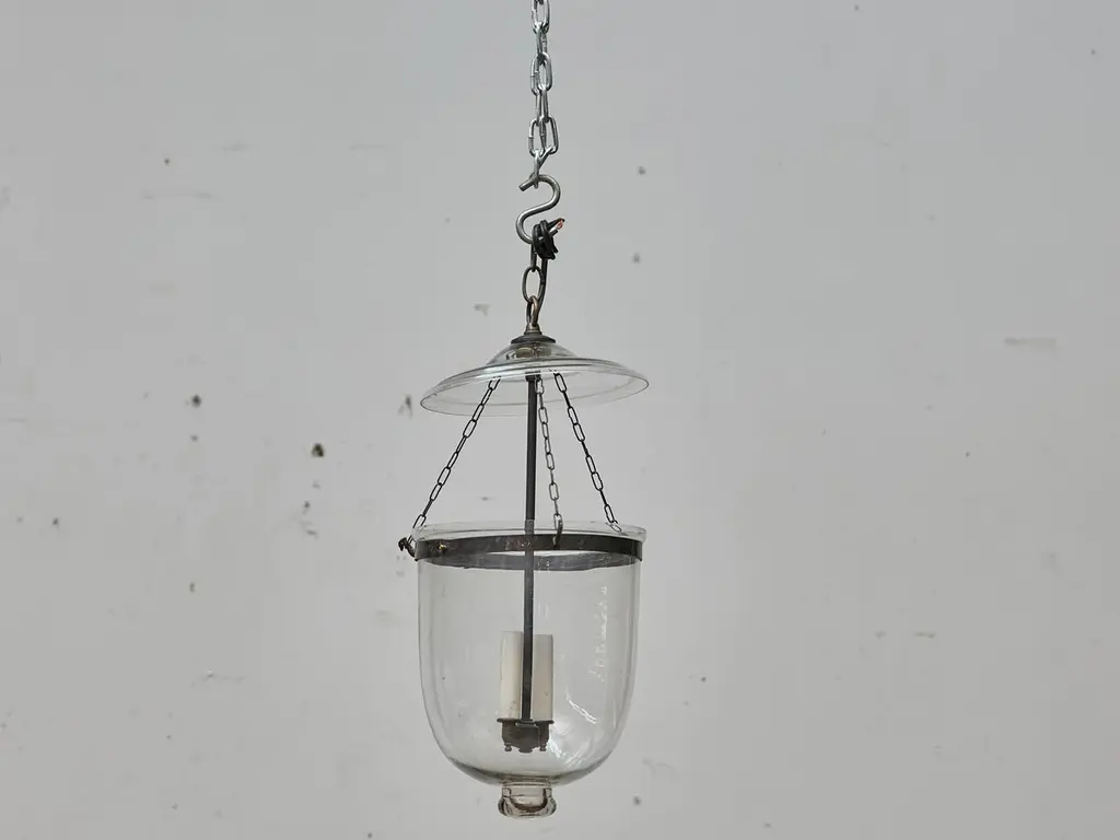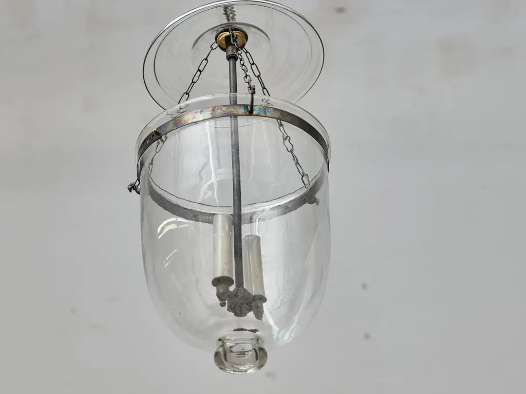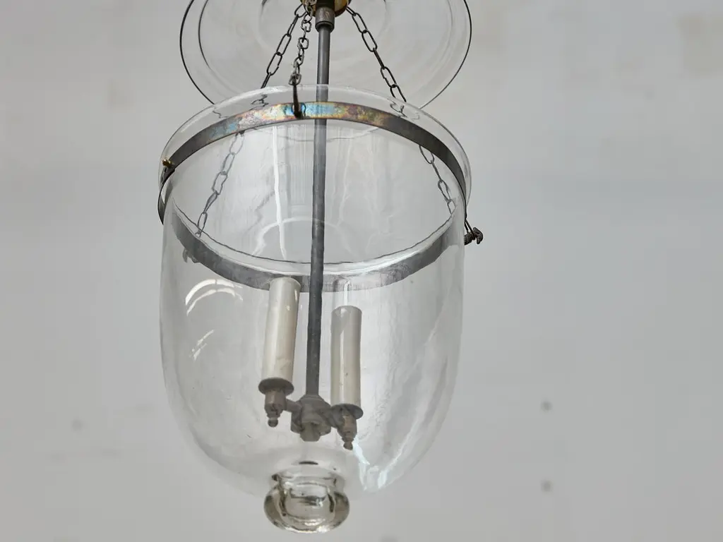 A refined English bell jar lantern in clear handblown glass and polished metal, dating to the mid-20th century. This compact light fixture features a domed glass canopy suspended by three delicate chains and a classic bell-shaped body beneath. The lantern houses a two-light candelabra cluster supported by a turned metal stem, offering warm ambient light while preserving sightlines with its transparent form.The fixture’s restrained detailing and small scale (21 inches high by 9 inches in diameter) make it especially well-suited for hallways, powder rooms, or secondary entrances. Subtle irregularities in the glass, including light waviness and small air bubbles, confirm the handmade nature of the vessel and add character to the piece.This lantern has been newly wired for US use and includes a length of chain for hanging. Its clean lines and traditional form make it a versatile choice for interiors blending classical and modern elements. Two are available, making this a flexible solution for cohesive lighting schemes across multiple rooms.