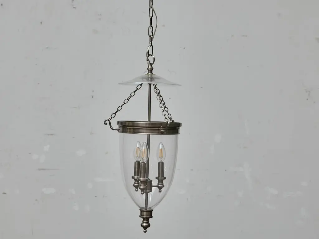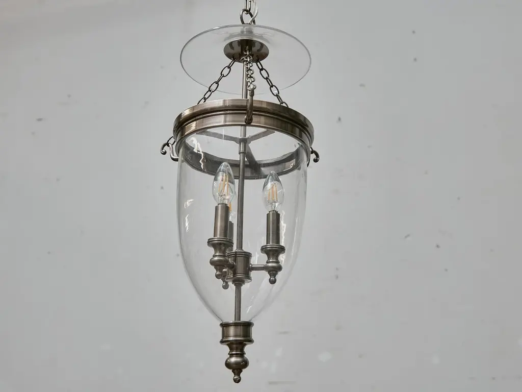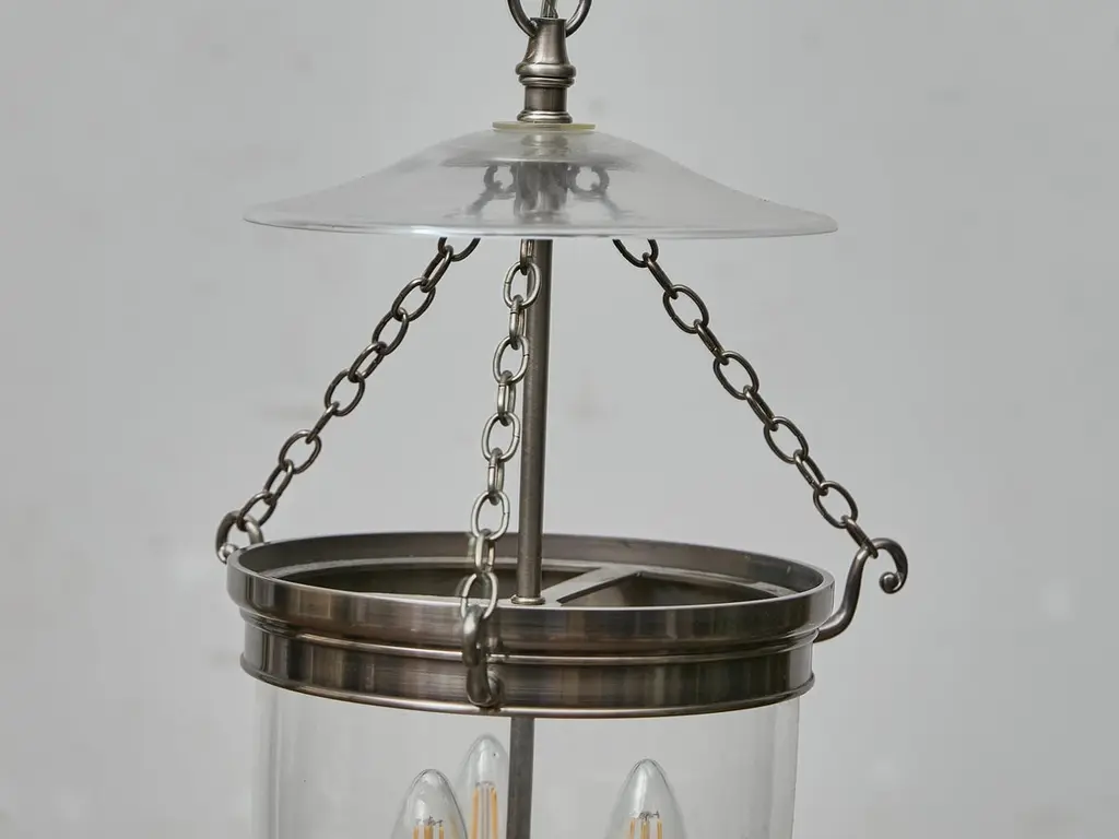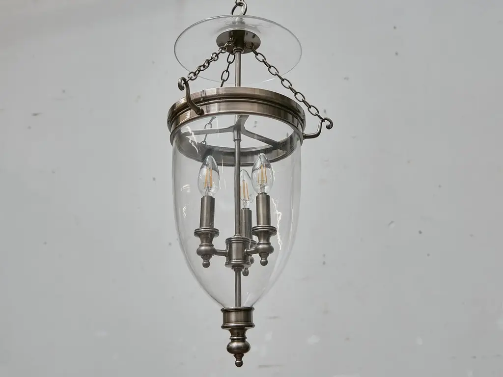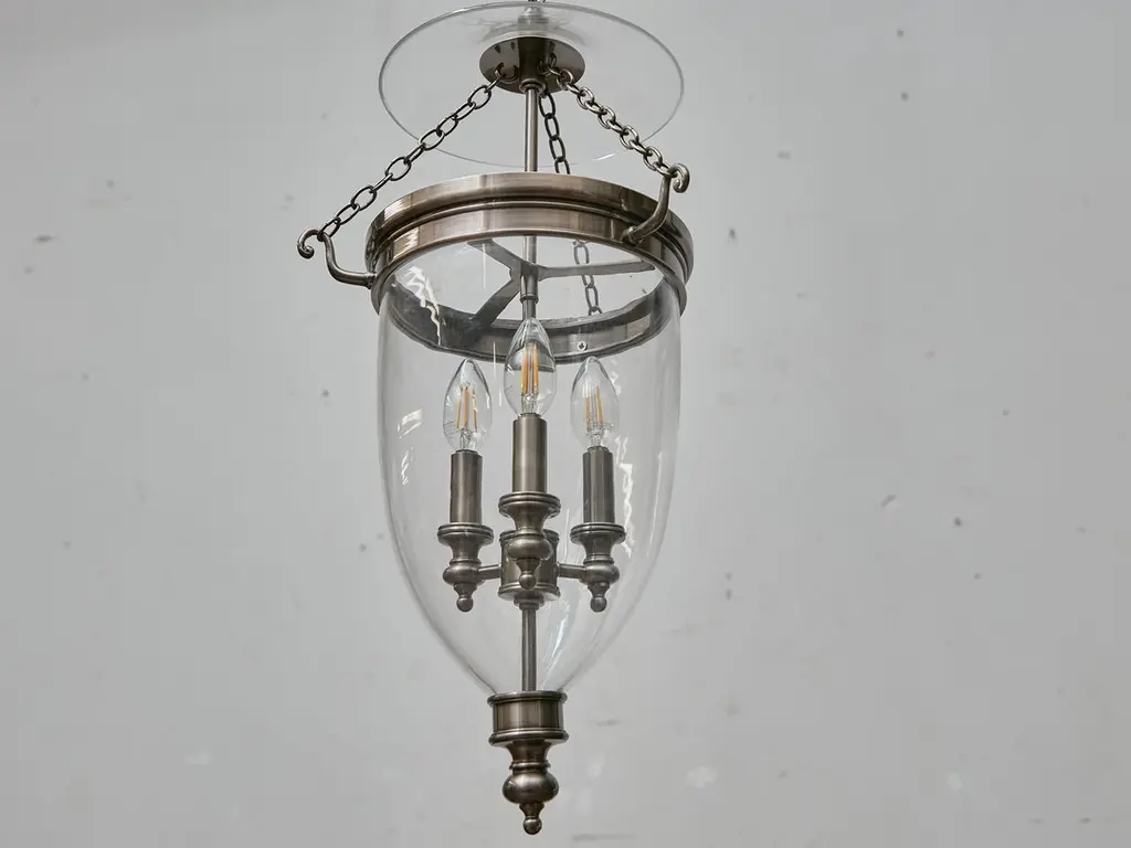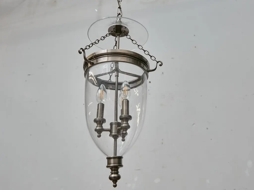 An elegant English bell jar lantern in polished nickel, dating to the mid-20th century and distinguished by its refined silhouette and understated classical details. The piece features a domed clear glass top suspended by three decorative chains, which support a large handblown bell-shaped glass body enclosing a three-light candelabra cluster. The candle-style fittings are mounted on a turned central stem, adding balance and architectural structure to the interior.The stepped finial at the base and the ring at the top further reinforce the neoclassical inspiration, while the nickel-plated hardware lends a more contemporary, transitional appeal. This fixture has been newly wired with three standard-base sockets and is ready for installation in US interiors.Measuring 26 inches in height and 12 inches in diameter, this bell lantern is ideally proportioned for use in an entryway, stairwell, or powder room. Its restrained palette and timeless profile allow it to blend seamlessly in both traditional and modern settings, offering ambient illumination and elegant presence without visual heaviness. Several lanterns are available, making them an excellent option for grouped installations or multi-room projects.