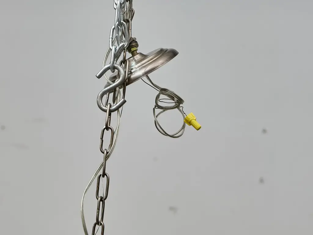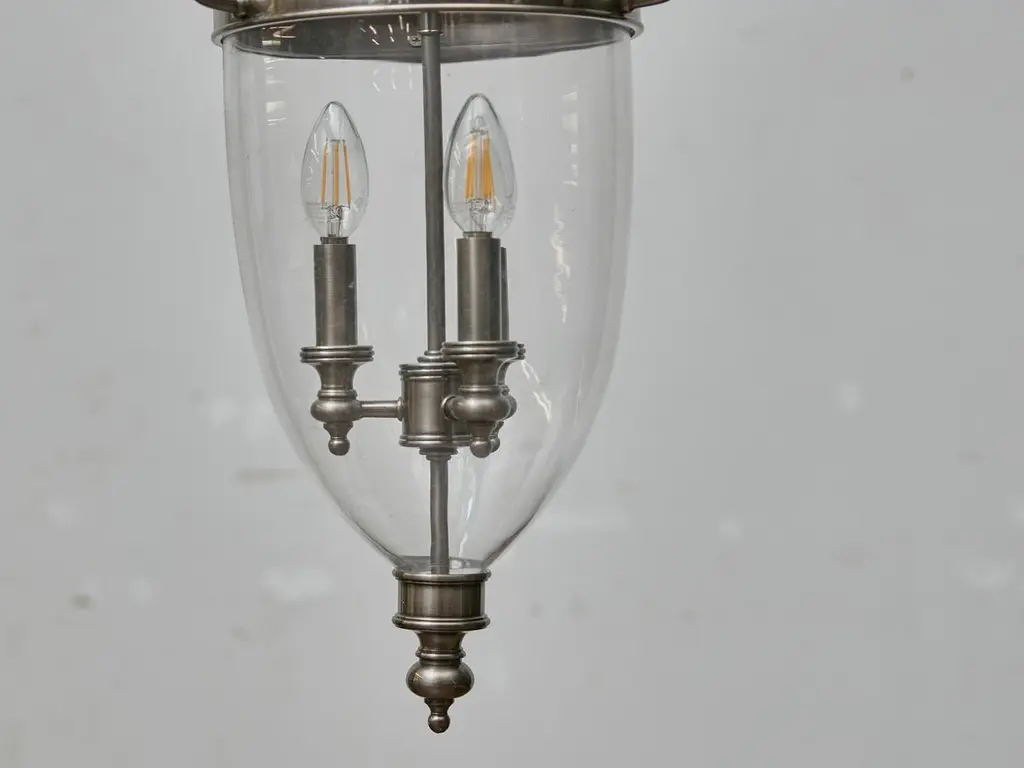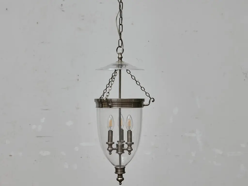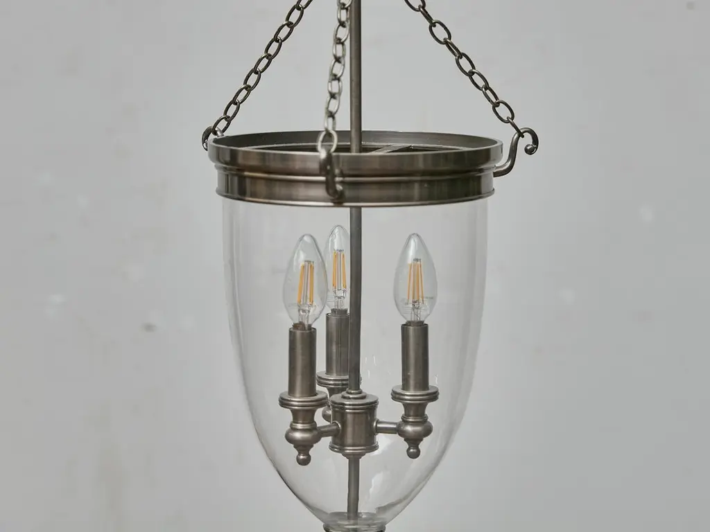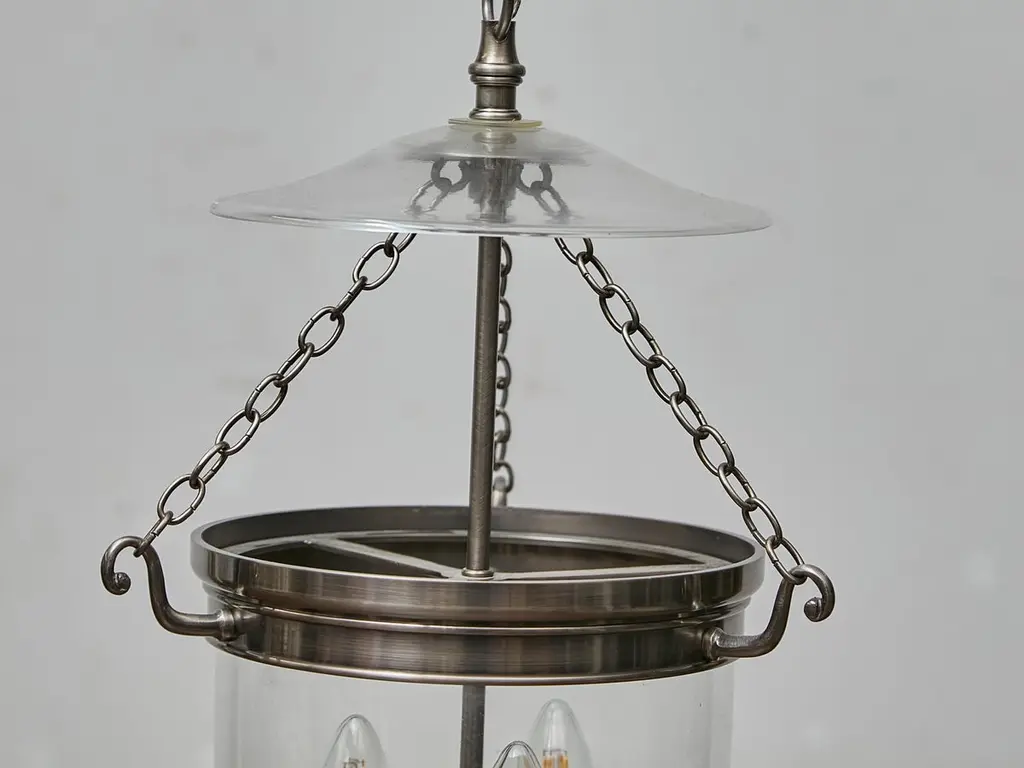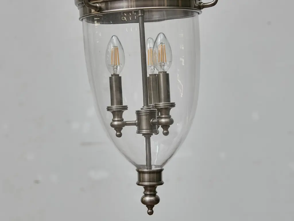 An elegant English bell jar lantern in polished nickel, dating to the mid-20th century and distinguished by its refined silhouette and understated classical details. The piece features a domed clear glass top suspended by three decorative chains, which support a large handblown bell-shaped glass body enclosing a three-light candelabra cluster. The candle-style fittings are mounted on a turned central stem, adding balance and architectural structure to the interior.The stepped finial at the base and the ring at the top further reinforce the neoclassical inspiration, while the nickel-plated hardware lends a more contemporary, transitional appeal. This fixture has been newly wired with three standard-base sockets and is ready for installation in US interiors.Measuring 26 inches in height and 12 inches in diameter, this bell lantern is ideally proportioned for use in an entryway, stairwell, or powder room. Its restrained palette and timeless profile allow it to blend seamlessly in both traditional and modern settings, offering ambient illumination and elegant presence without visual heaviness. Several lanterns are available, making them an excellent option for grouped installations or multi-room projects.