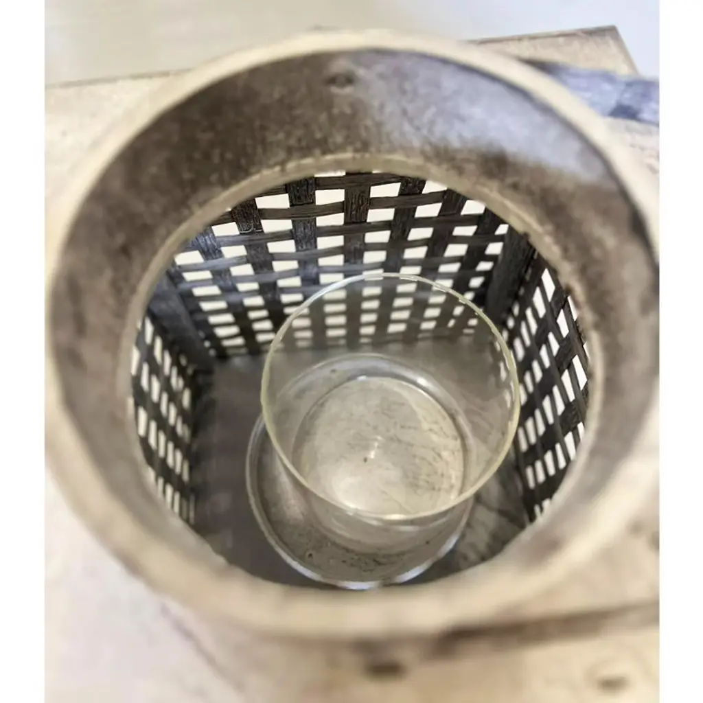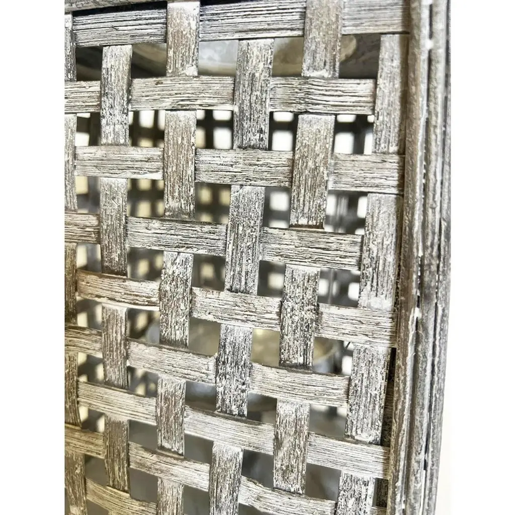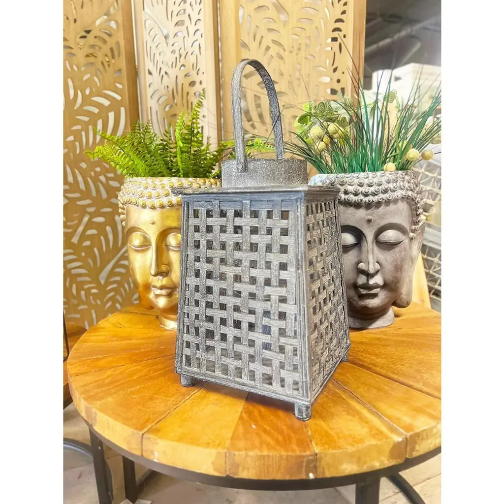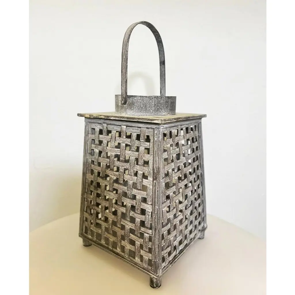 A chic and rustic tabletop lantern made from gray washed bamboo, featuring a trapezoid design with a distressed gray finish that lends a vintage, weathered appeal. It includes a clear glass candle holder and a sturdy handle for easy carrying or hanging. This black bamboo lantern combines natural beauty with rustic charm, making it a versatile and decorative addition to any space. The distressed finish and practical handle enhance its functionality and style, perfect for both indoor and outdoor settings.