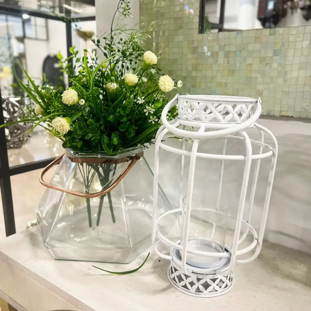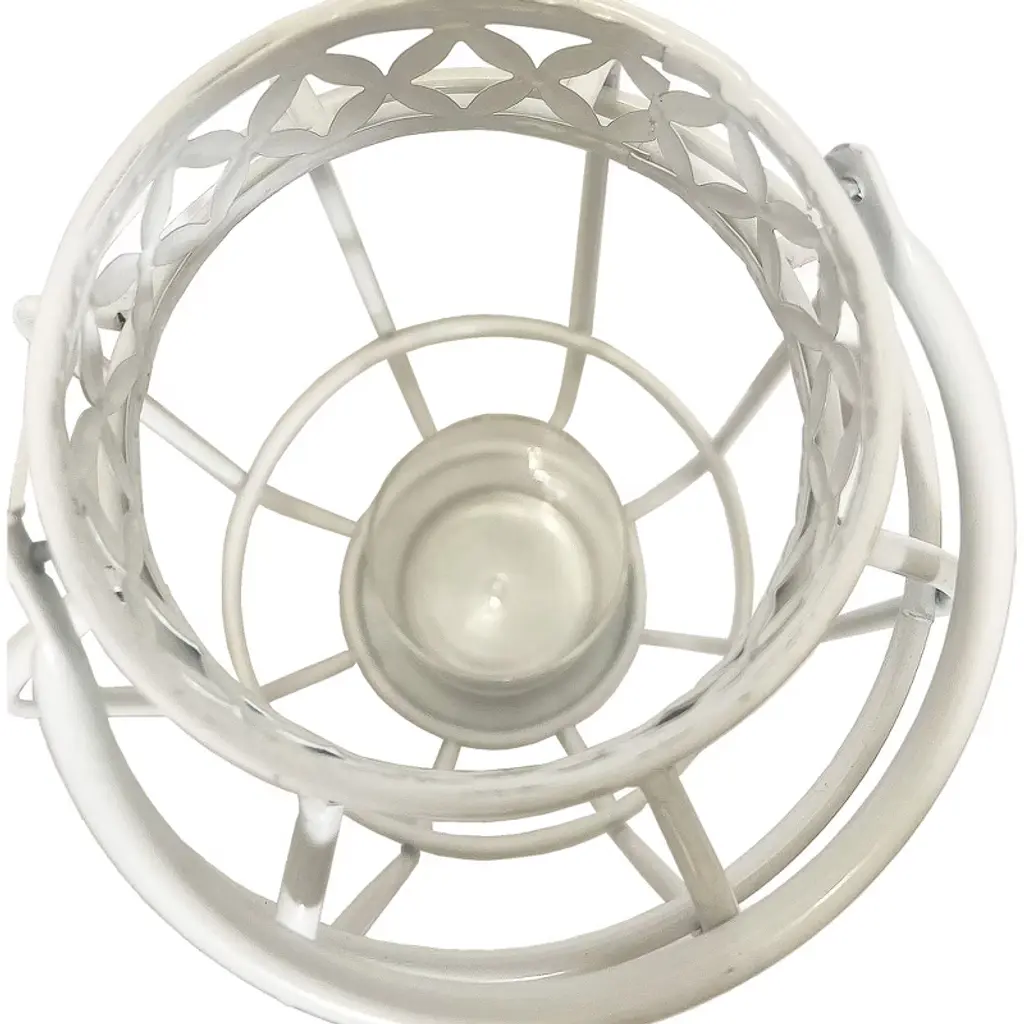 A delightful white metal lantern featuring a built-in glass candle holder. Designed with intricate openwork details, this lantern exudes a romantic and elegant charm. Its delicate craftsmanship and timeless white finish make it a versatile decorative accent, perfect for enhancing any home or event. The included glass candle holder offers flexibility, allowing you to personalize it with candles of various sizes and colors.
