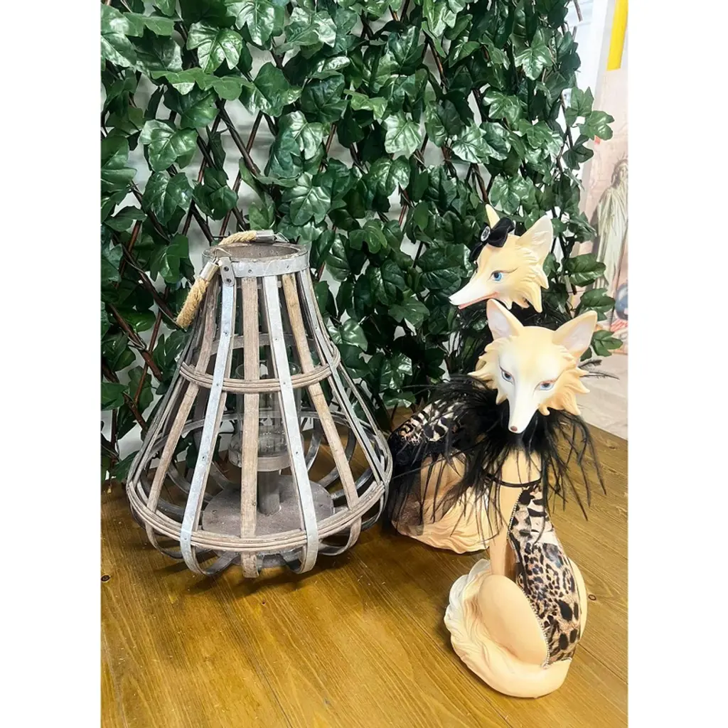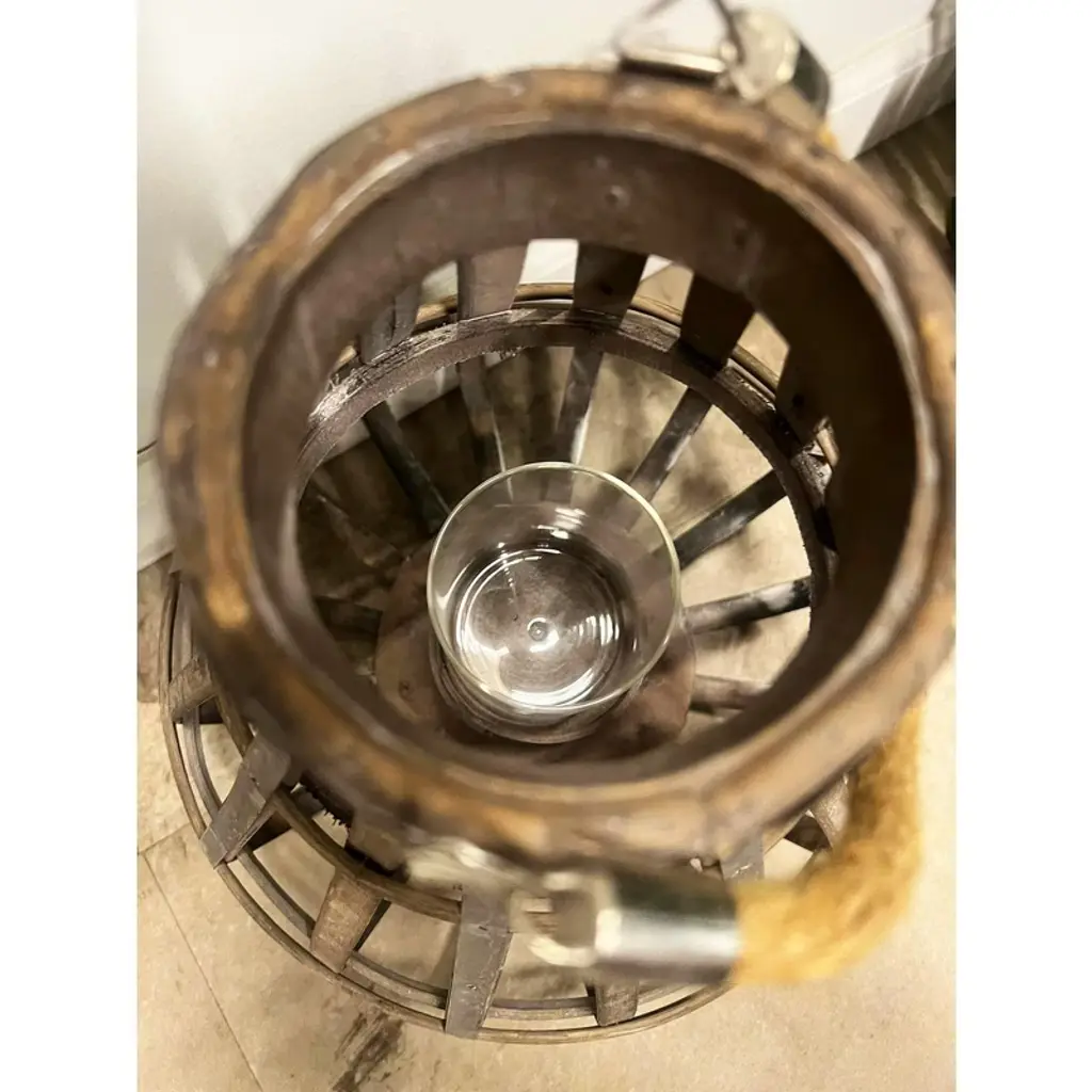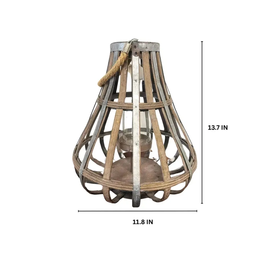 This lantern boasts a distinct rustic charm, crafted predominantly from natural bamboo for a warm, earthy aesthetic. Its slightly irregular, organic shape evokes the look of a woven basket, enhancing its handmade appeal. The blend of natural bamboo, metal accents, and its unique form results in a visually captivating and welcoming design, making it an ideal addition to bring warmth and character to any space.