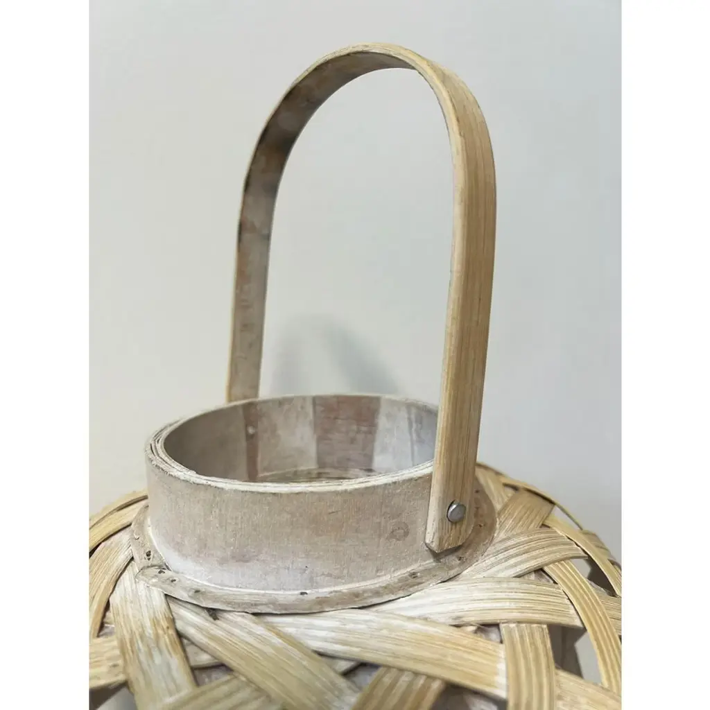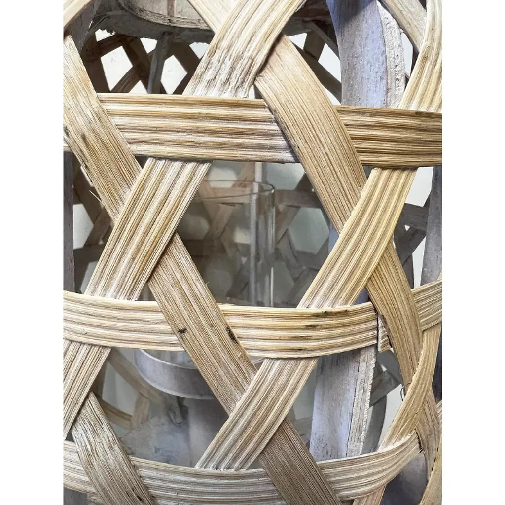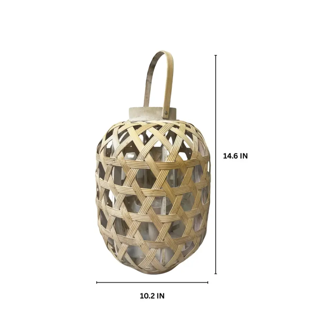 A chic and rustic tabletop lantern made from natural bamboo, featuring a rounded novelty design with a natural finish that lends a vintage, weathered appeal. It includes a clear glass candle holder and a sturdy handle for easy carrying or hanging. This black bamboo lantern combines natural beauty with rustic charm, making it a versatile and decorative addition to any space. The distressed finish and practical handle enhance its functionality and style, perfect for both indoor and outdoor settings.