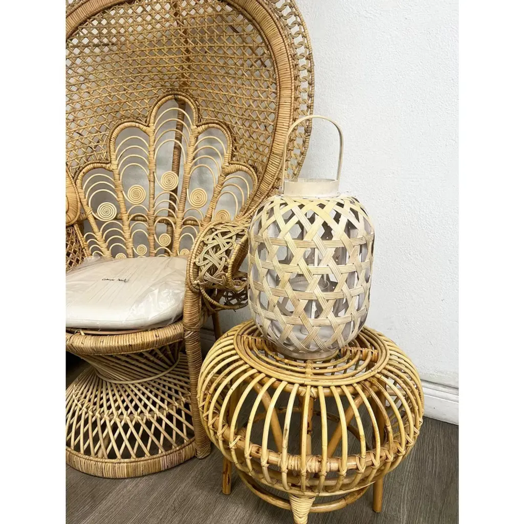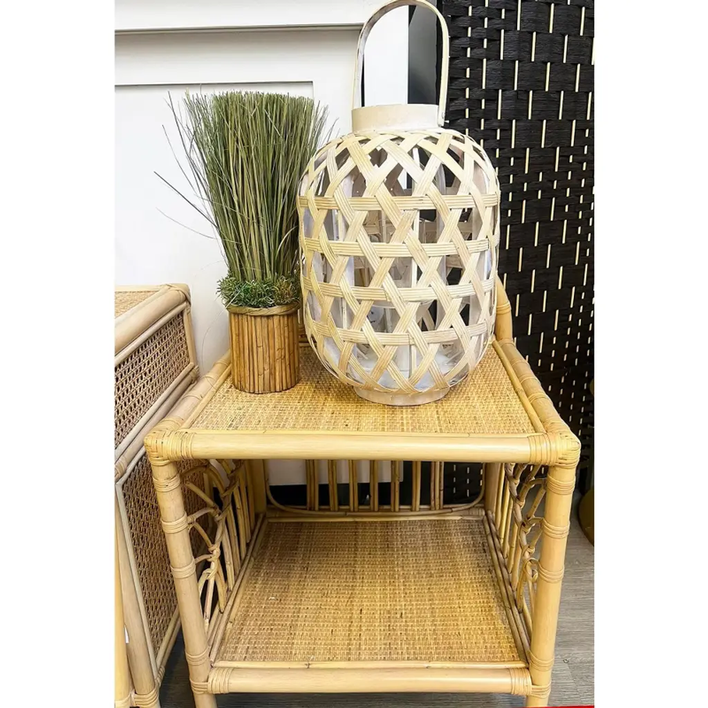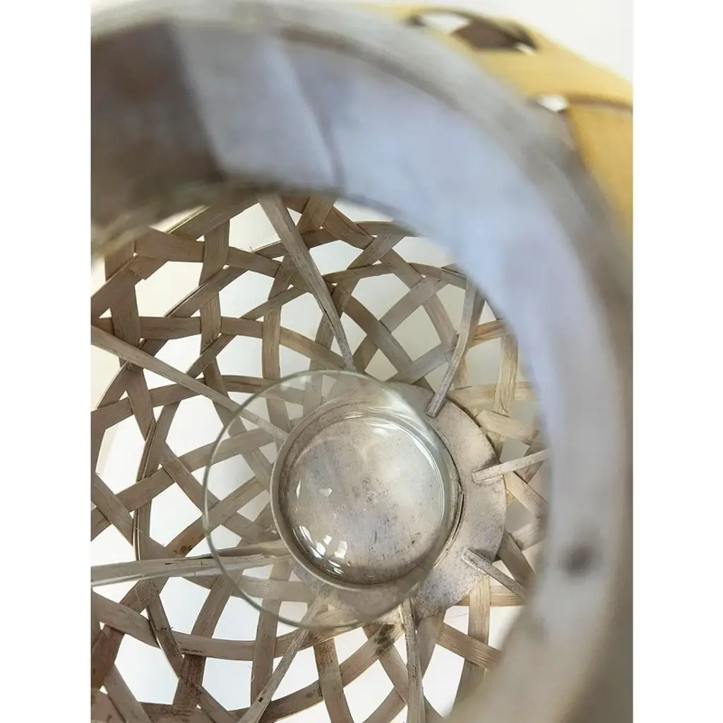 A chic and rustic tabletop lantern made from natural bamboo, featuring a rounded novelty design with a natural finish that lends a vintage, weathered appeal. It includes a clear glass candle holder and a sturdy handle for easy carrying or hanging. This black bamboo lantern combines natural beauty with rustic charm, making it a versatile and decorative addition to any space. The distressed finish and practical handle enhance its functionality and style, perfect for both indoor and outdoor settings.