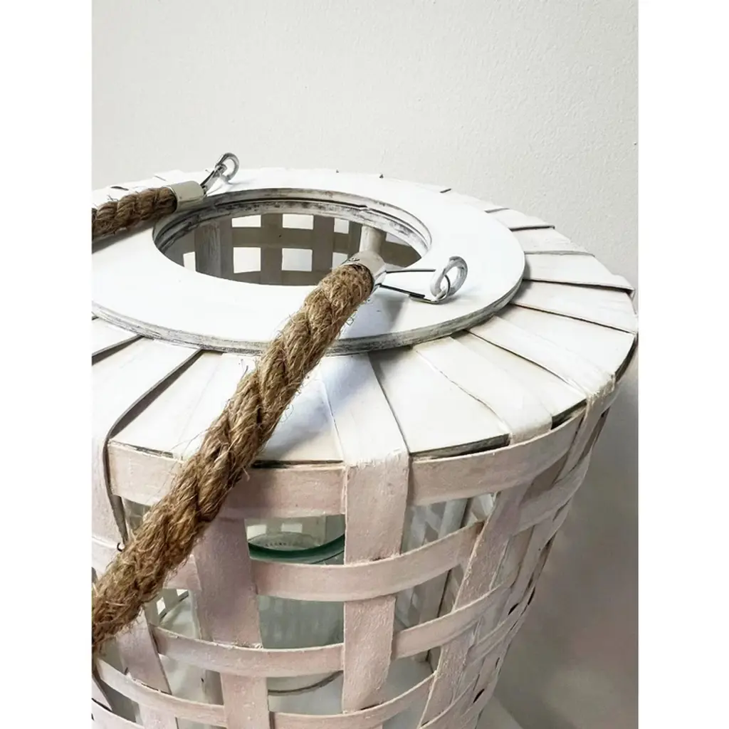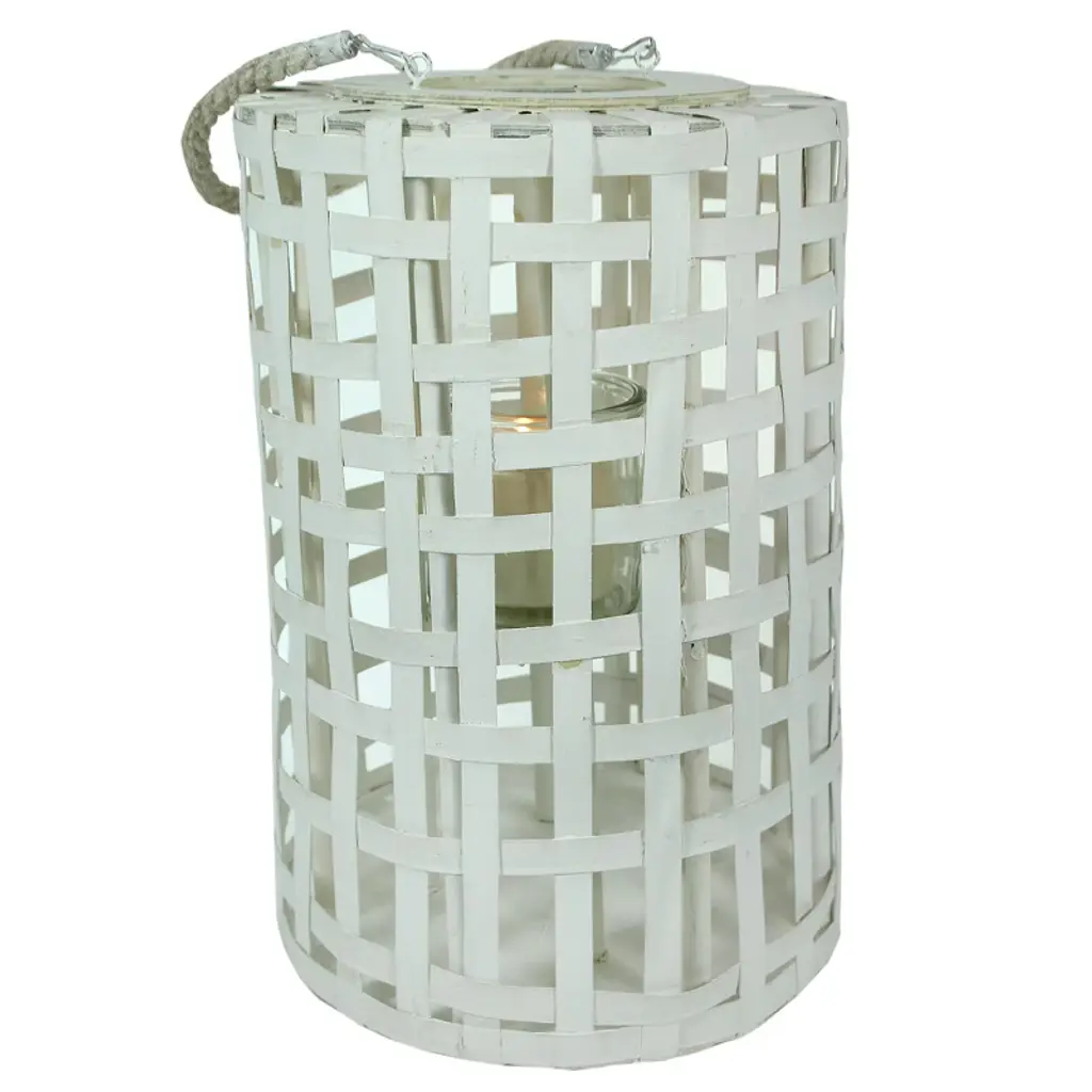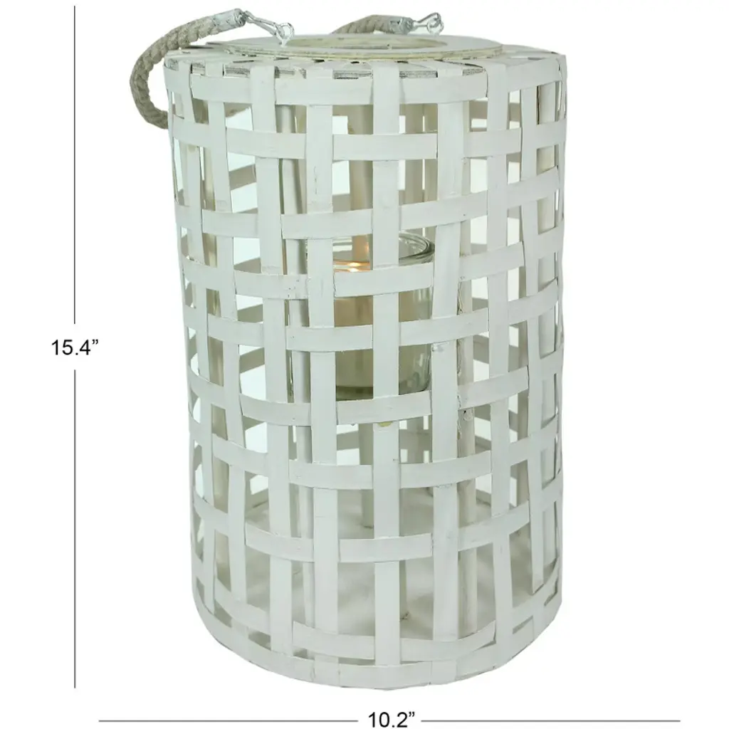 Essential Decor & Beyond 15.4" Tropical White Bamboo Hanging Lantern With Glass Candle Holder And Rope Handle Decorative Accent