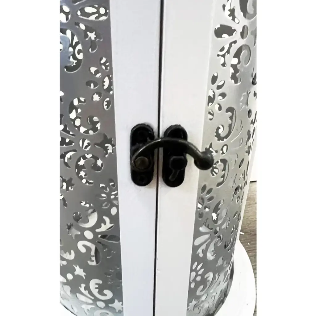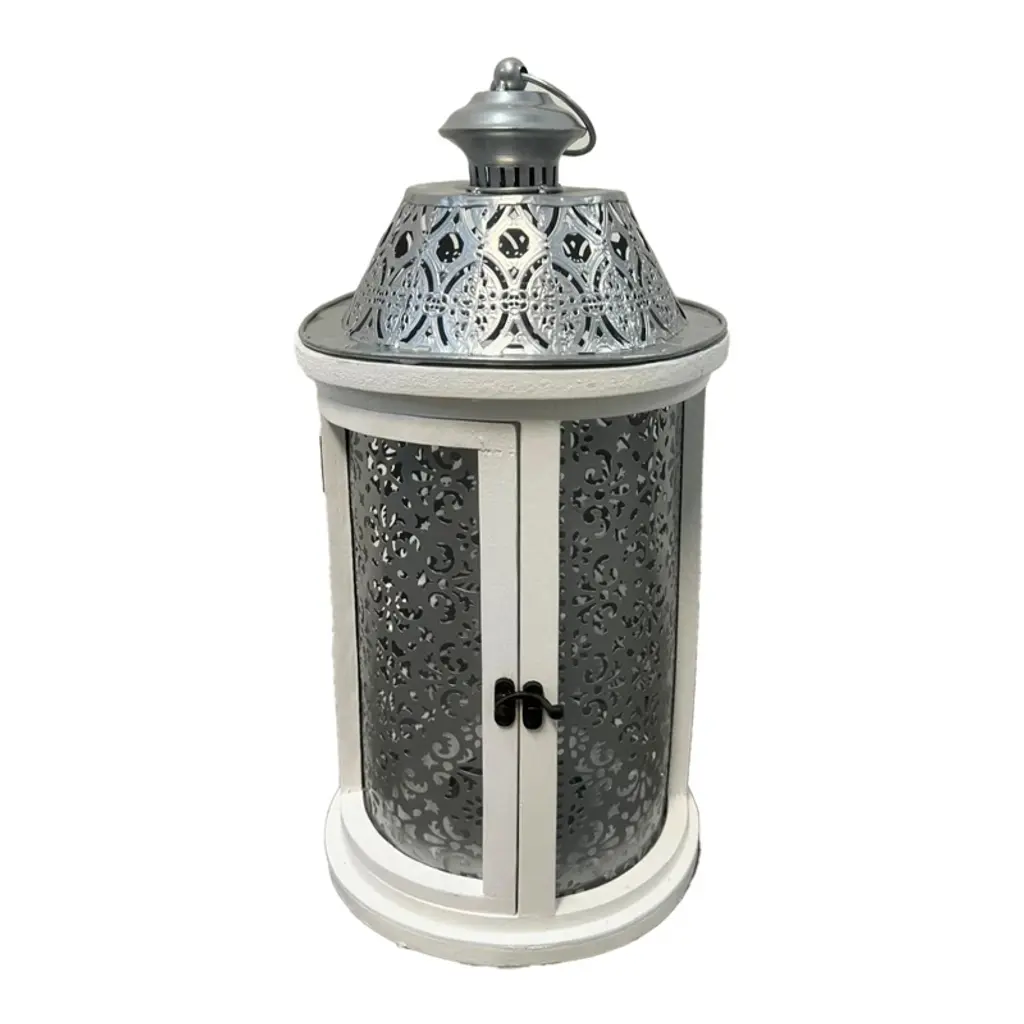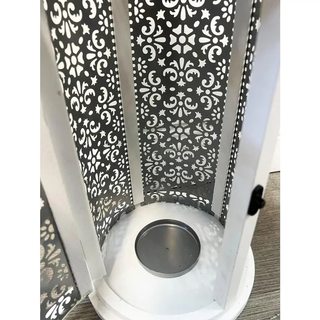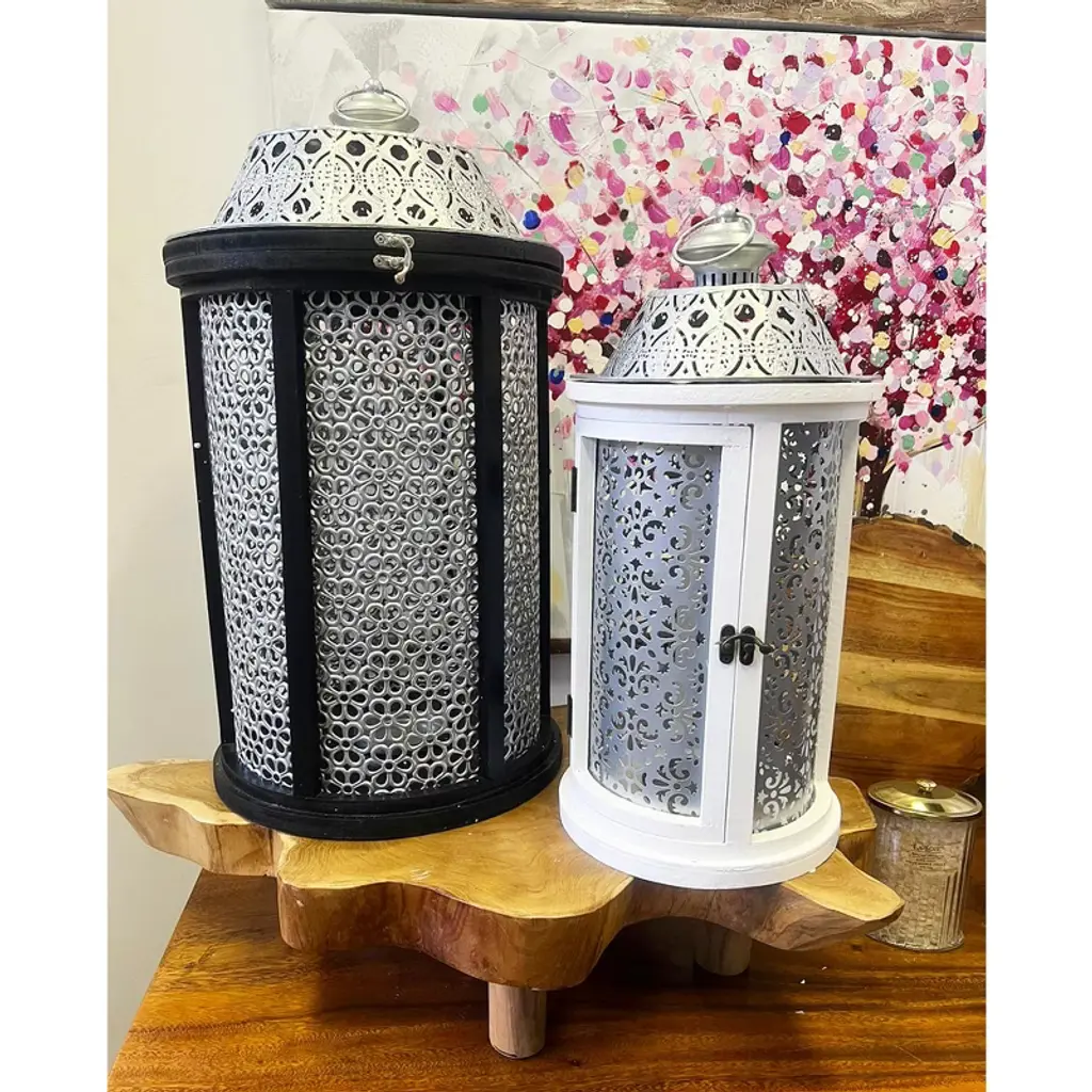 A set of two decorative lanterns, one black and one white, each with its own distinct vintage-inspired design and intricate metal detailing. This stylish duo provides a charming way to enhance your home or event with decorative lighting. The contrasting colors and unique designs create a visually striking set that complements a variety of décor styles. Sizes: Large (Black): 23.5" in height, 13" in diameter Small (White): 18.75" in height, 9" in diameter