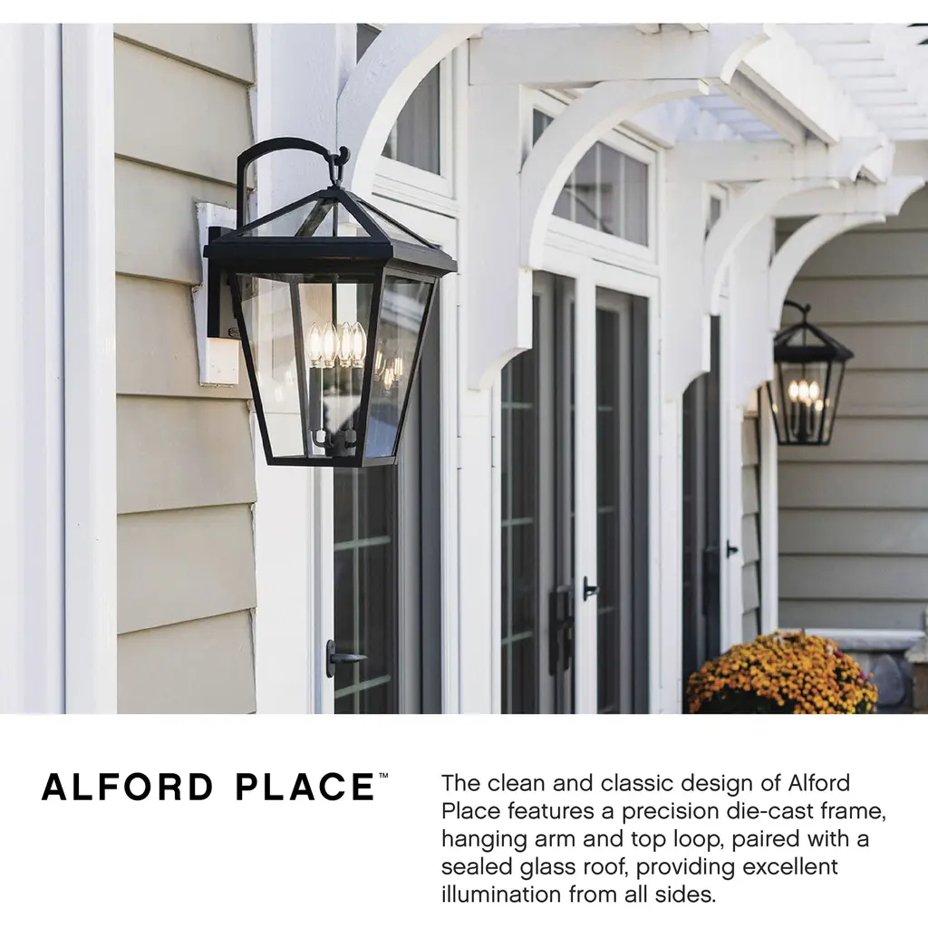 Our Estate Collections boast a breadth of fixtures defined by coordinating composition, enduring architecture, and time-honored craftsmanship, designed to meet the needs of expansive properties with extended outdoor living spaces. From the entrance of your driveway to the depths of your backyard, these collections provide cohesive design for stately exteriors. The clean and classic design of Alford Place features a precision die-cast frame, hanging arm and top loop, paired with a sealed glass roof, providing excellent illumination from all sides.