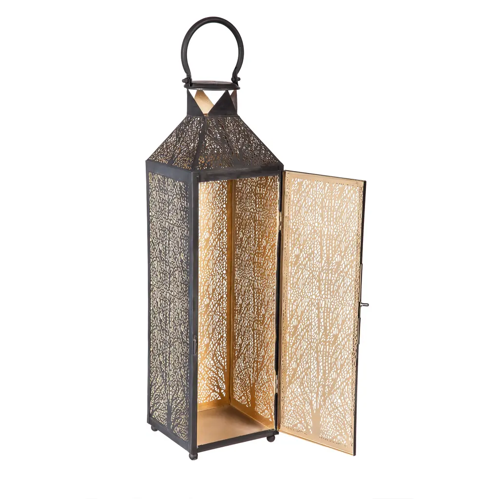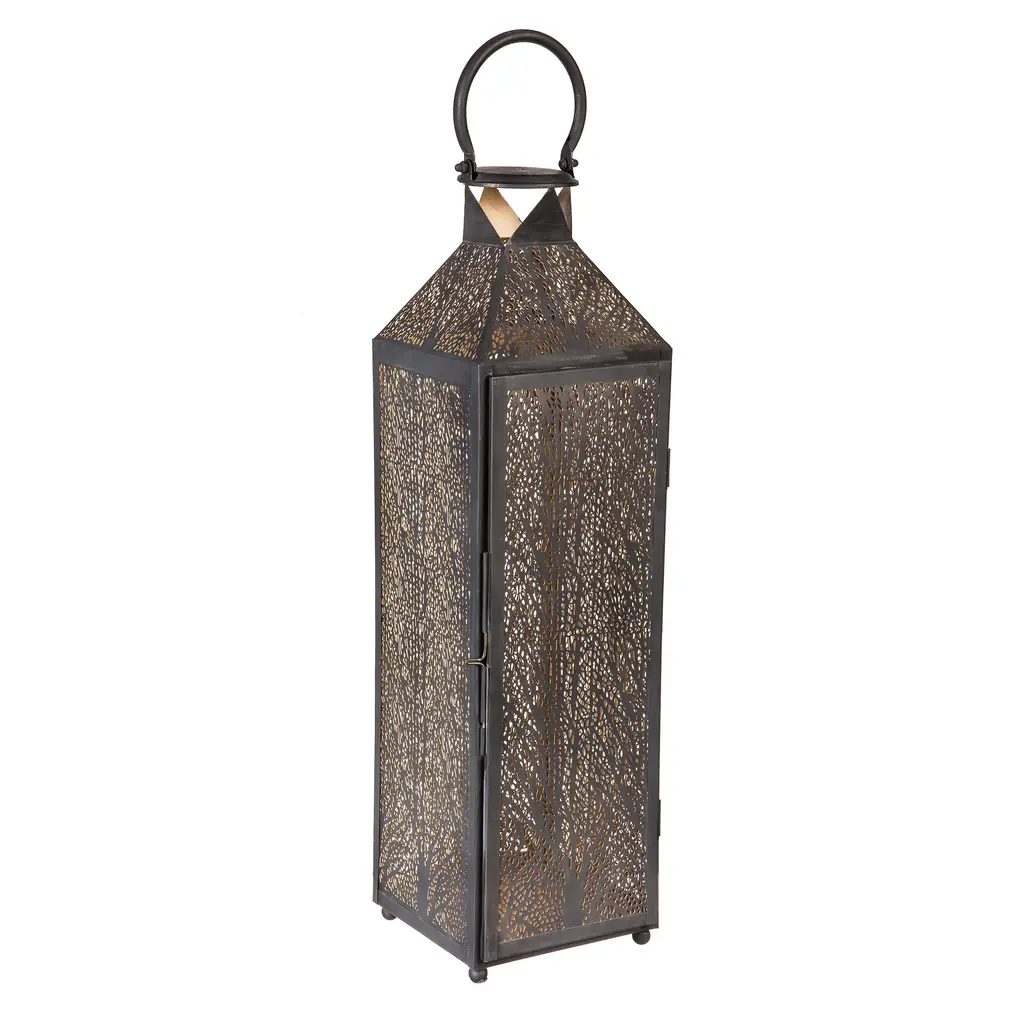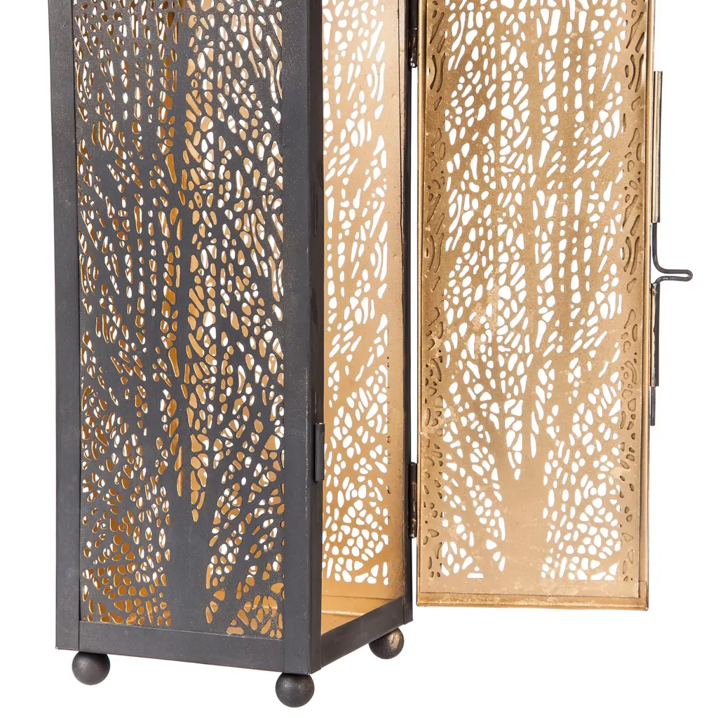 Add elegant illumination to your surroundings with this Set of Etched Metal Candle Lanterns. Handcrafted of metal with intricate etched tree designs, the duo includes one large and one small holder. The exterior is a blackened bronze perfect for a table top decoration, while the inside is a golden shade. When a candle (not included) is placed inside, the lanterns' intricately cut design comes to life with an added glow from the contrasting inside color. Small ball feet elevates the design; side door opens for easy access. Use with real-flame or LED pillar candles, or fill with battery-operated twinkle string lights (not included). Use indoors or outside in a covered/protected area.