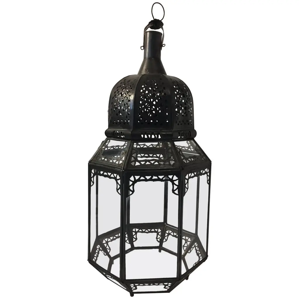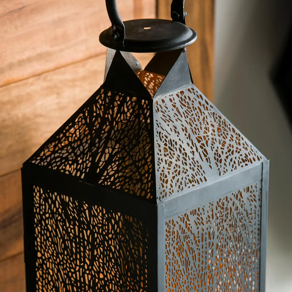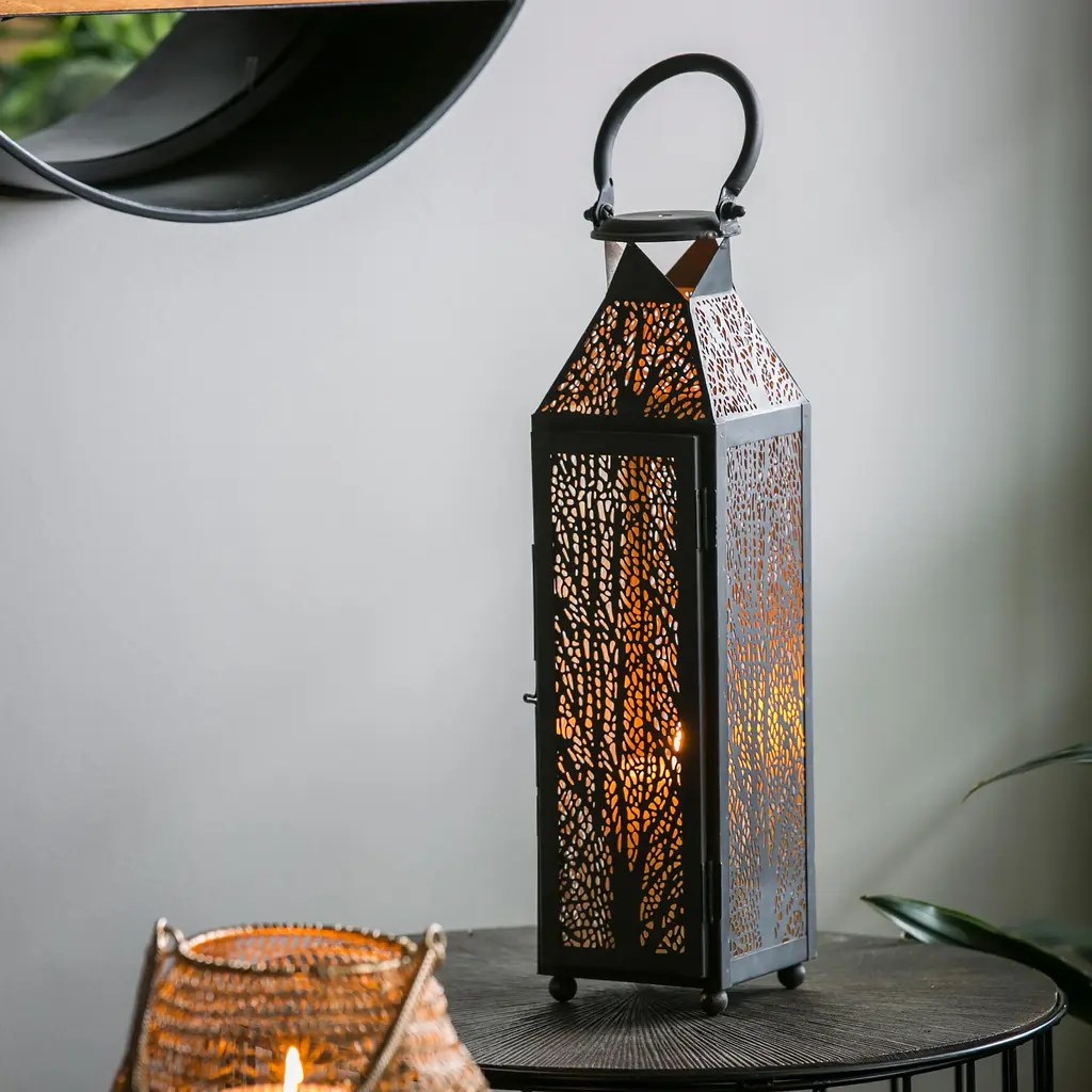 Add elegant illumination to your surroundings with this Set of Etched Metal Candle Lanterns. Handcrafted of metal with intricate etched tree designs, the duo includes one large and one small holder. The exterior is a blackened bronze perfect for a table top decoration, while the inside is a golden shade. When a candle (not included) is placed inside, the lanterns' intricately cut design comes to life with an added glow from the contrasting inside color. Small ball feet elevates the design; side door opens for easy access. Use with real-flame or LED pillar candles, or fill with battery-operated twinkle string lights (not included). Use indoors or outside in a covered/protected area.