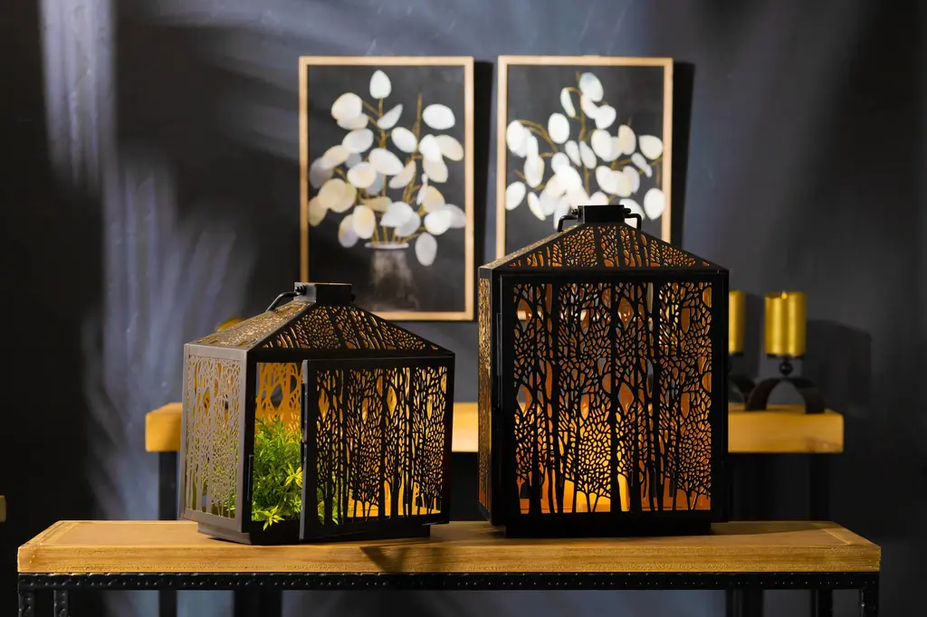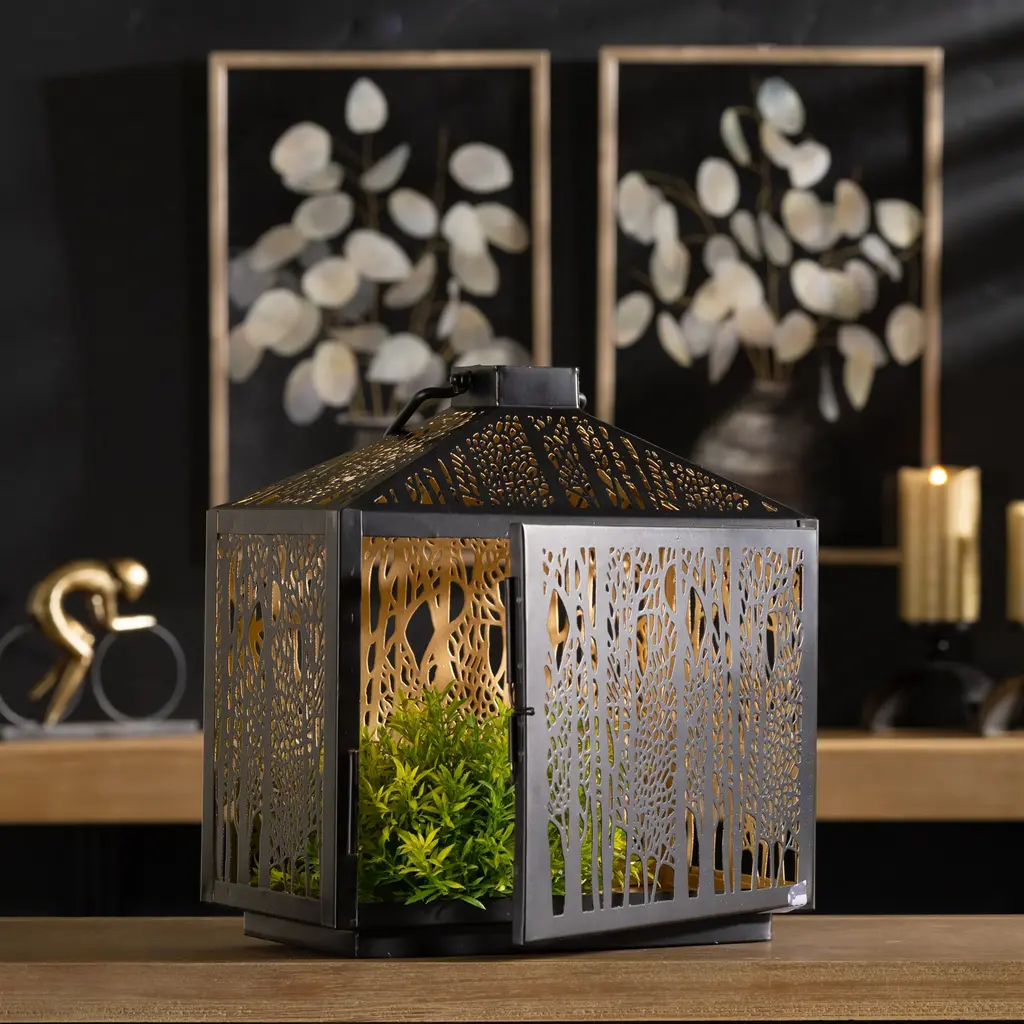 Beautify your home with this stunning Forest Cut Metal Lantern. Measuring 12" tall, this piece is sure to add an elegant and contemporary touch of style to your living space. The classic black finish paired with the laser-cut rustic forest design and chic gold inside accent is the perfect combination to make a timeless piece. The quality iron metal composition is sure to endure for seasons to come. Great for both every day and holiday decor, just add a set of real wax or LED candles to illuminate the display.