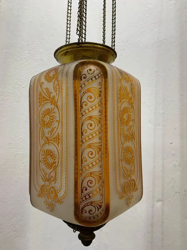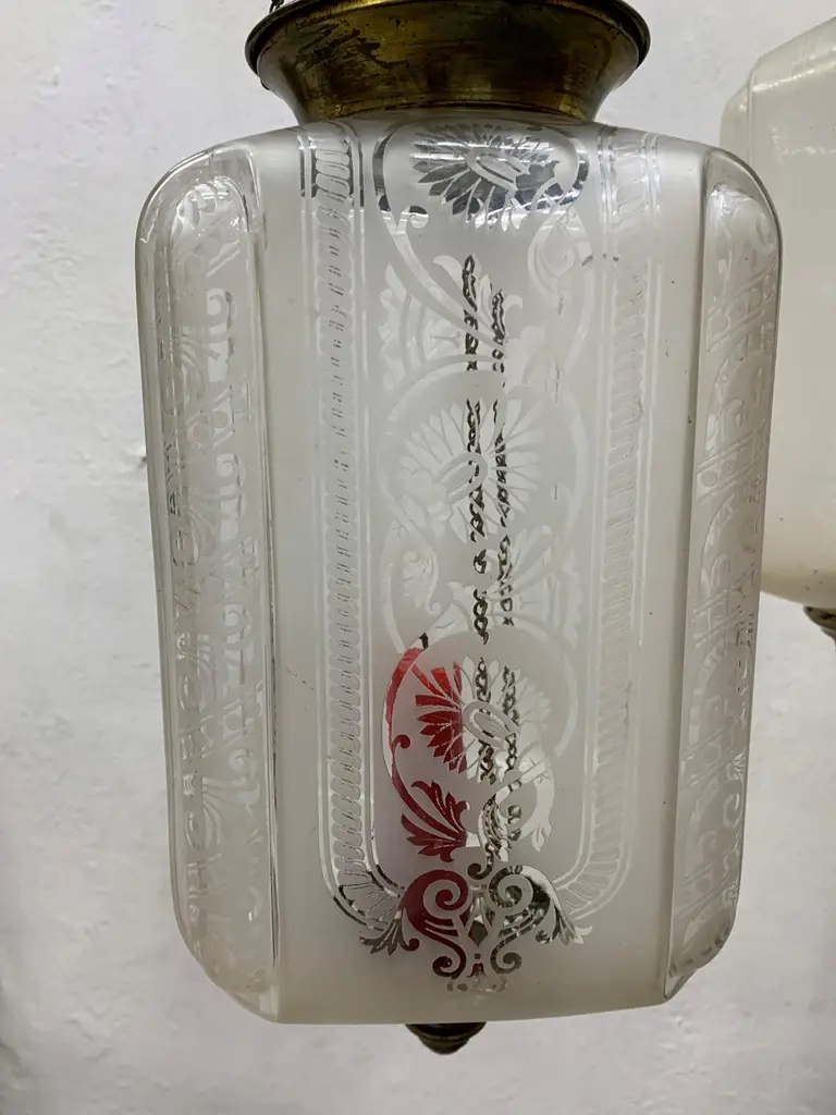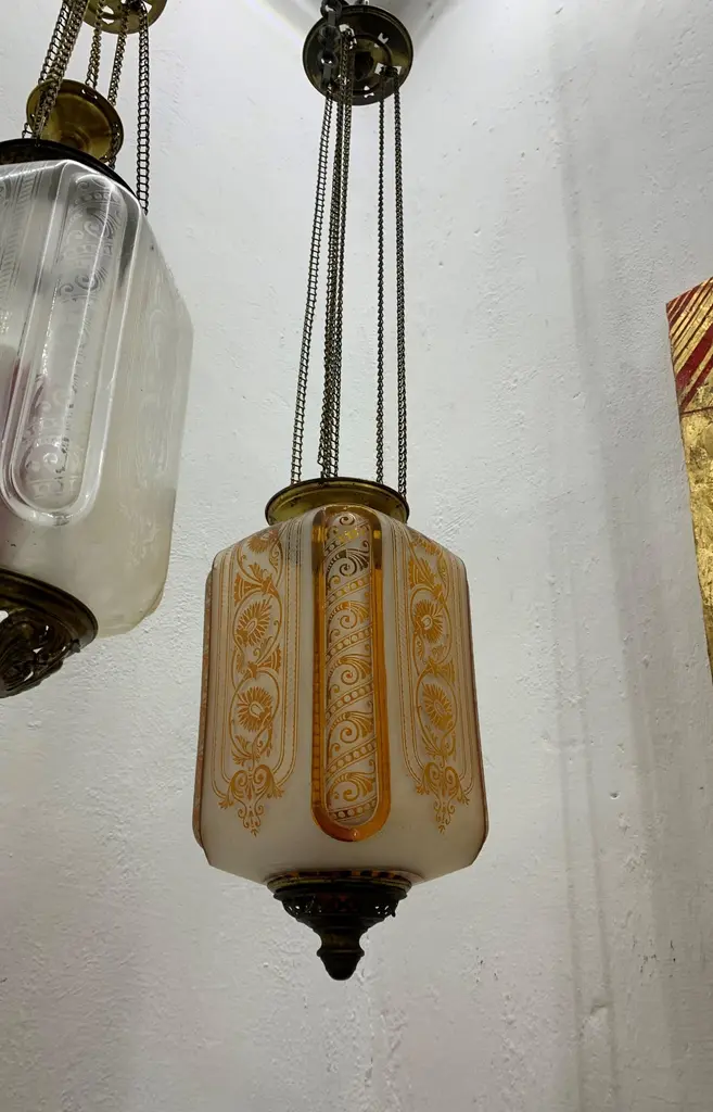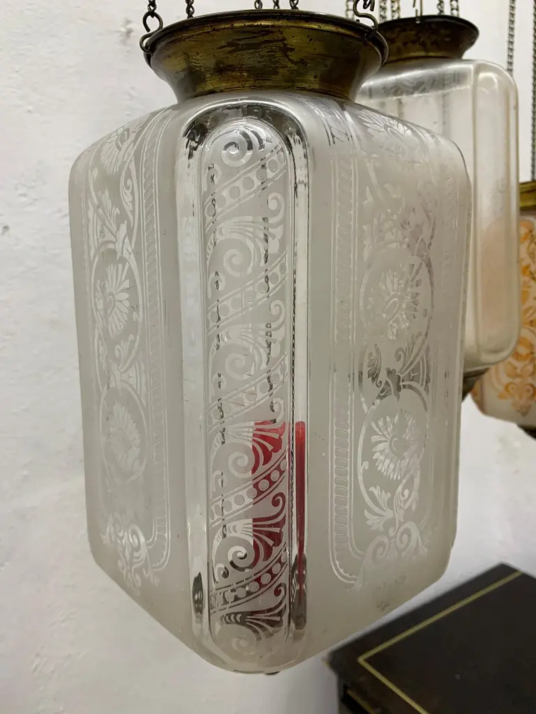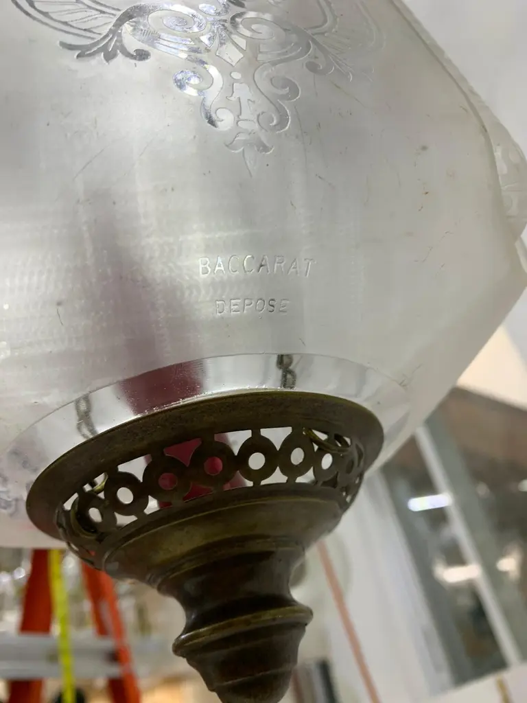 Late 19th or early 20th century glass Lanterns by Baccarat France, marked Baccarat Depose.Produced in an art nouveau style with palmettes and scrollsIt can hold a candle as depicted (we recommend using battery operated candles for safety issues) or an oil lantern which can be procured if desired by the client at an additional cost.These work on a pulley system in order to be able to replace the candle & oil.The glass shade alone is 25 cm high and 16 cm wide.