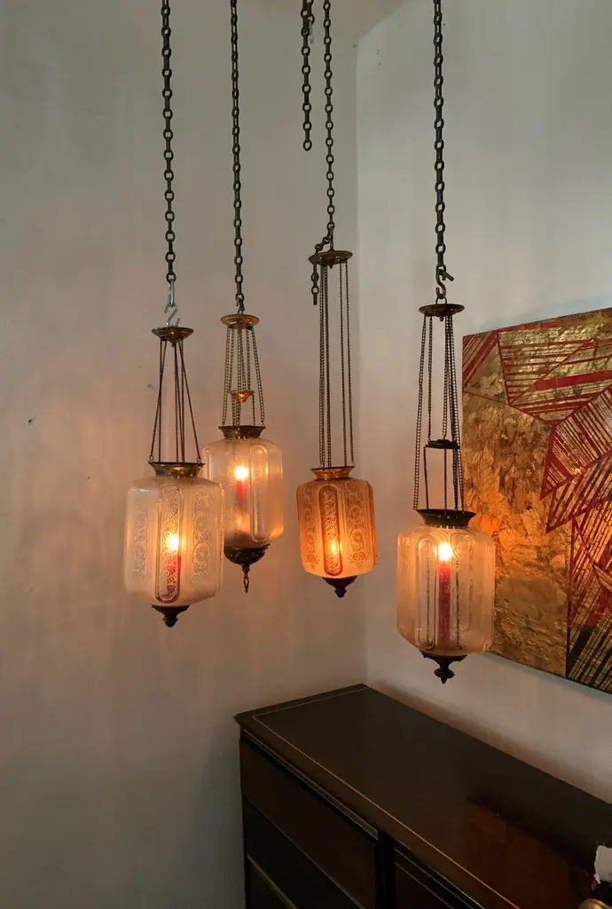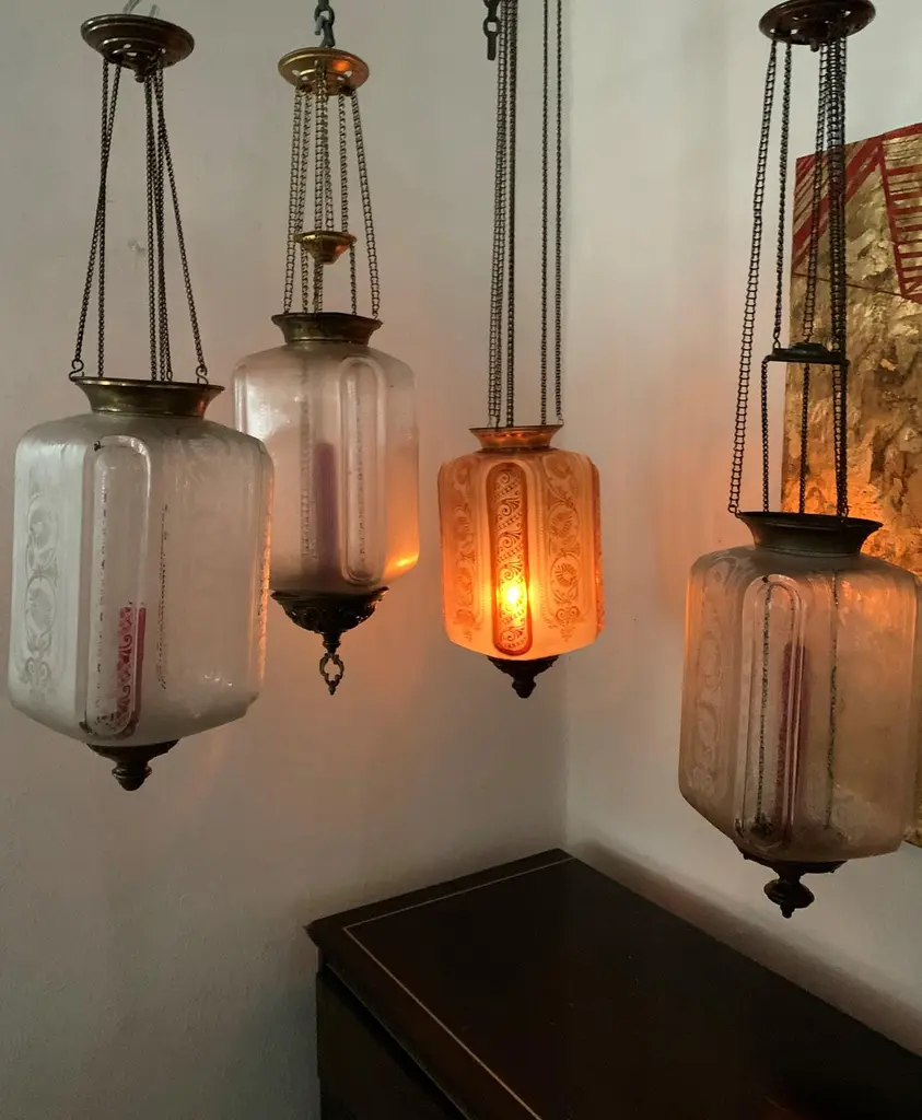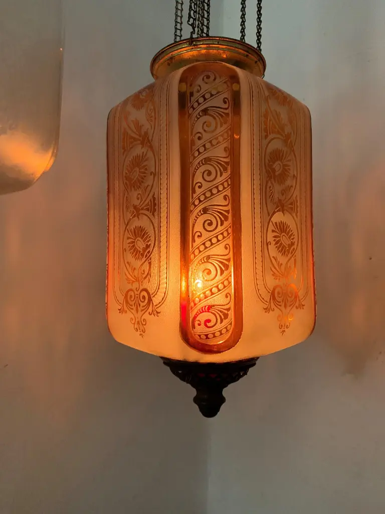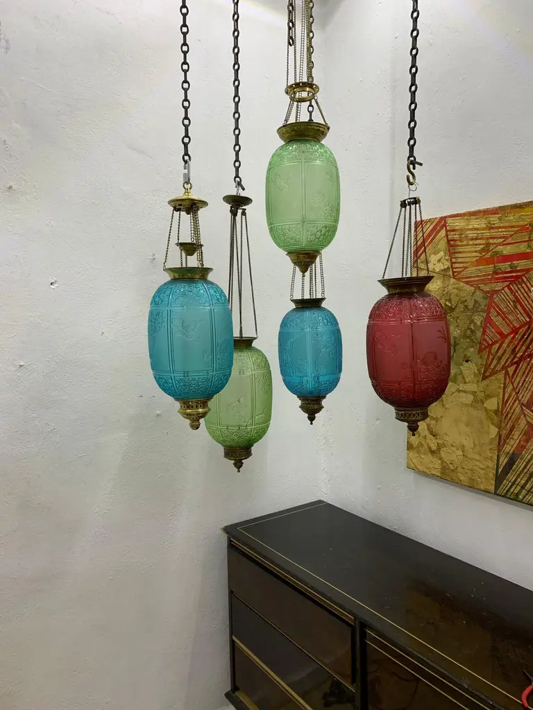 Late 19th or early 20th century glass Lanterns by Baccarat France, marked Baccarat Depose.Produced in an art nouveau style with palmettes and scrollsIt can hold a candle as depicted (we recommend using battery operated candles for safety issues) or an oil lantern which can be procured if desired by the client at an additional cost.These work on a pulley system in order to be able to replace the candle & oil.The glass shade alone is 25 cm high and 16 cm wide.