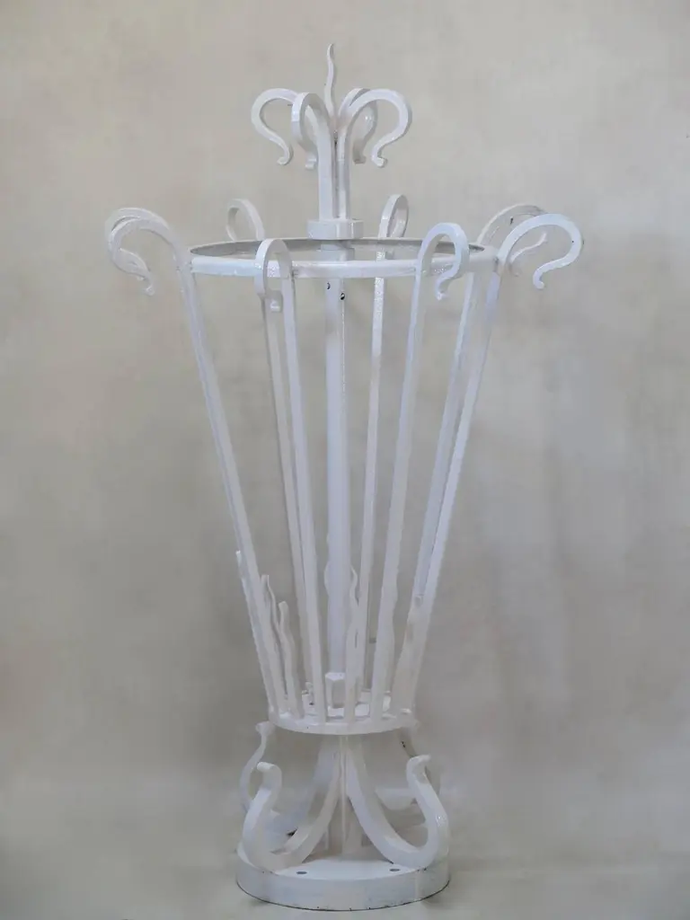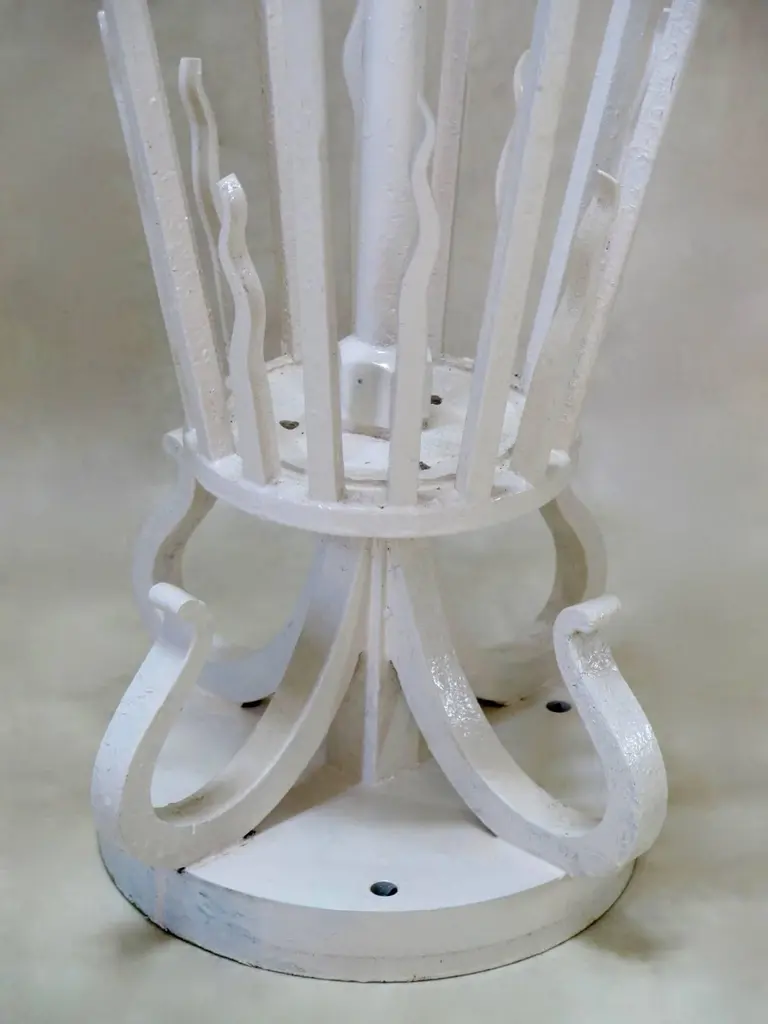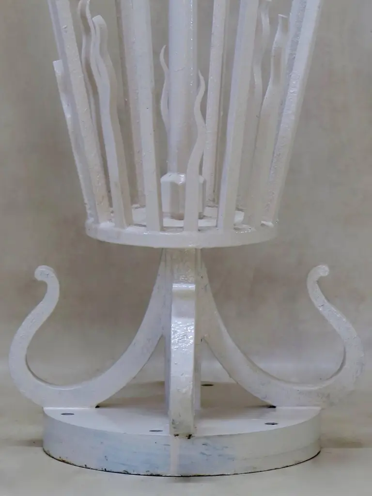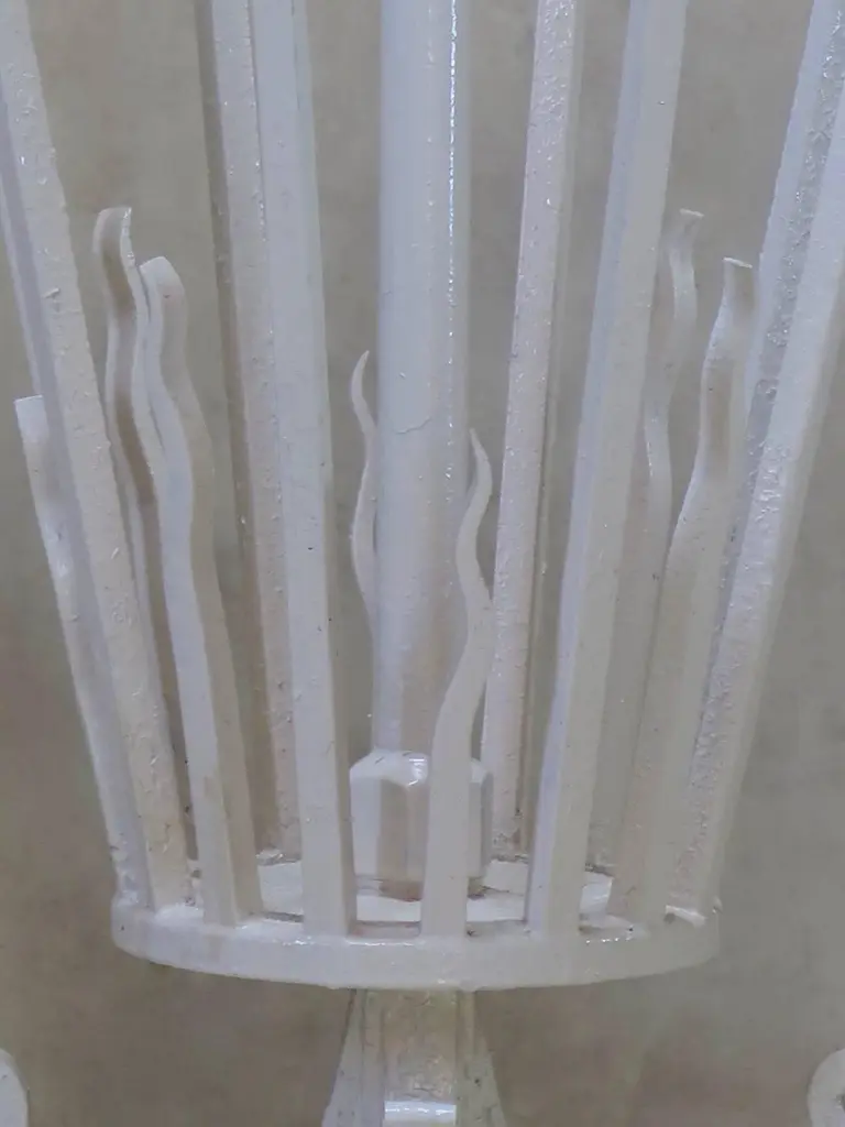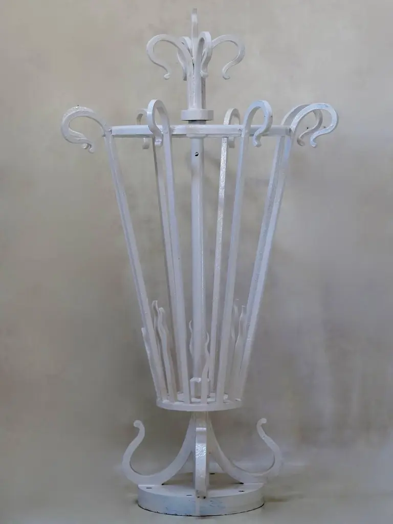 Tall and elegant wrought iron lantern, originally designed to be placed atop a masonry column. Very heavy. The base is pierced with holes to secure into place. Topped with stylized fleur-de-lys finials. The central shaft is hollow, to thread wiring through. The light bulbs would be placed towards the top of the shaft. Alternatively, would make a very chic umbrella Stand! Three available.