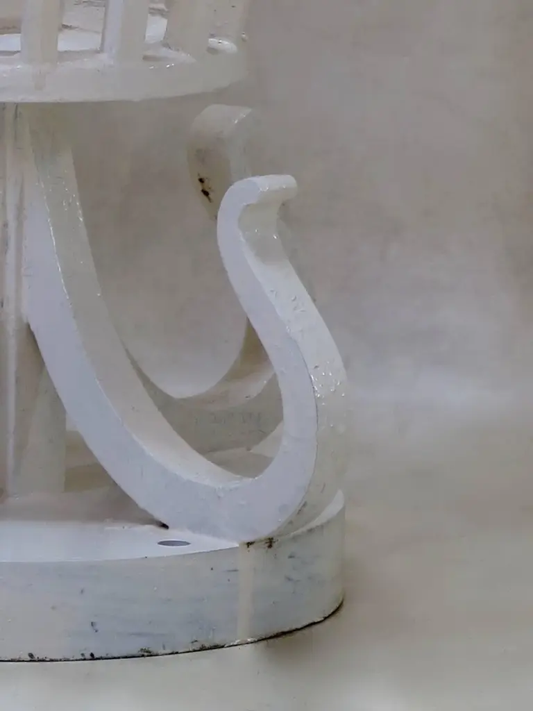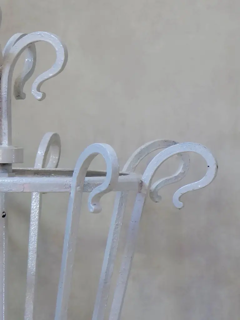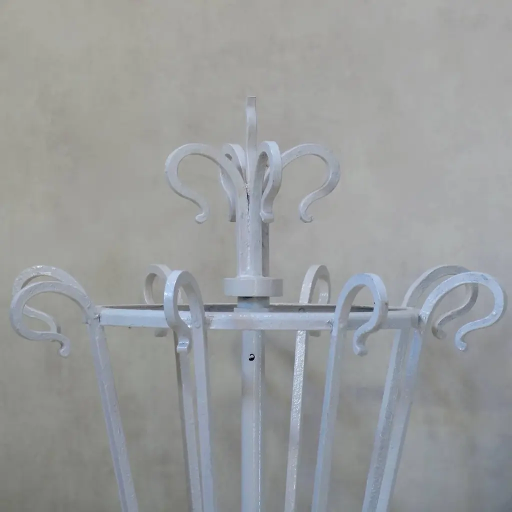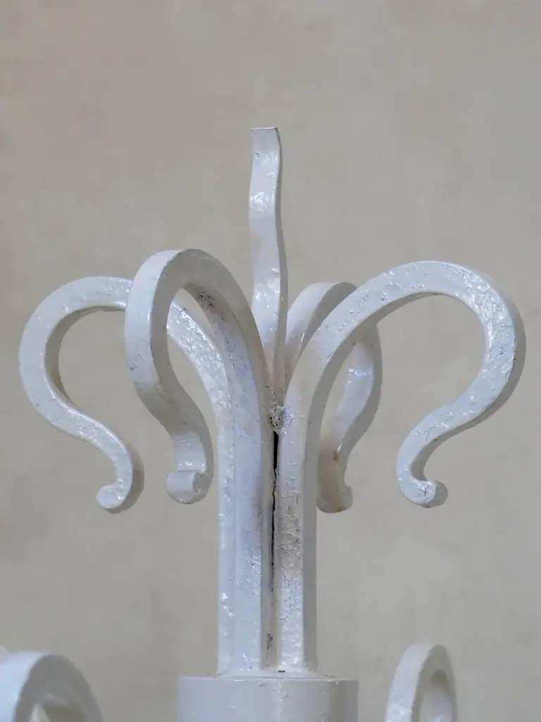 Tall and elegant wrought iron lantern, originally designed to be placed atop a masonry column. Very heavy. The base is pierced with holes to secure into place. Topped with stylized fleur-de-lys finials. The central shaft is hollow, to thread wiring through. The light bulbs would be placed towards the top of the shaft. Alternatively, would make a very chic umbrella Stand! Three available.