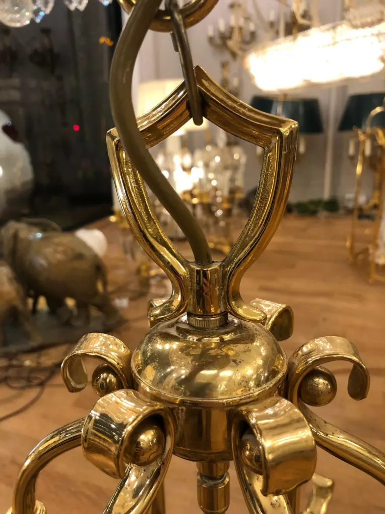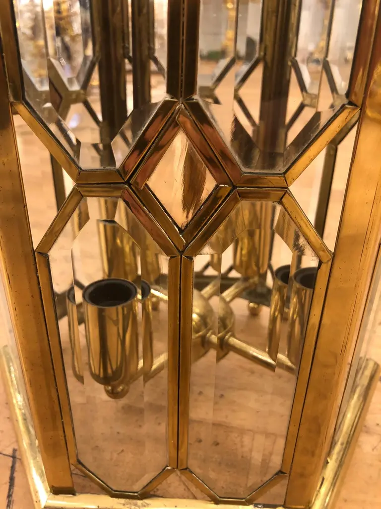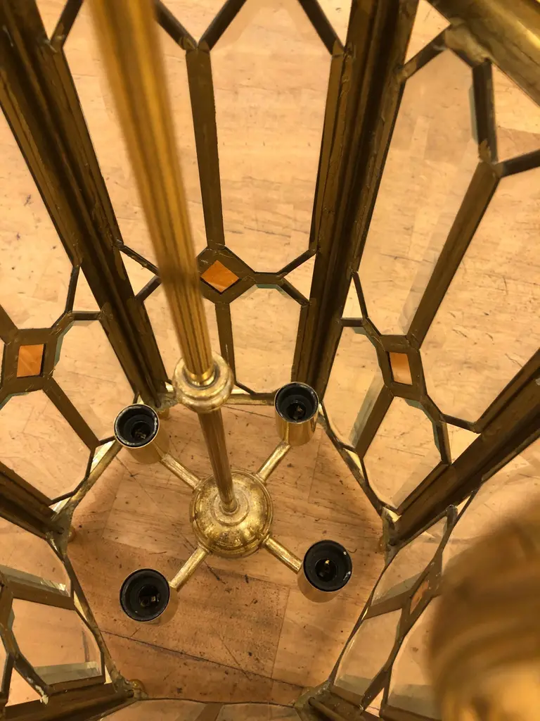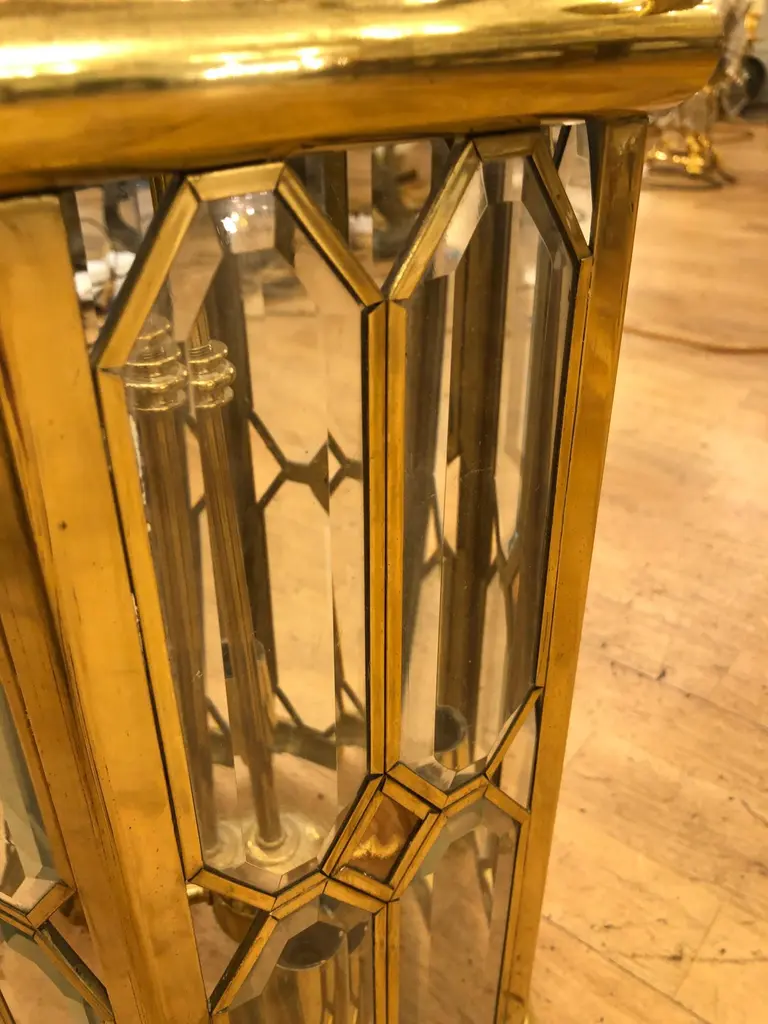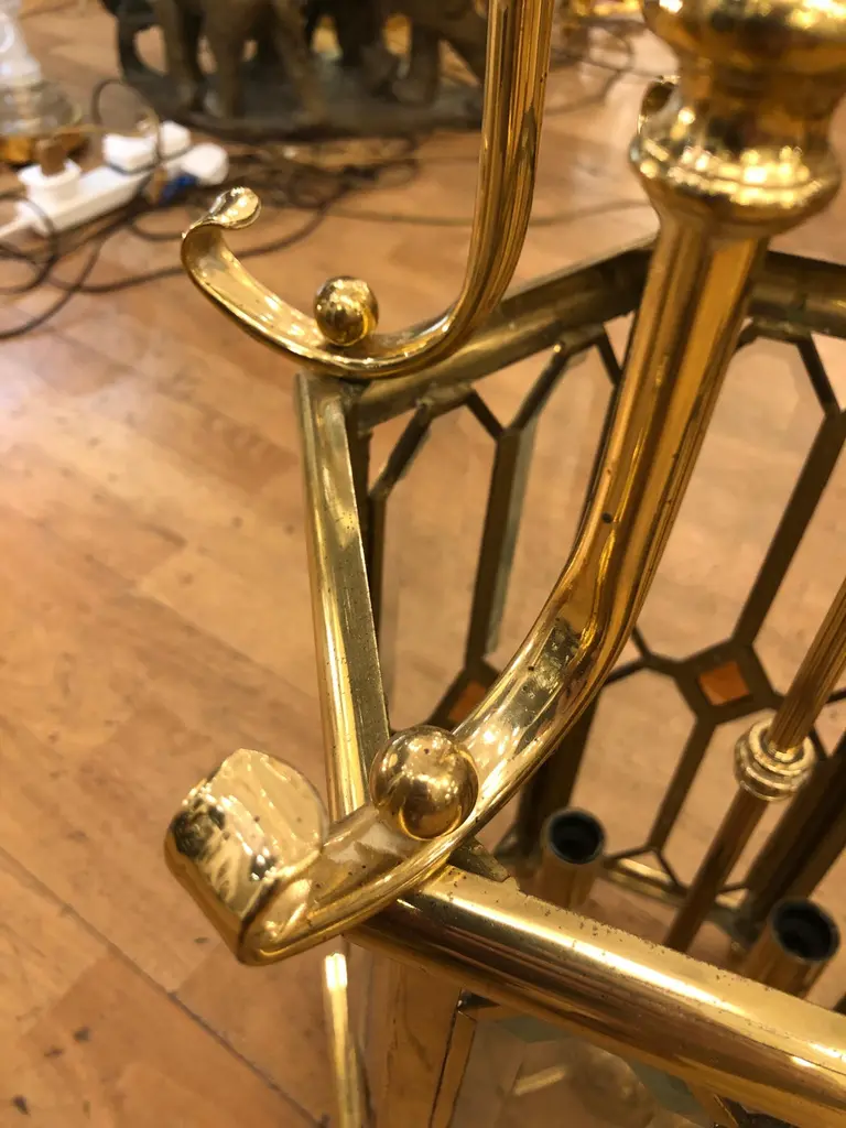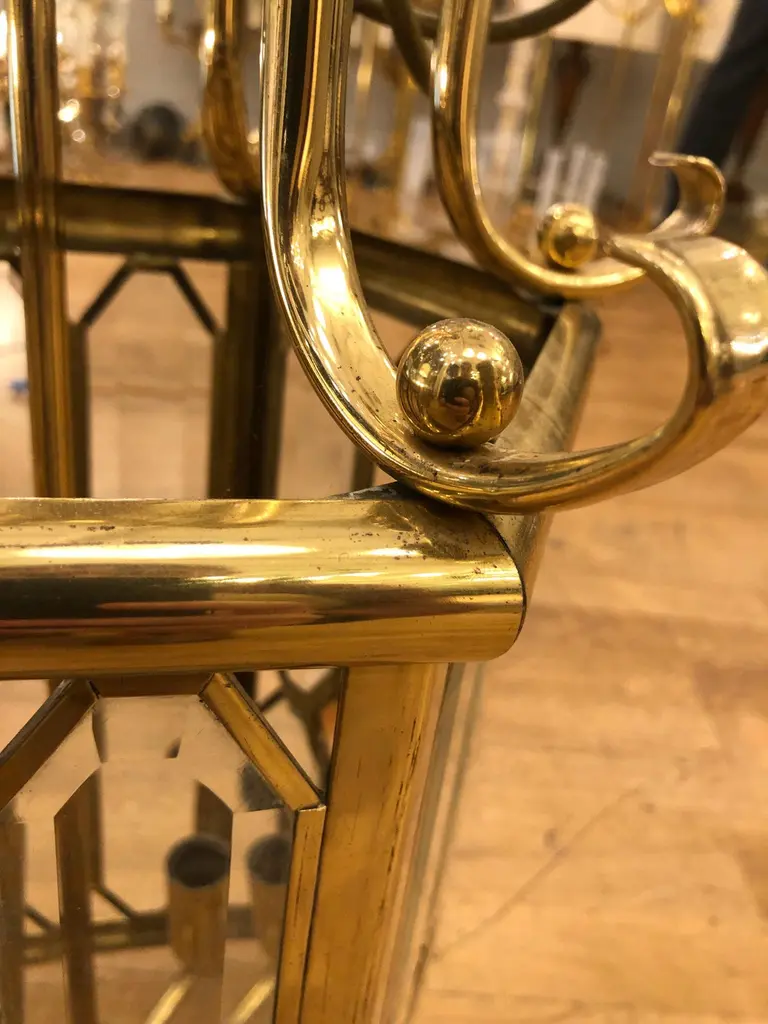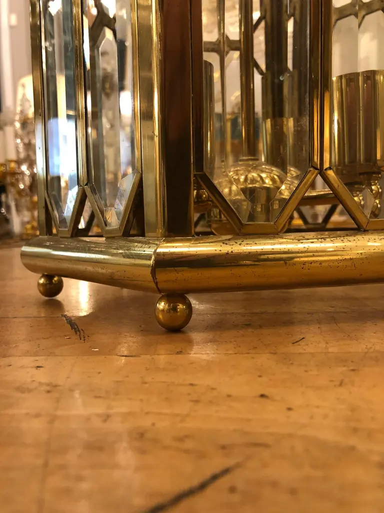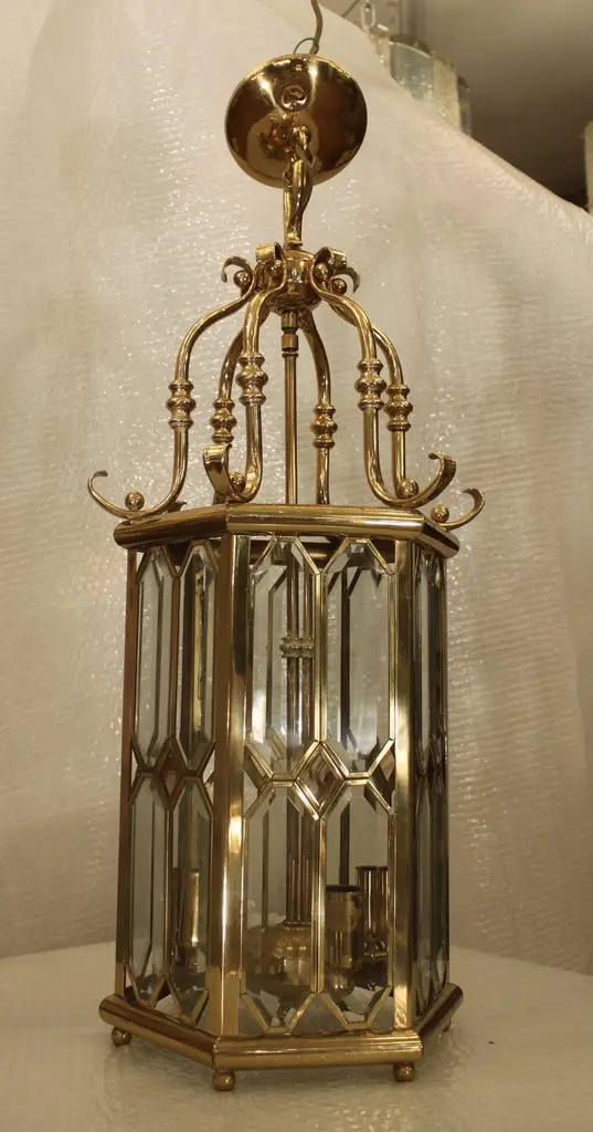 A beautiful brass and glazed lantern. Part of a set of three matching lanterns. NOW ONLY 1 AVAILABLE AS ONE SOLD. Price is for one lantern only. The six sided lantern features 4 glass panels in each face with a diamond central panel and open triangular corners, base, top and side panels. Set on 6 ball feet and suspended above with 6 curved arms rising to a central ball from which hangs the lighting spindle that descends to hold 4 internal suspended bulbs. Above the ball is hanger attached to integral brass ceiling mount. Newly wired for UK use but can be rewired at no additional cost for US spec. Some faded patination as might be expected on an article of this age.