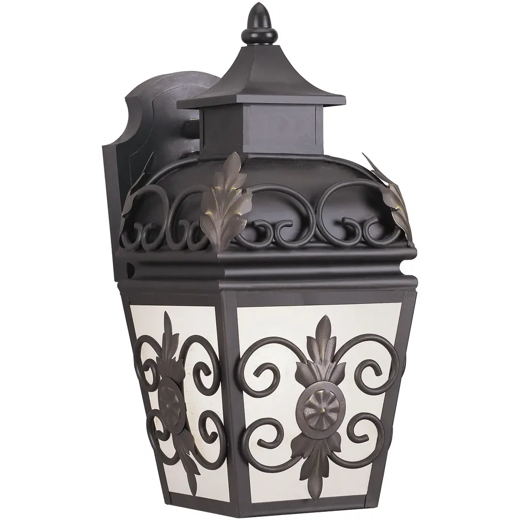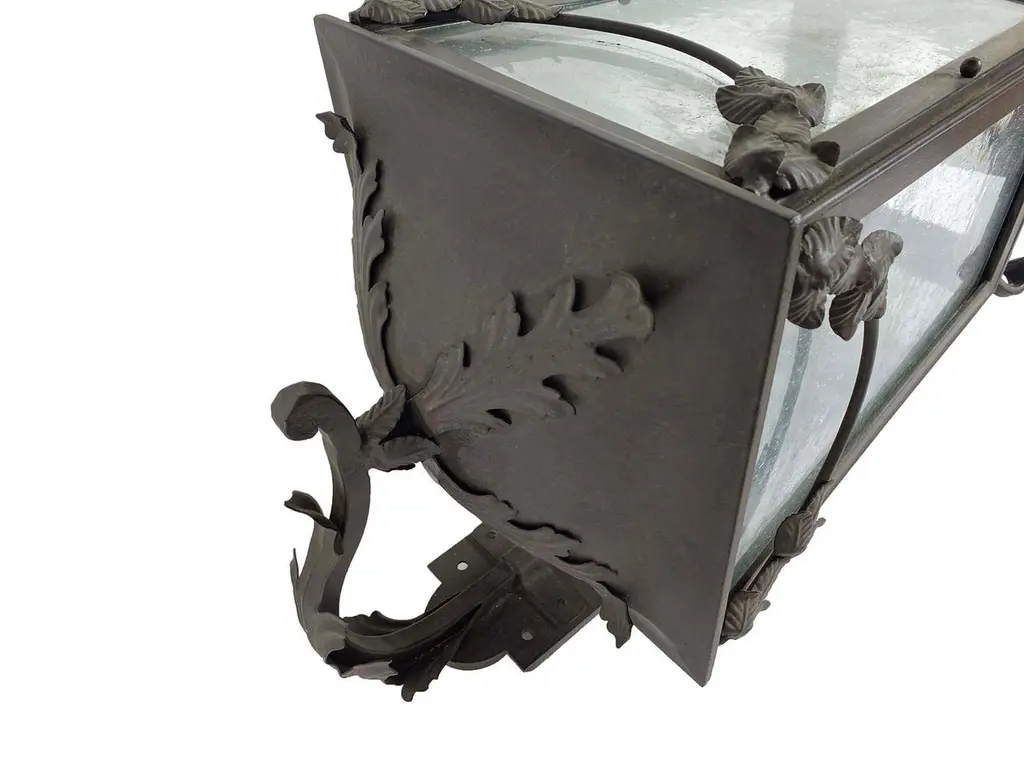 The Garland wrought iron wall bracket lantern will be at home on your French Country house. The delicate leaves in the garland sweep and acanthasas leaves on the bracket make this French style lantern a winner. Measure: 12" x