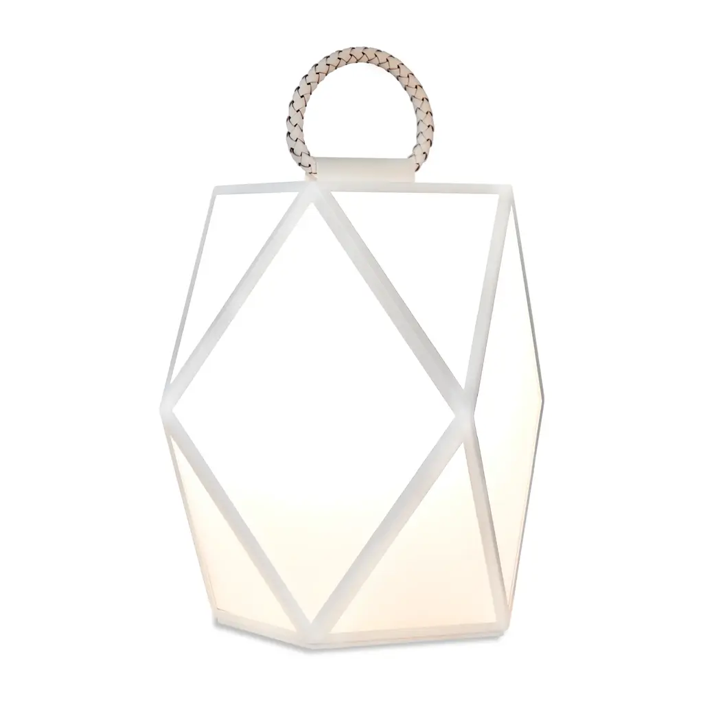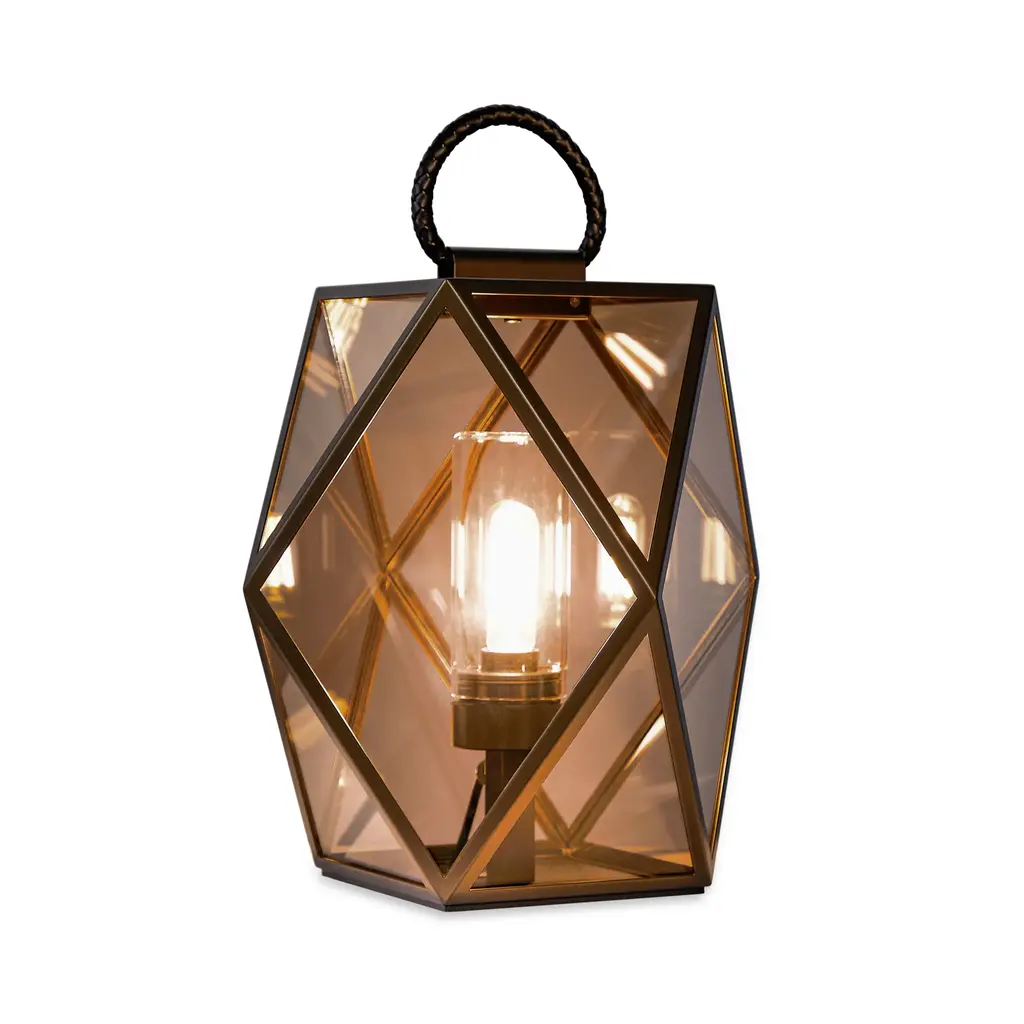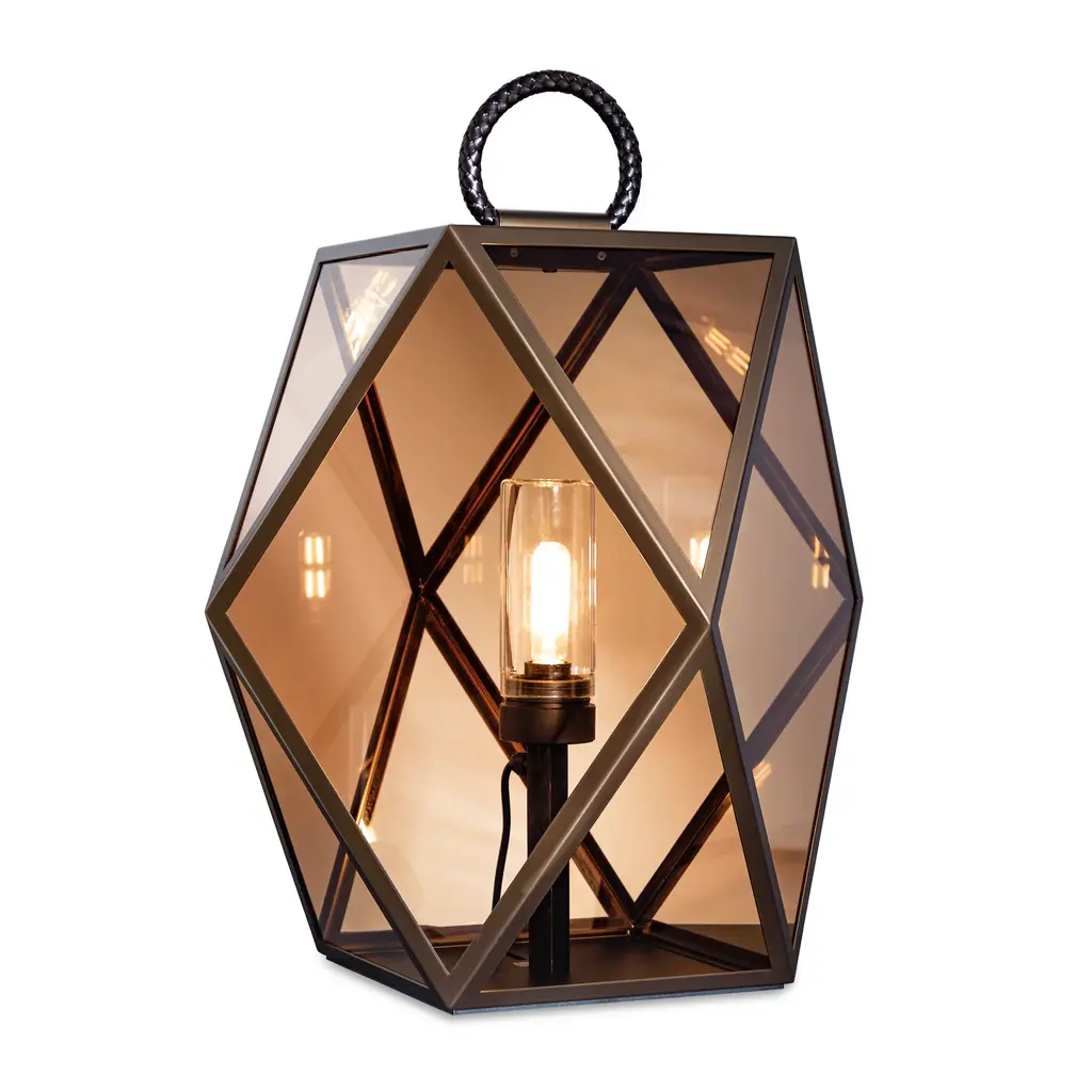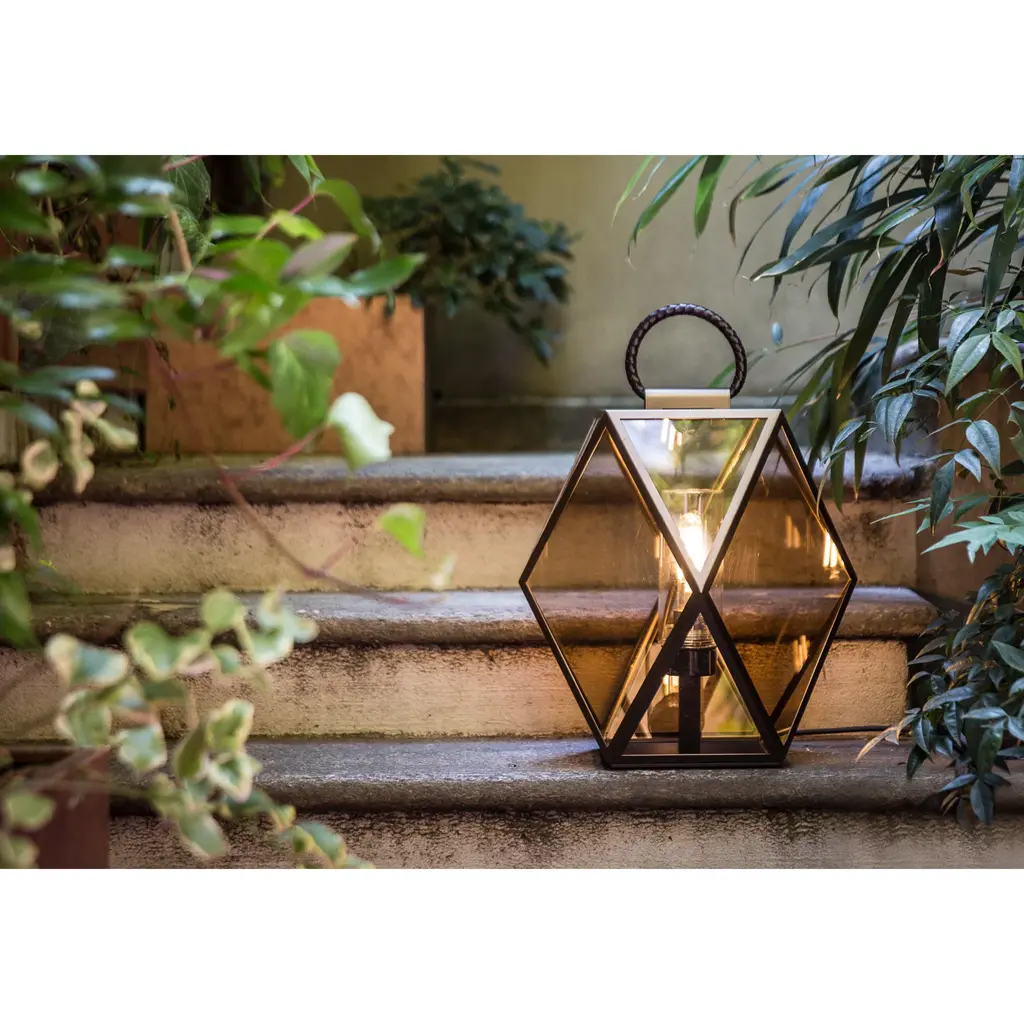 Elevate your outdoor space with the Geometrical Glass Outdoor Lantern from Contardi Muse. This lantern boasts a distinctive design with a braided leather handle, adding a touch of elegance. Its rechargeable battery allows for versatile use in both commercial and maritime settings.