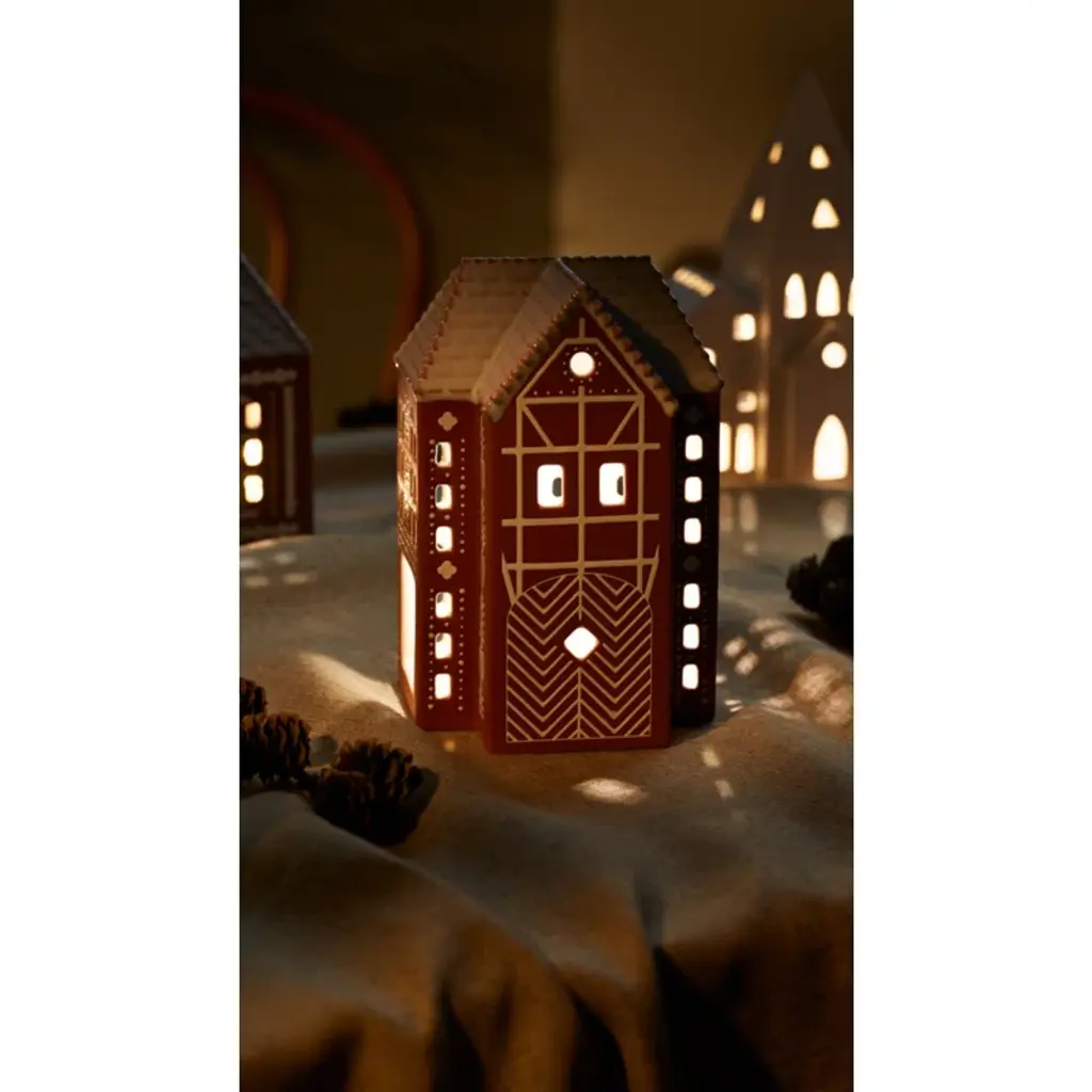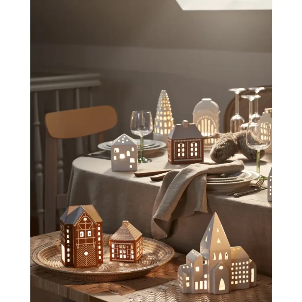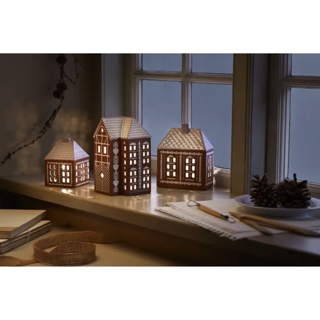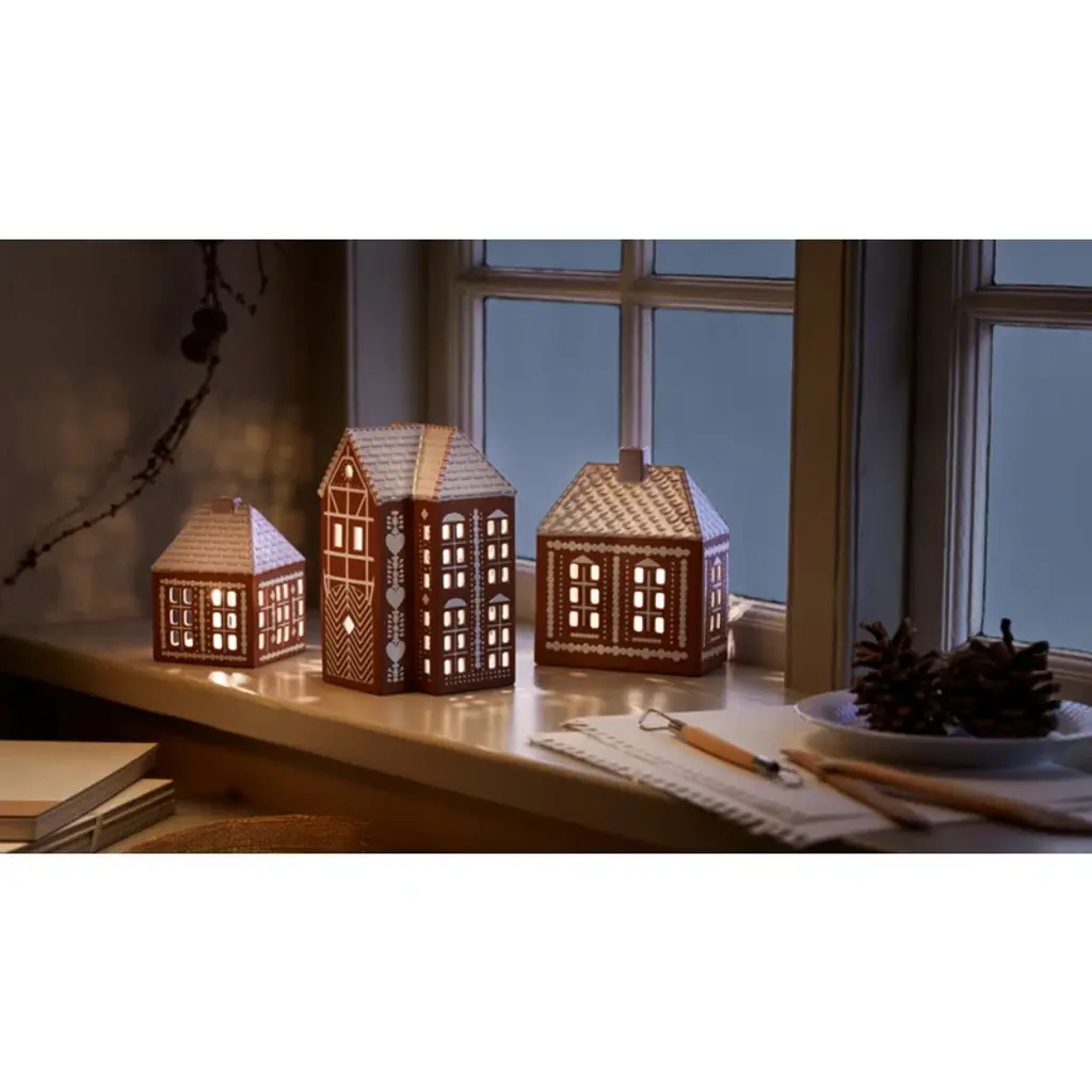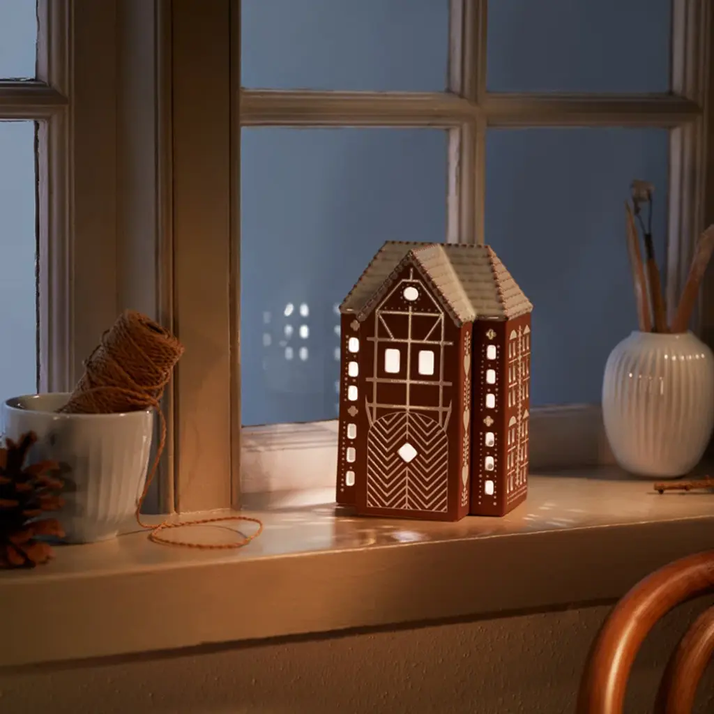 Kahler Gingerbread is a series of handmade gingerbread houses, where Kahler's ceramic origins and the traditional Danish Christmas have been put into a common design formula. With a height of 17 cm, this gingerbread house exudes Christmas, charm and traditions and is the largest of the gingerbread houses. The front of the house is covered with a fine timber-framed pattern, a round and beautifully decorated window, and a large gate that invites you indoors for plenty of authentic warmth and coziness. The sides of the lighthouse are decorated with large white hearts to symbolize the season of goodwill. Create a cozy Christmas landscape by placing little elves around the houses, or use the houses individually as handmade design elements. The shiny and tactile glaze and rustic, unglazed ceramic, will look beautiful on display and spread plenty of Christmas cheer. The Gingerbread lighthouses have a brown, matt exterior, reminiscent of gingerbread dough, and are decorated with white, shiny decorations and white roofs that look like icing. An important detail is that the gingerbread houses are glazed white on the inside to reflect the warm glow from the tealights. All sizes are carved by hand, and the light from the houses creates playful clusters of light and shadow wherever you place them.